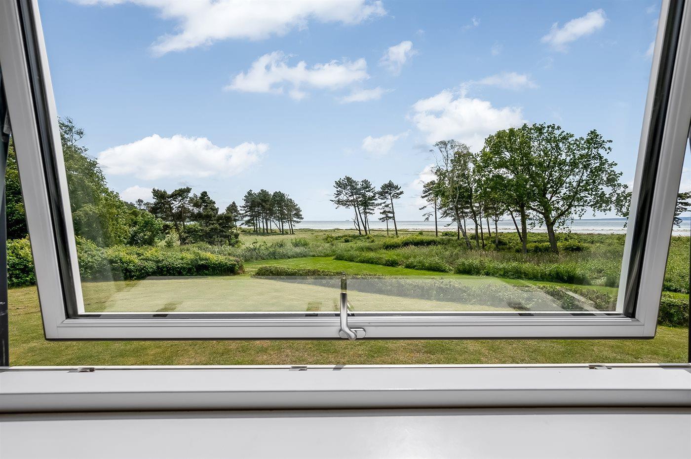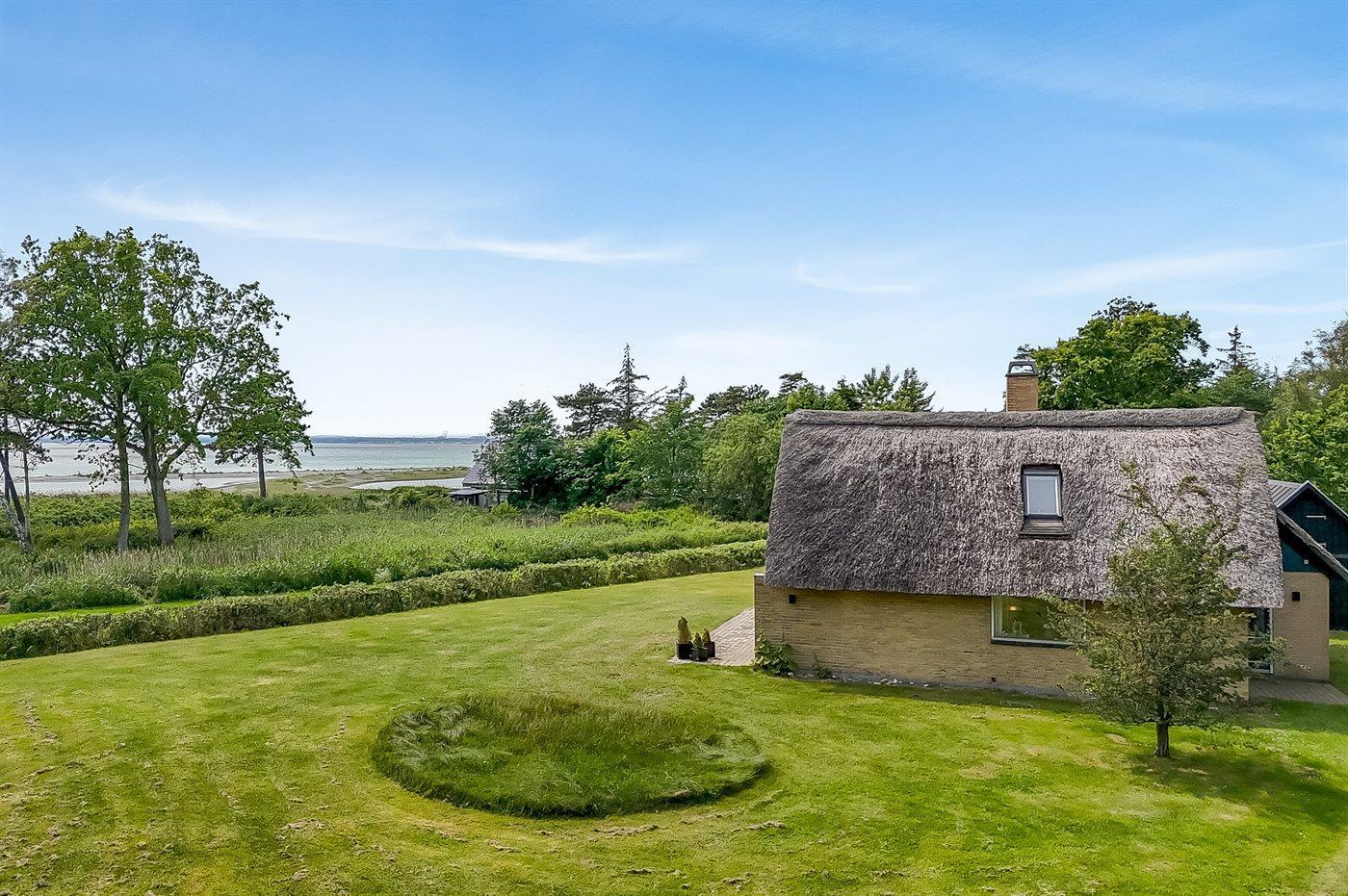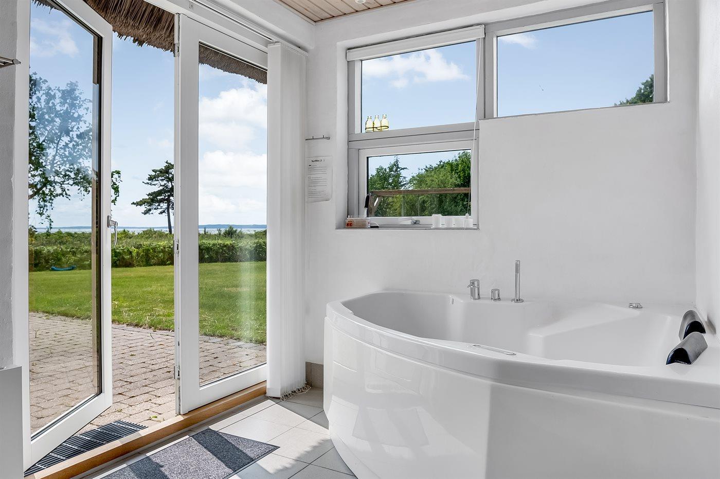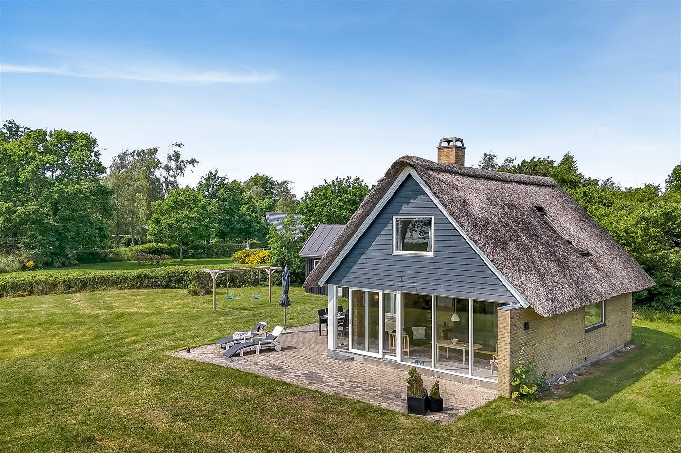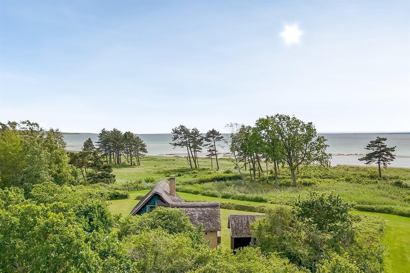 Smukt stråtækt sommerhus med panoramaudsigt og spa, kun 50 m fra havet i Knebel.