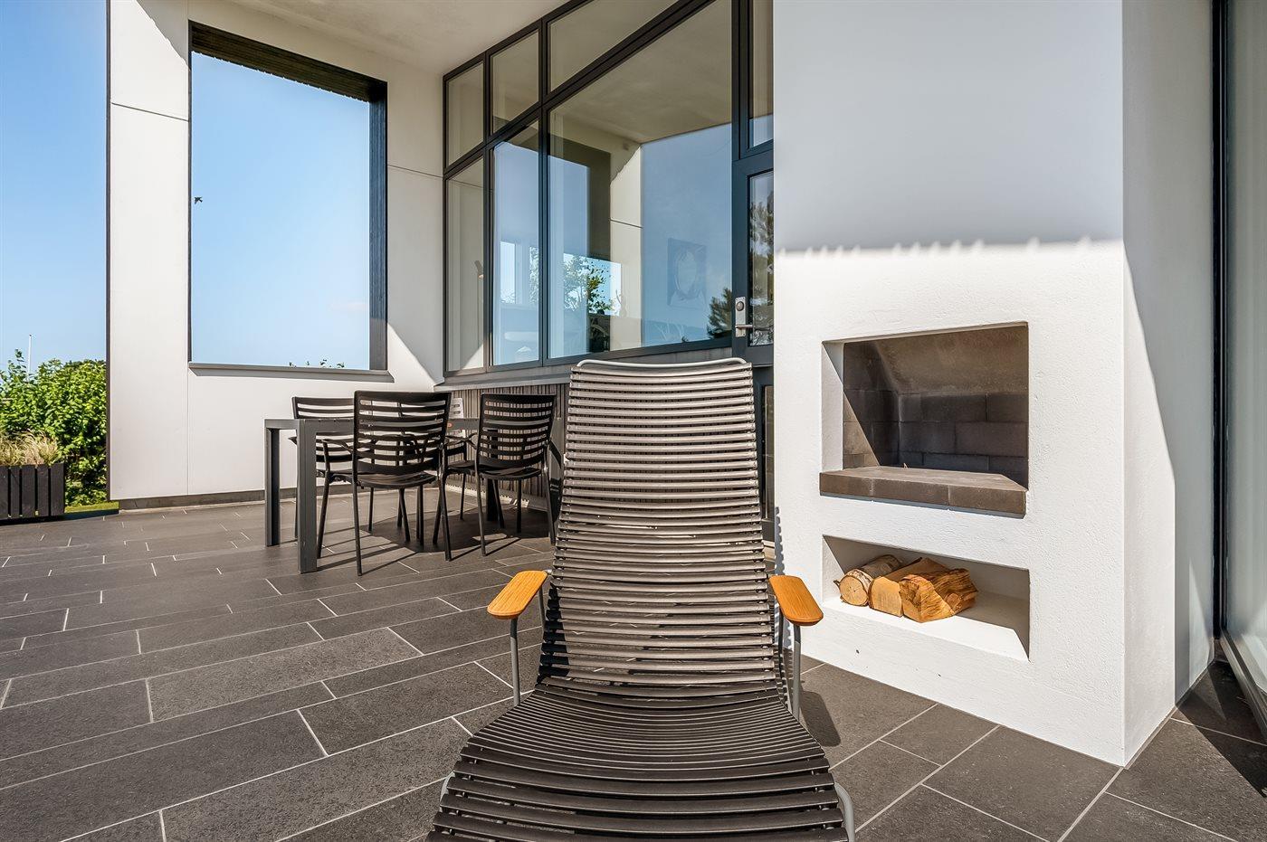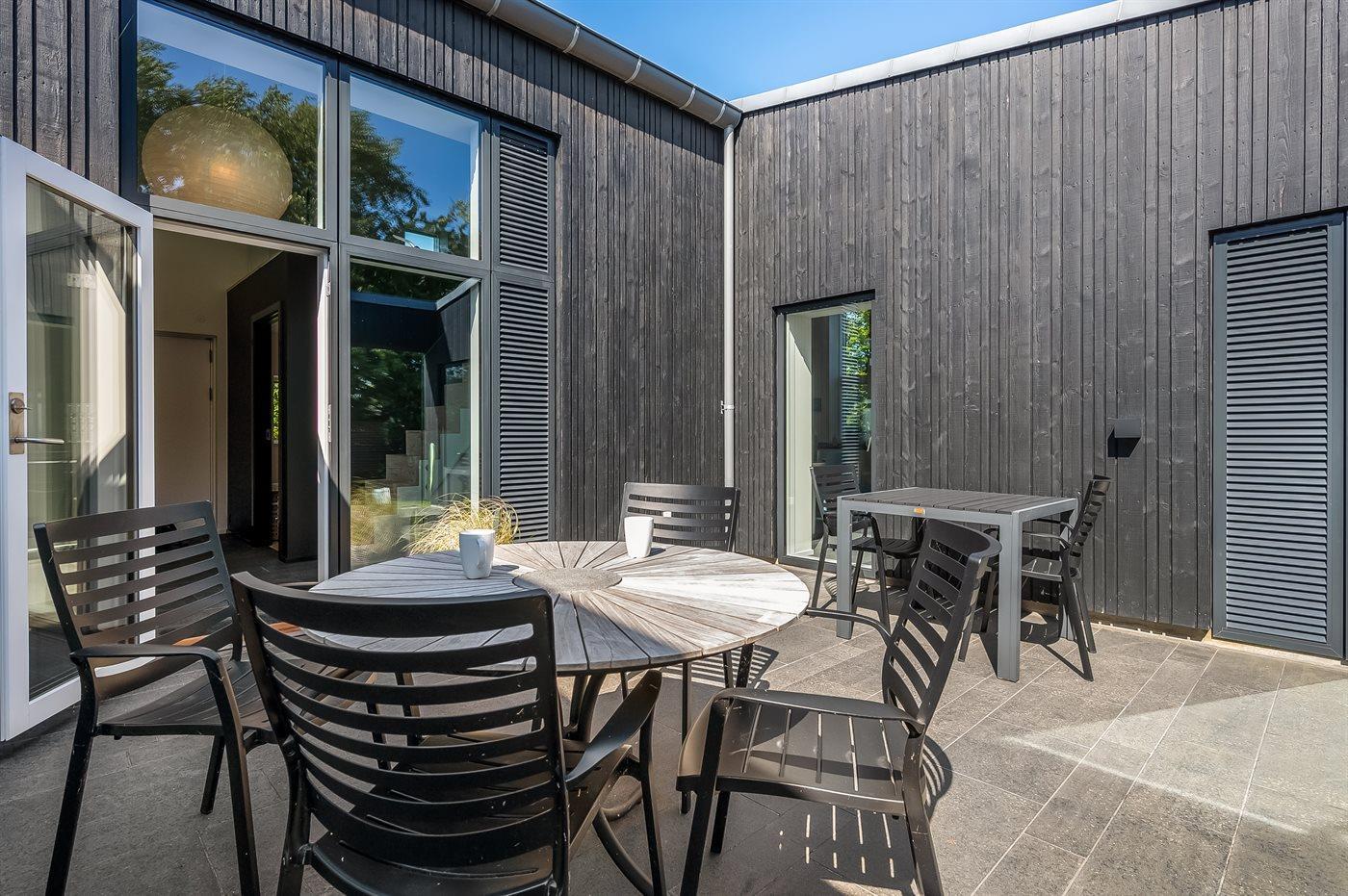 Udendørs findes flere skønne terrasser – herunder en delvist lukket og solrig gårdhave mellem husets tre længer. På bagsiden af huset er der en afskærmet udendørs bruser, hvor du kan skylle sandet af efter en tur til stranden eller nyde et morgenbad i den friske luft. Hele grunden er indhegnet og der er kun adgang gennem en aflåselig port ved indkørslen.