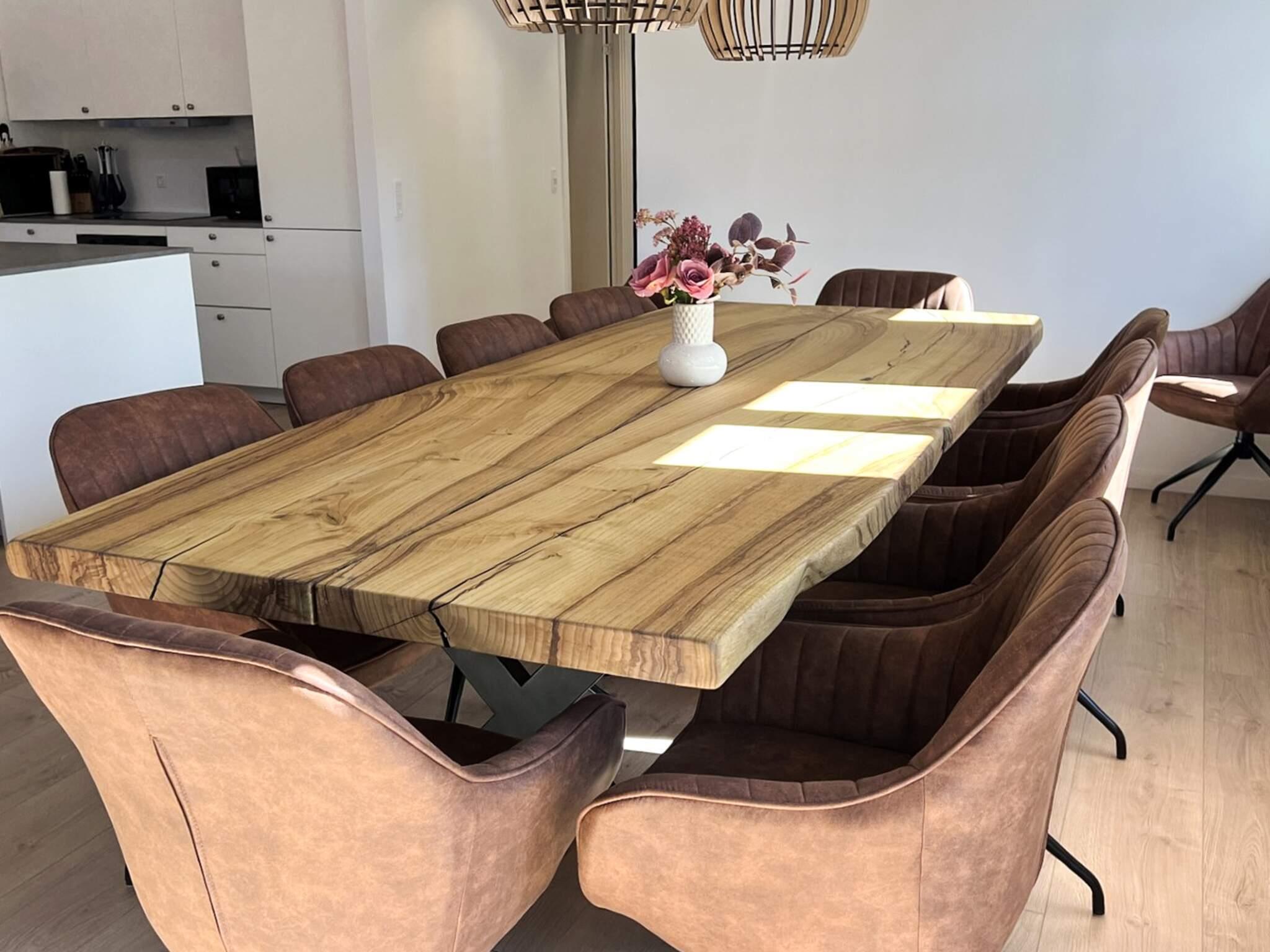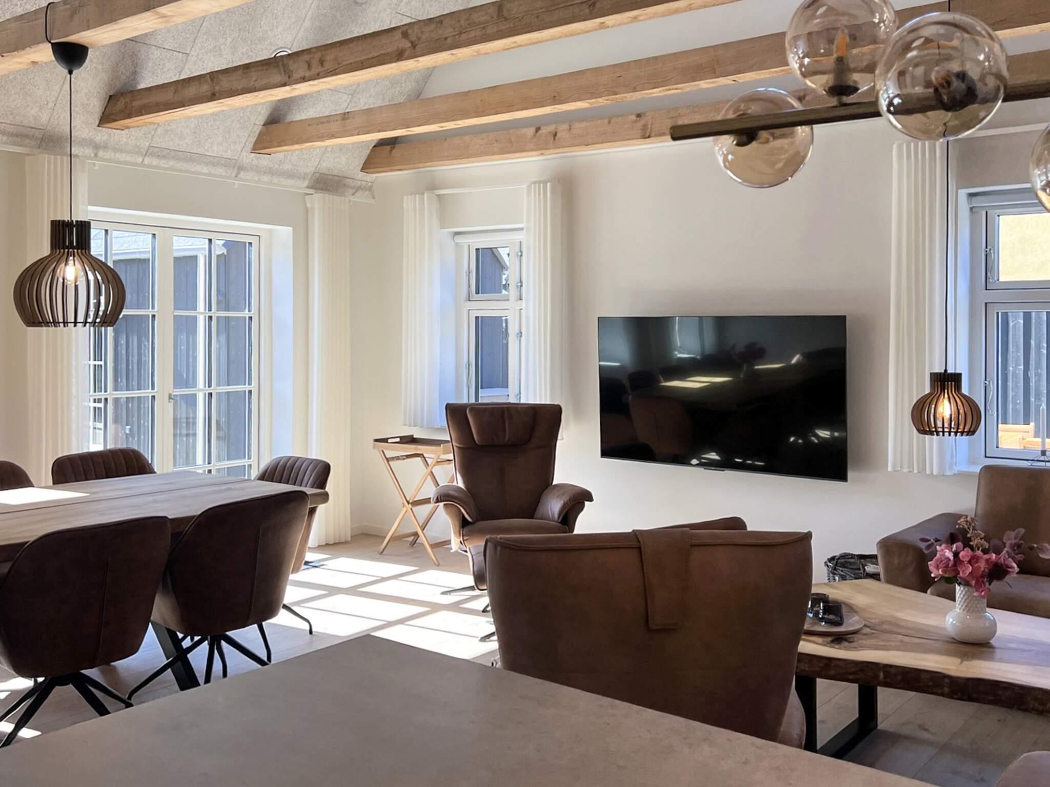 Derfra kommer man ud i den store stue/køkken miljø hvor husets store måltider tilberedes i helt nyt veludstyret køkken. Stuen er meget stor og med sit specialbyggede 125x273x6 cm plankebord til 12 prs. og derfor rigelig plads til 12-13 personer til spisning. En kæmpe sofagruppe til at slå mave i og 65” App baseret TV der kan drejes ud fra væggen i alle retninger. Smukke håndlavede danske kuppellamper overalt.