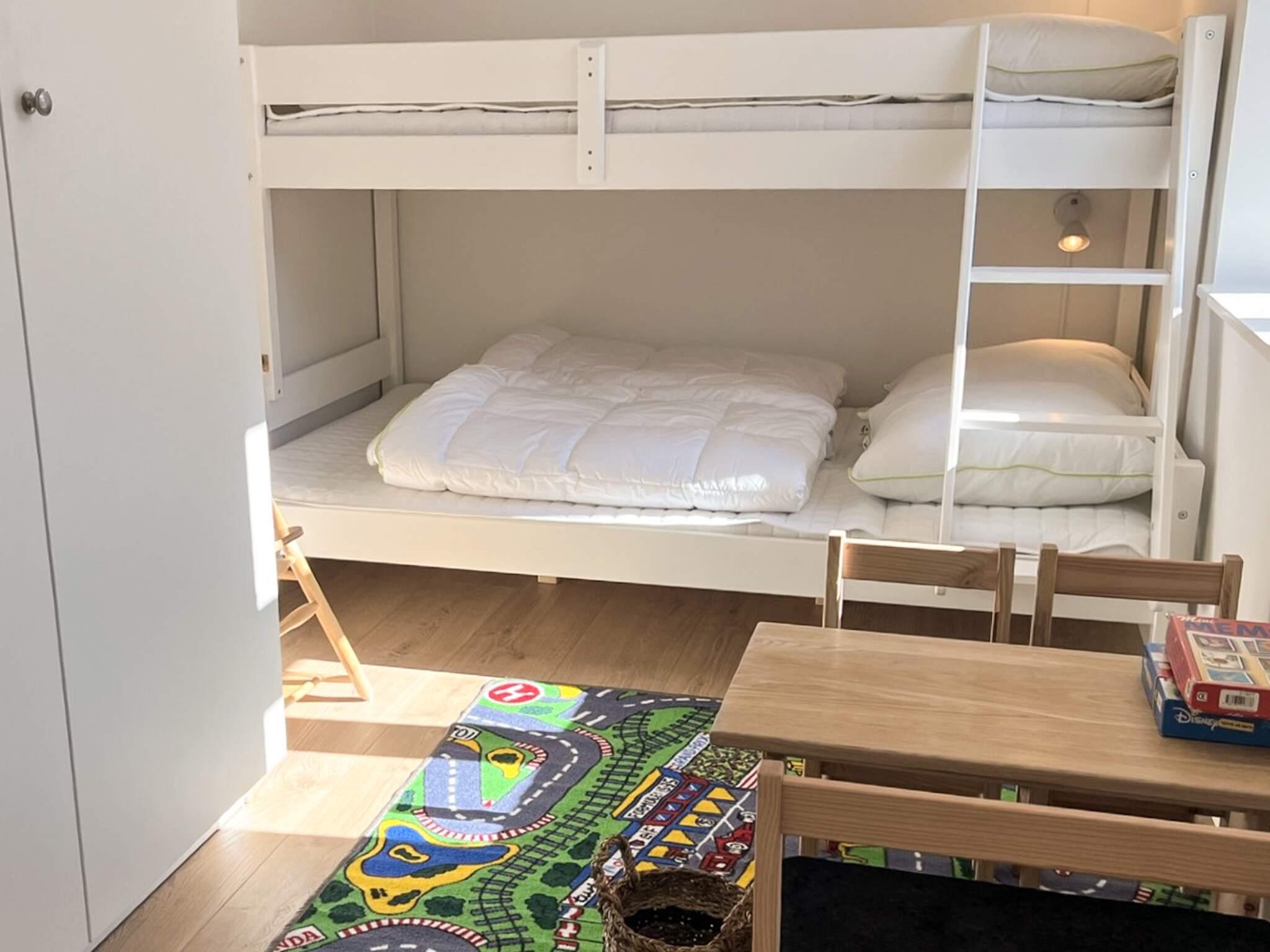 Entre og adgang til de øvrige rum. Her ser man straks et super hyggeligt børneværelse der i virkelig har fokuseret på at barnet også holder ferie. Etagesenge på 2 meter med plads til 3 unger. Håndlavet bord/Bænkesæt og spil.