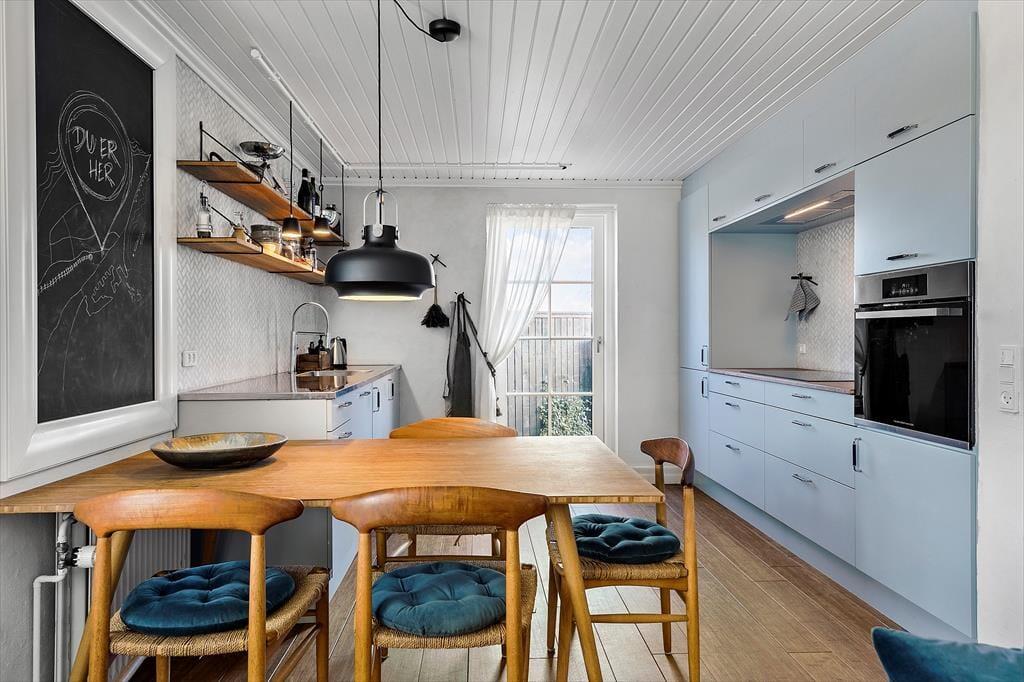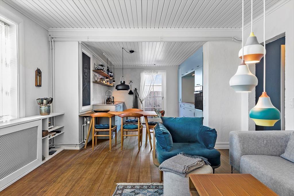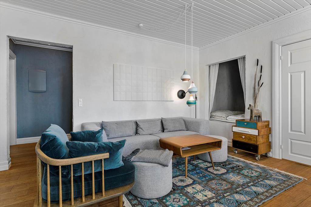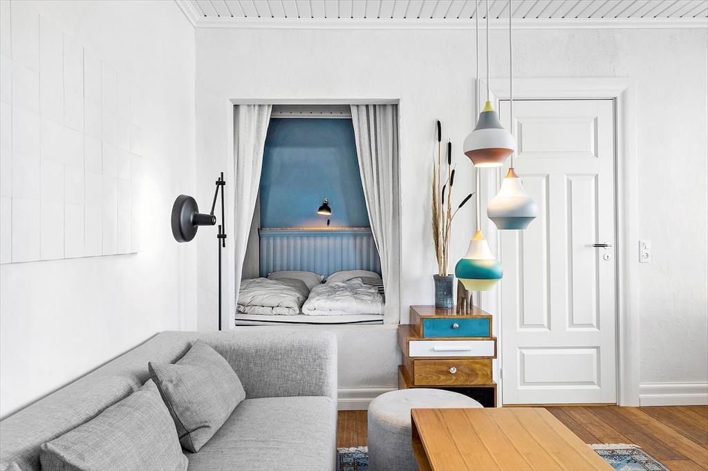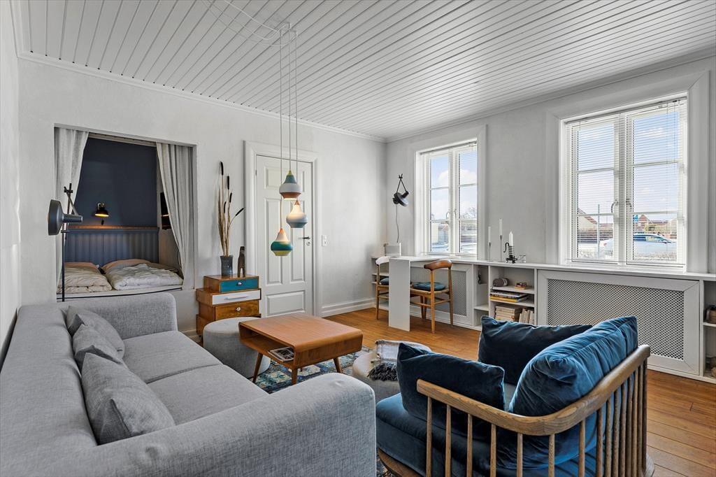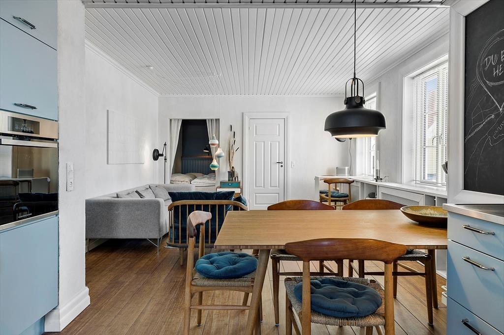 Lejligheden er indrettet med stil og charme, så du straks føler dig hjemme. Stuen og køkkenet ligger i åben forbindelse, hvilket giver et dejligt luftigt og lyst rum, hvor ferielivet kan udfolde sig i fulde drag. Start dagen med en kop kaffe i den hyggelige sofakrog, mens solens stråler så småt begynder at kigge ind gennem vinduerne. Når dagen går på hæld, kan du slænge dig i sofaen med en god bog eller en film på tv'et.