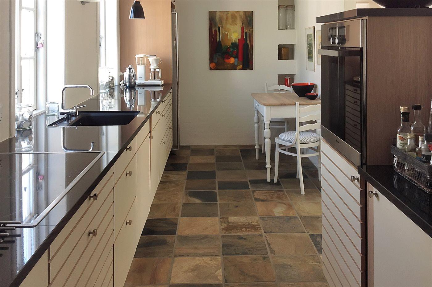 Køkkenet er udstyret med 1 amerikansk køleskab. Der er 4 keramiske kogeplader, varmluftovn samt opvaskemaskine.