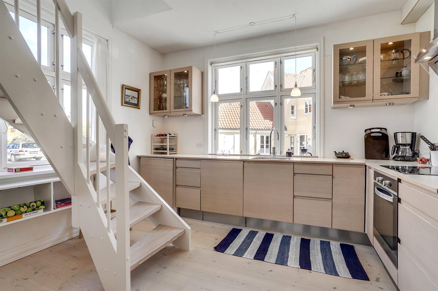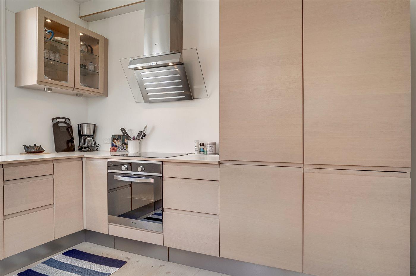 Køkkenet er udstyret med 1 køleskab. Der er 4 keramiske kogeplader, varmluftovn samt opvaskemaskine Der er gulvvarme i køkkenet.