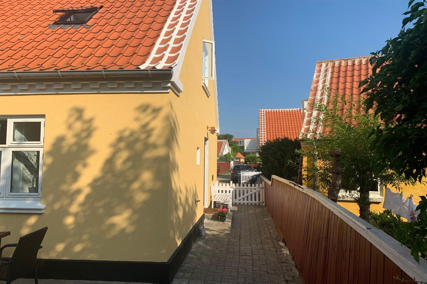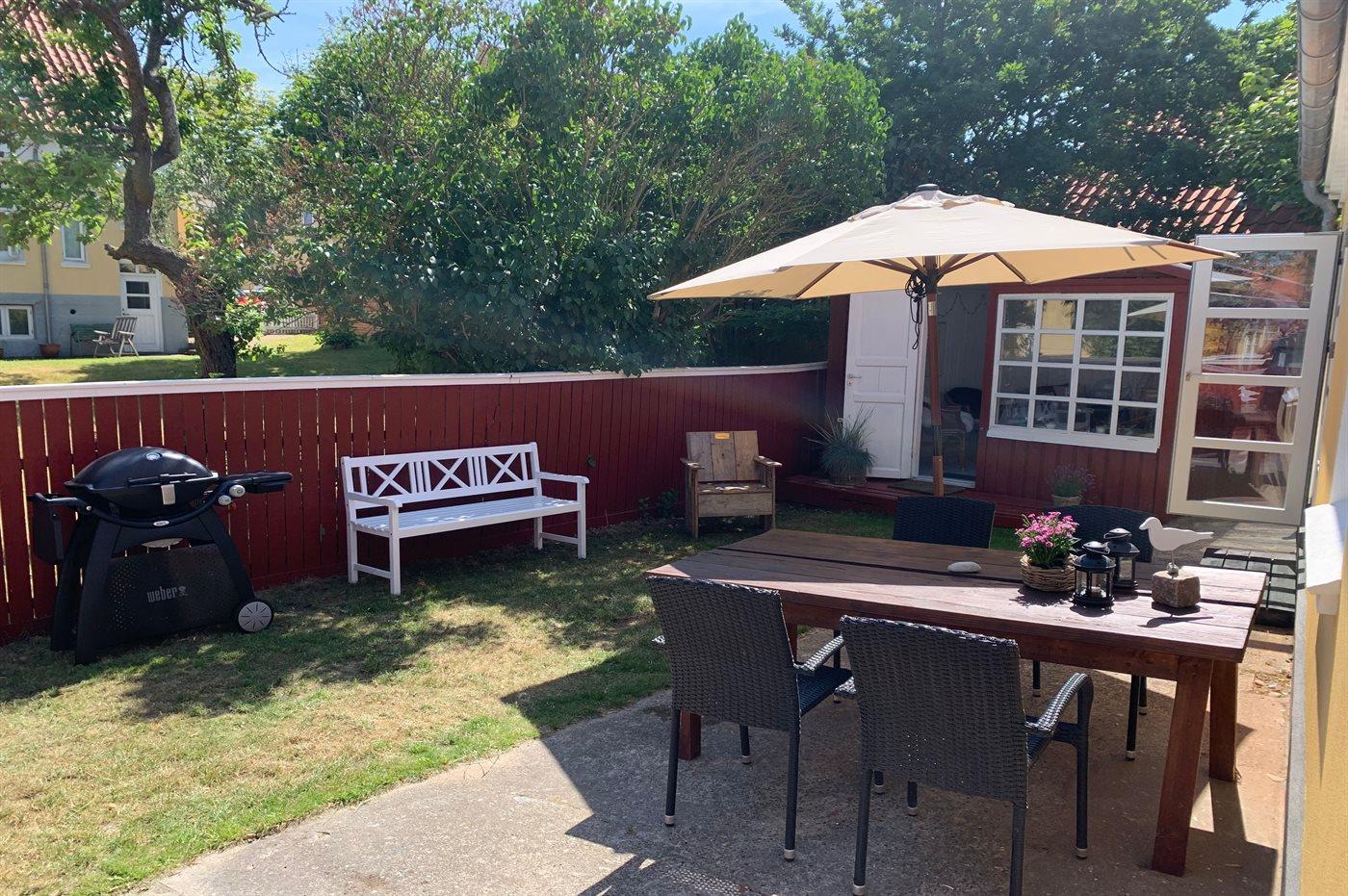 Ferieboligen er beliggende på en indhegnet havegrund. Til ferieboligen hører en skøn og ugenert gårdhave på 40 m2, hvor der er sol det meste af dagen. Til huset hører 2 annekser – det ene indrettet med 2 ekstra sovepladser og det andet er indrettet som hyggestue.