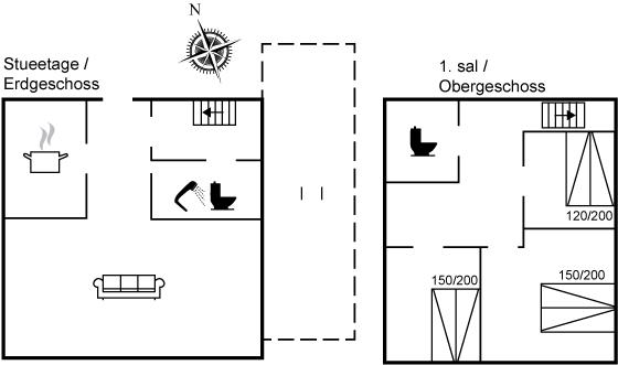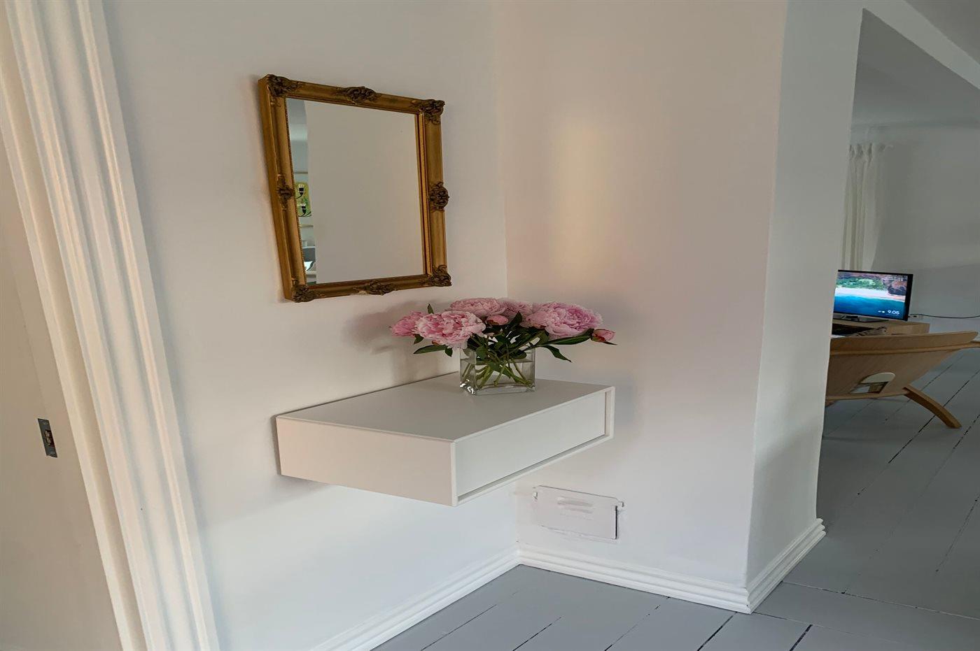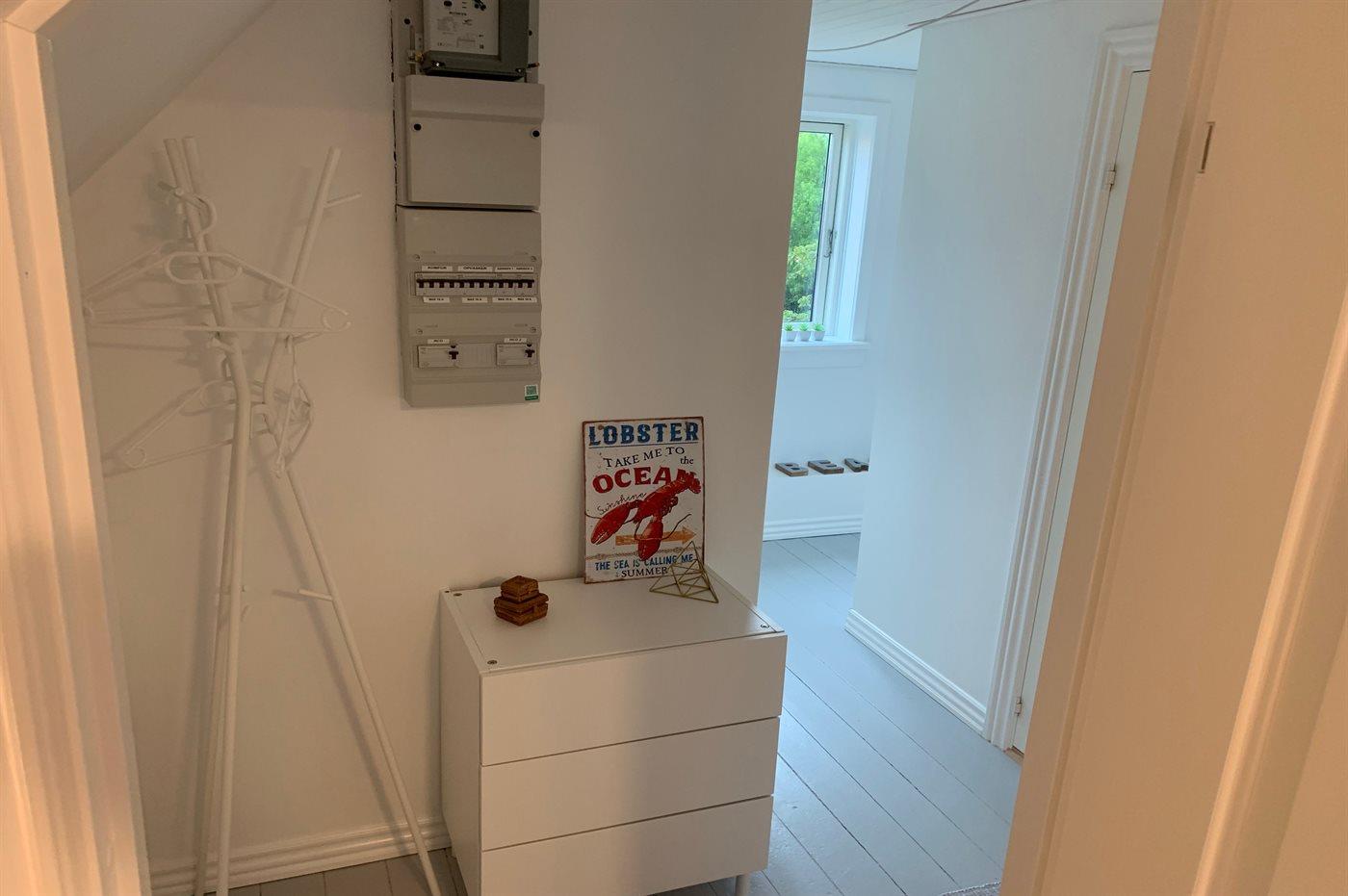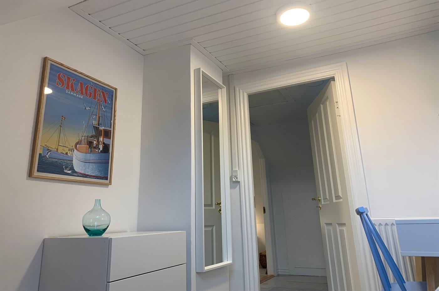 Der er badeværelse med bruser, toilet og gulvvarme i stueetagen og et toilet med gulvvarme på 1. sal. I stuen er der TV med Dongle + adgang til Netflix, Disney+ og ViaPlay i stuen, hvor der er adgang til danske, svenske, norske og 5 tyske kanaler. Desuden findes DVD/BlueRay-afspiller.