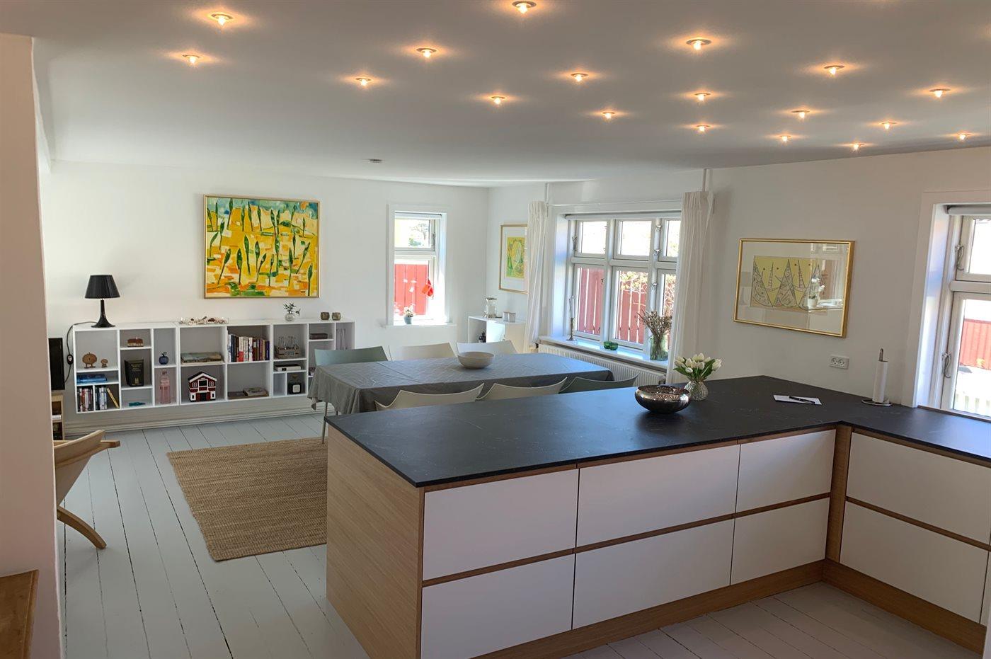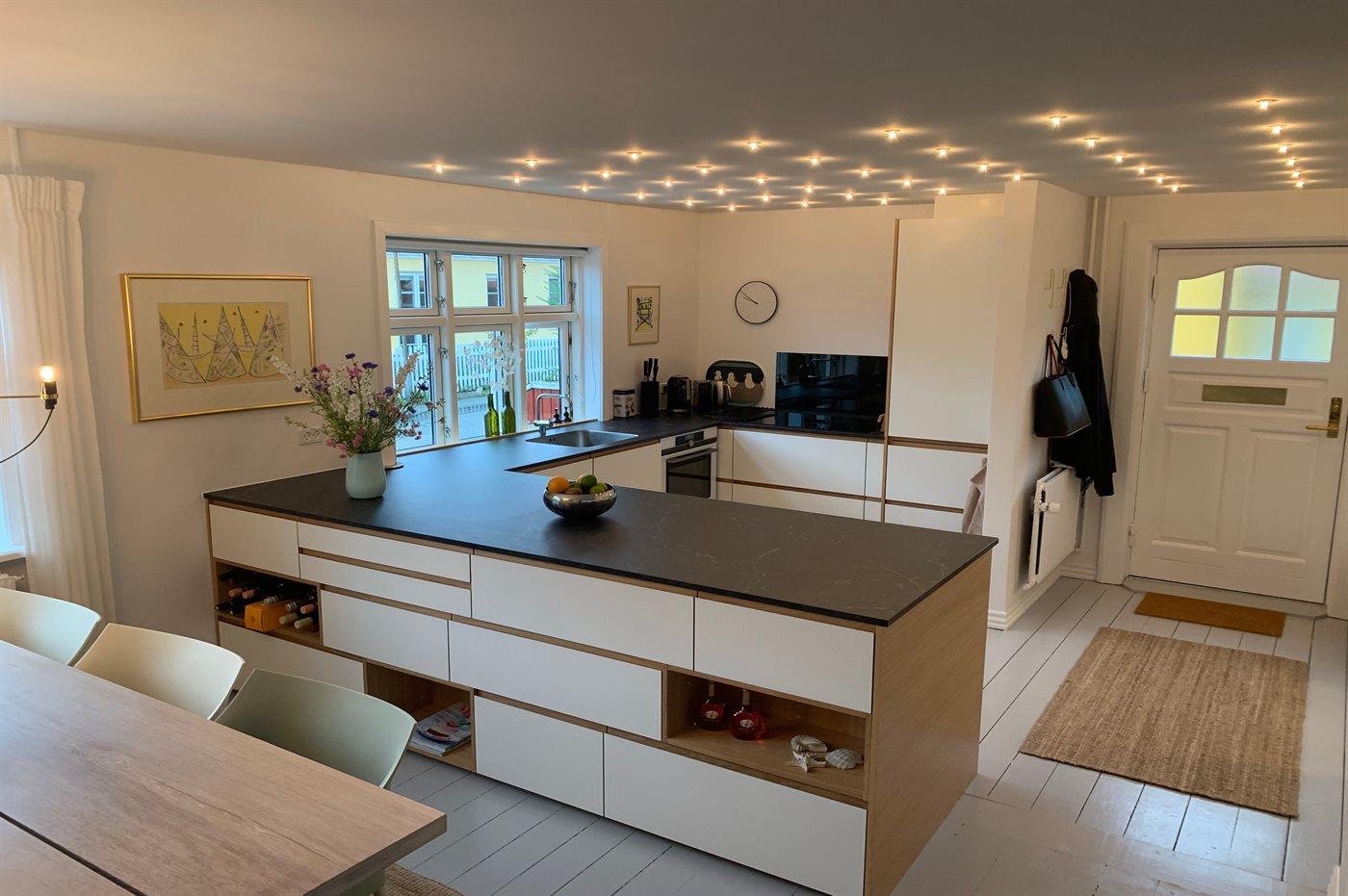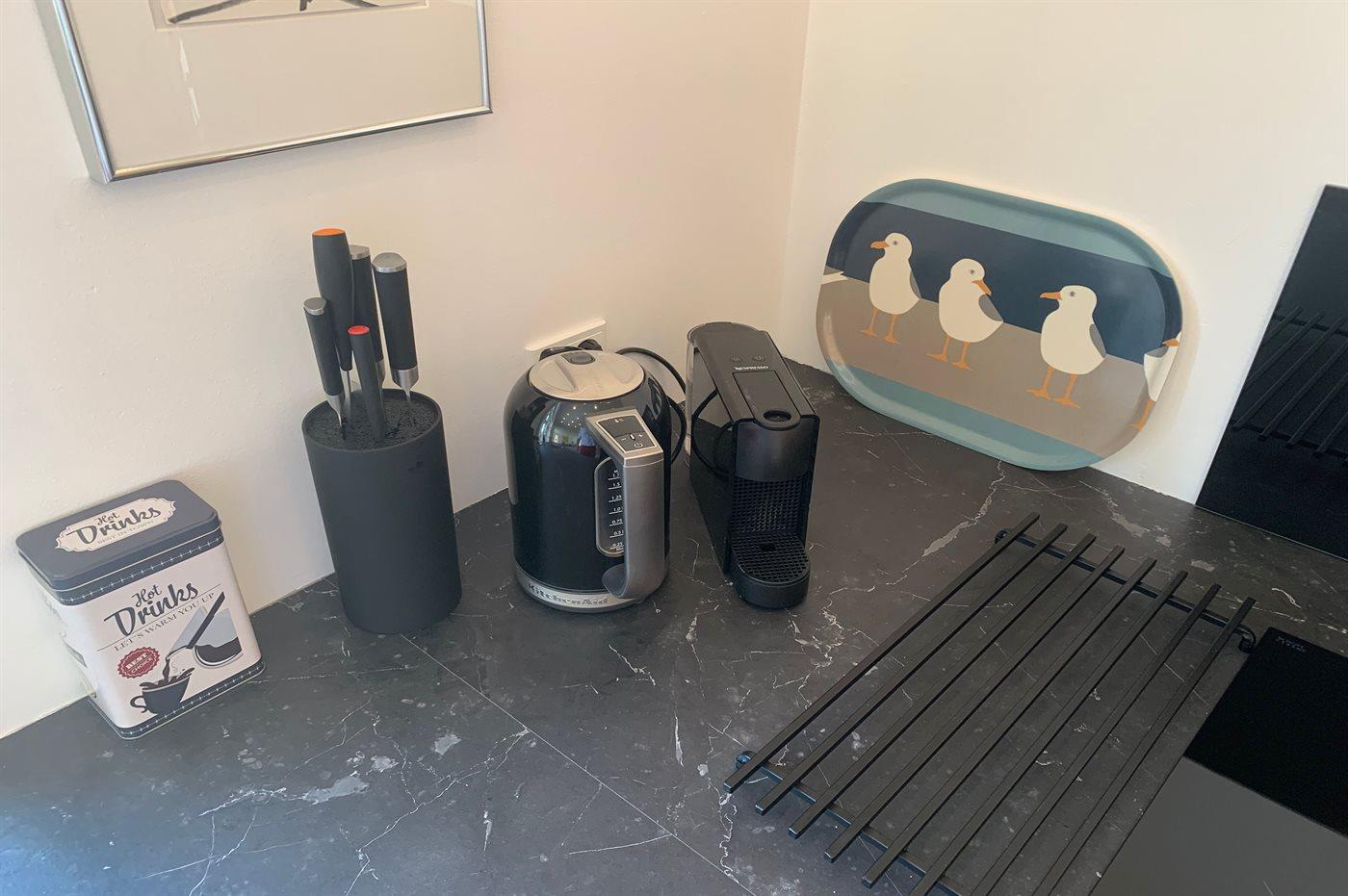 Det nyindrettede køkken er udstyret med køle-/fryseskab. 4 induktionskogeplader med indbygget em-fang. Varmluftovn. Opvaskemaskine. Kaffemaskine, Elkedel og Nespresso-maskine.