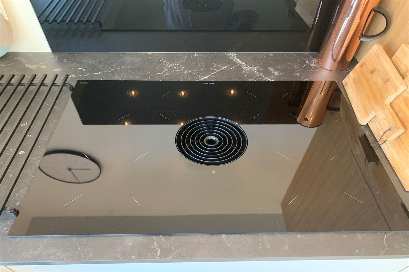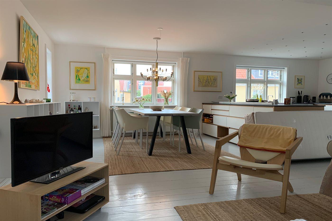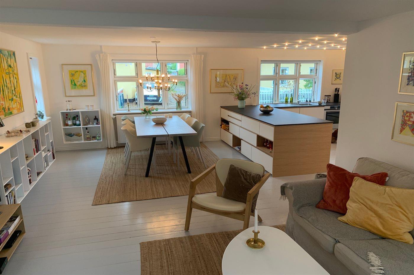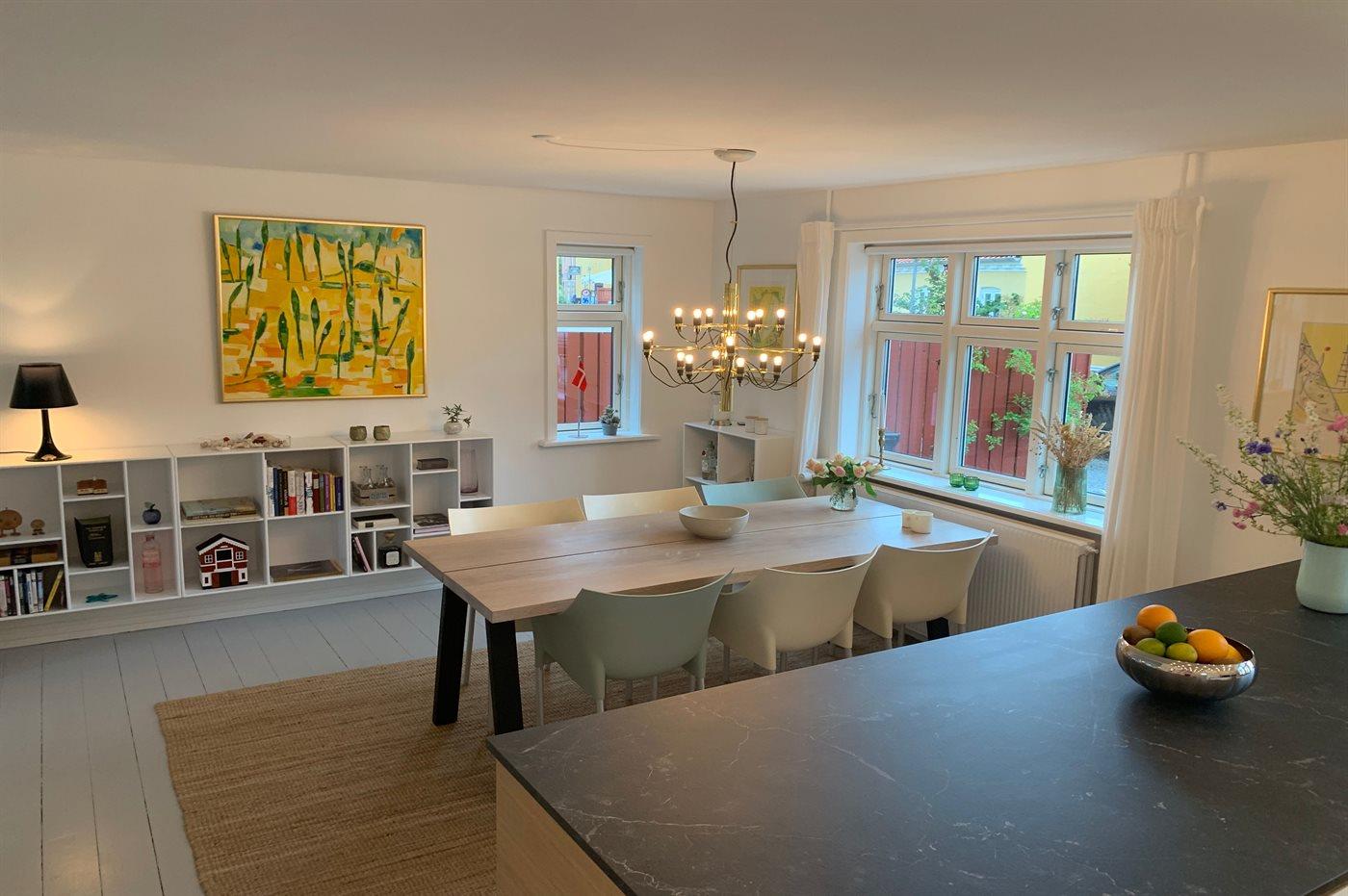 Det nyindrettede køkken er udstyret med køle-/fryseskab. 4 induktionskogeplader med indbygget em-fang. Varmluftovn. Opvaskemaskine. Kaffemaskine, Elkedel og Nespresso-maskine.
