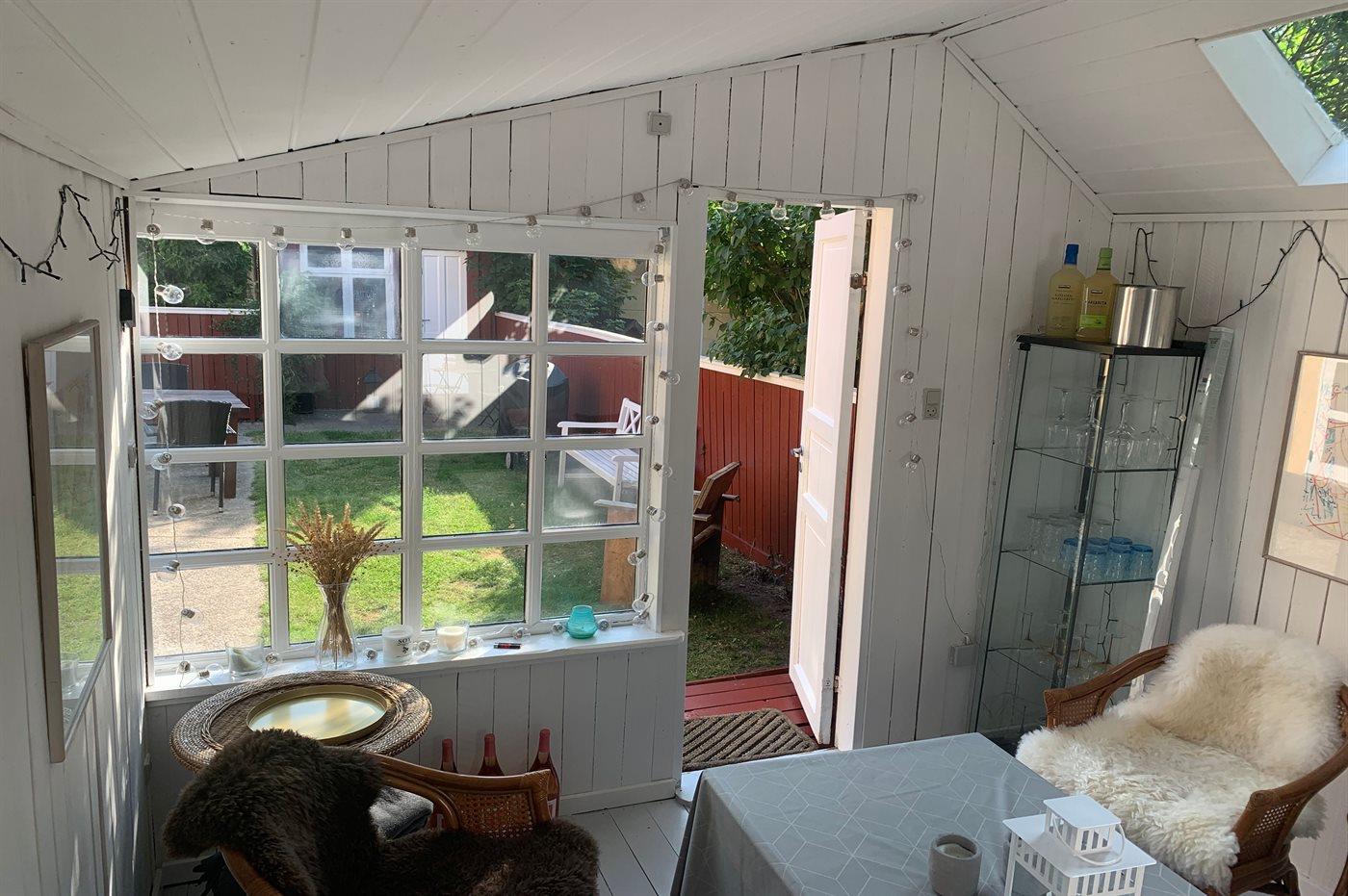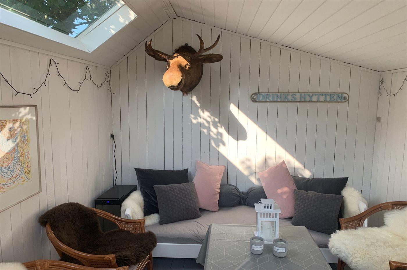 Når duggen falder, eller hvis skyerne truer, kan I benytte ”Drinks-hytten”, der er et anneks indrettet som hyggestue med Day-bed og siddepladser, hvor I kan nyde jeres drinks. Der er installeret vin-køleskab, hvor I kan holde Champagnen & Rosévinen kold.