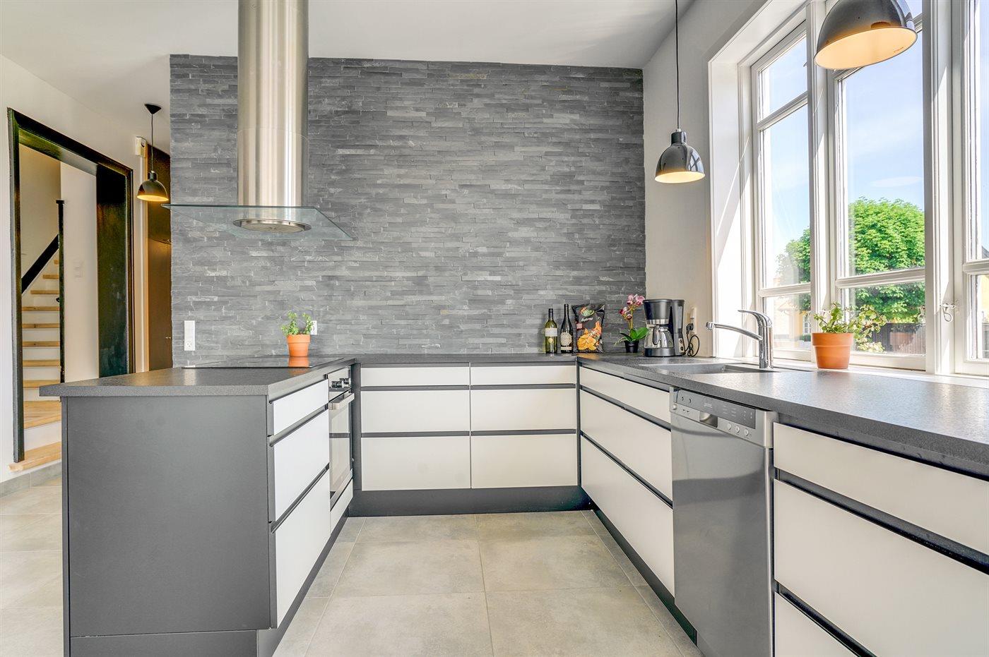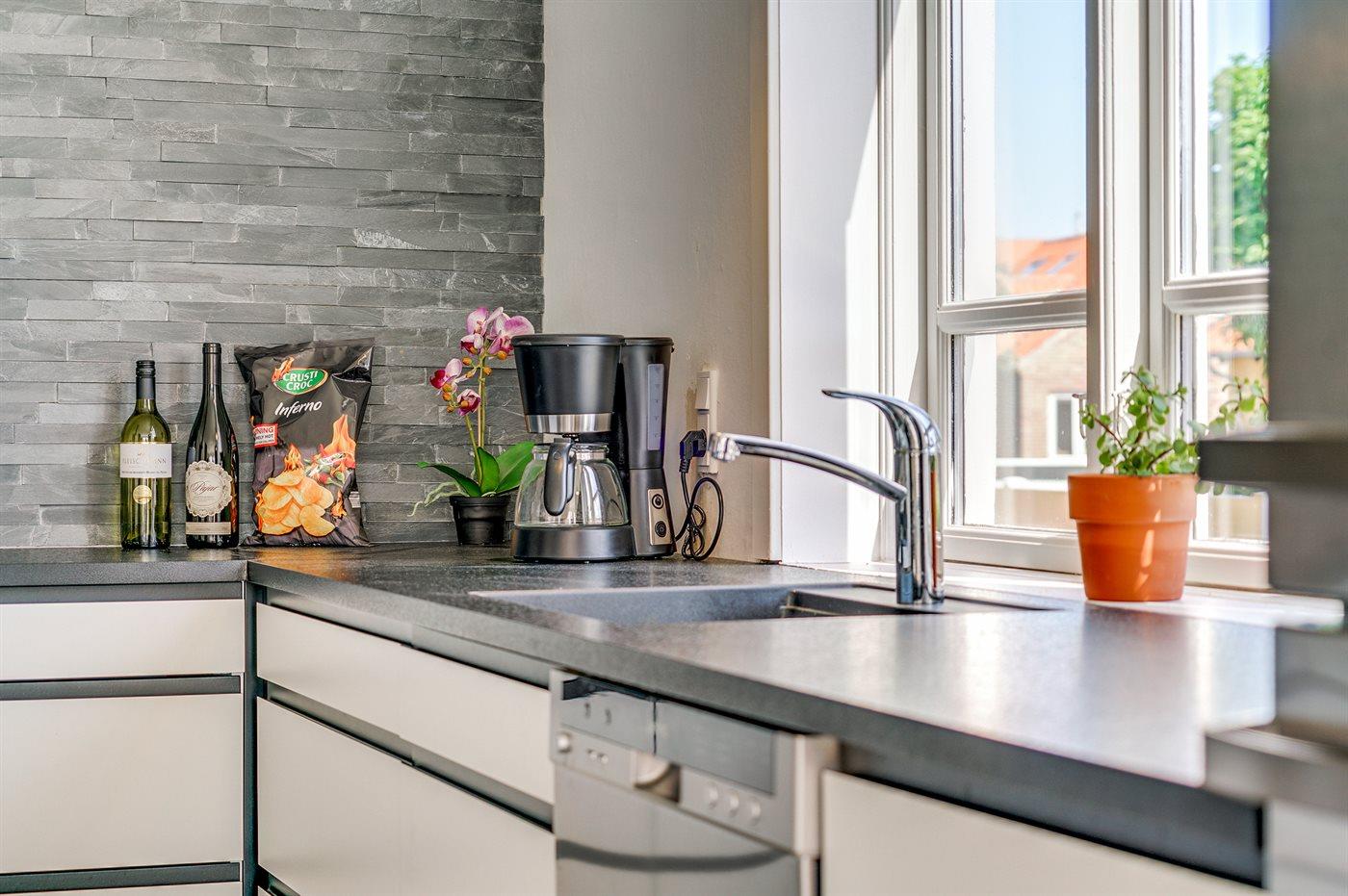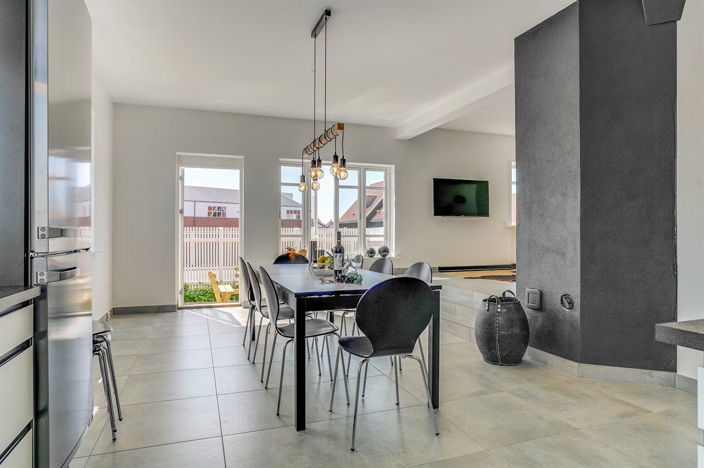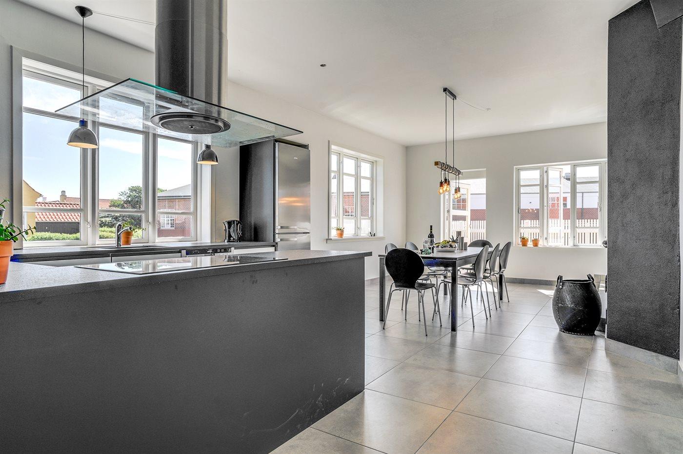 Køkkenet er udstyret med 1 køleskab. Der er 4 induktionskogeplader, varmluftovn, mikrobølgeovn samt opvaskemaskine.