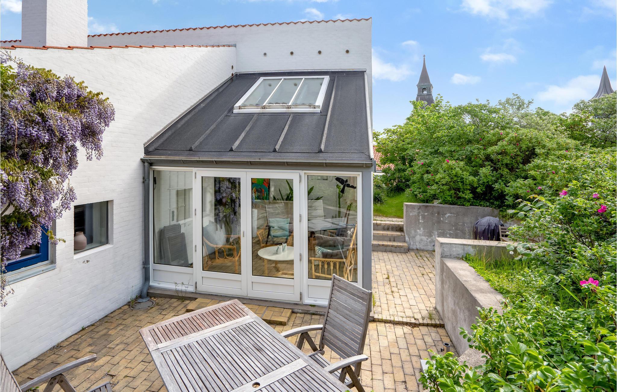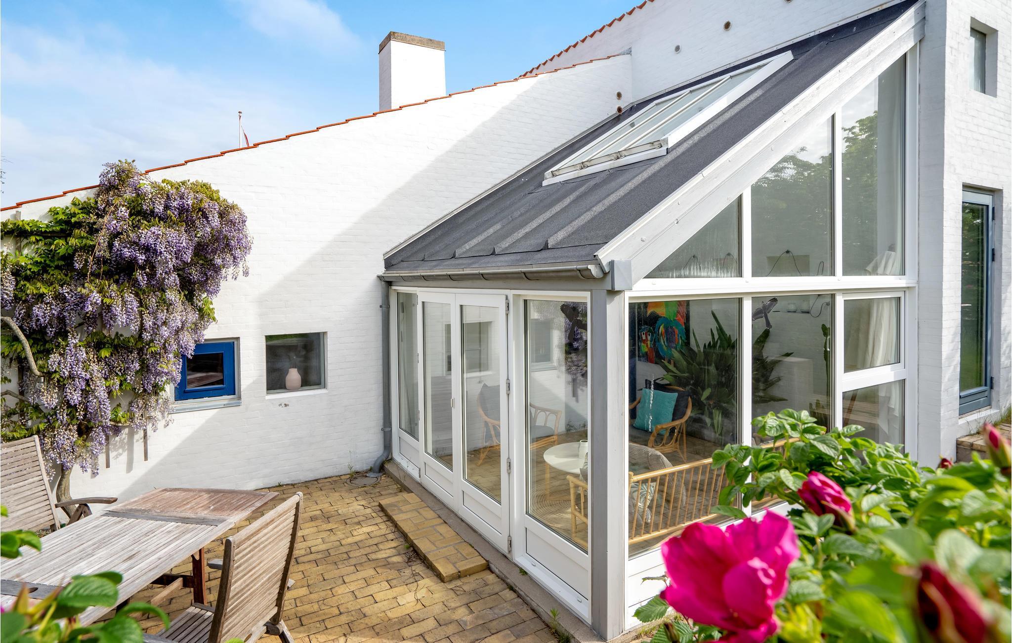 Moderne feriehus i Skagen med lysindfald, terrasse og vinterhave nær strand og byliv.