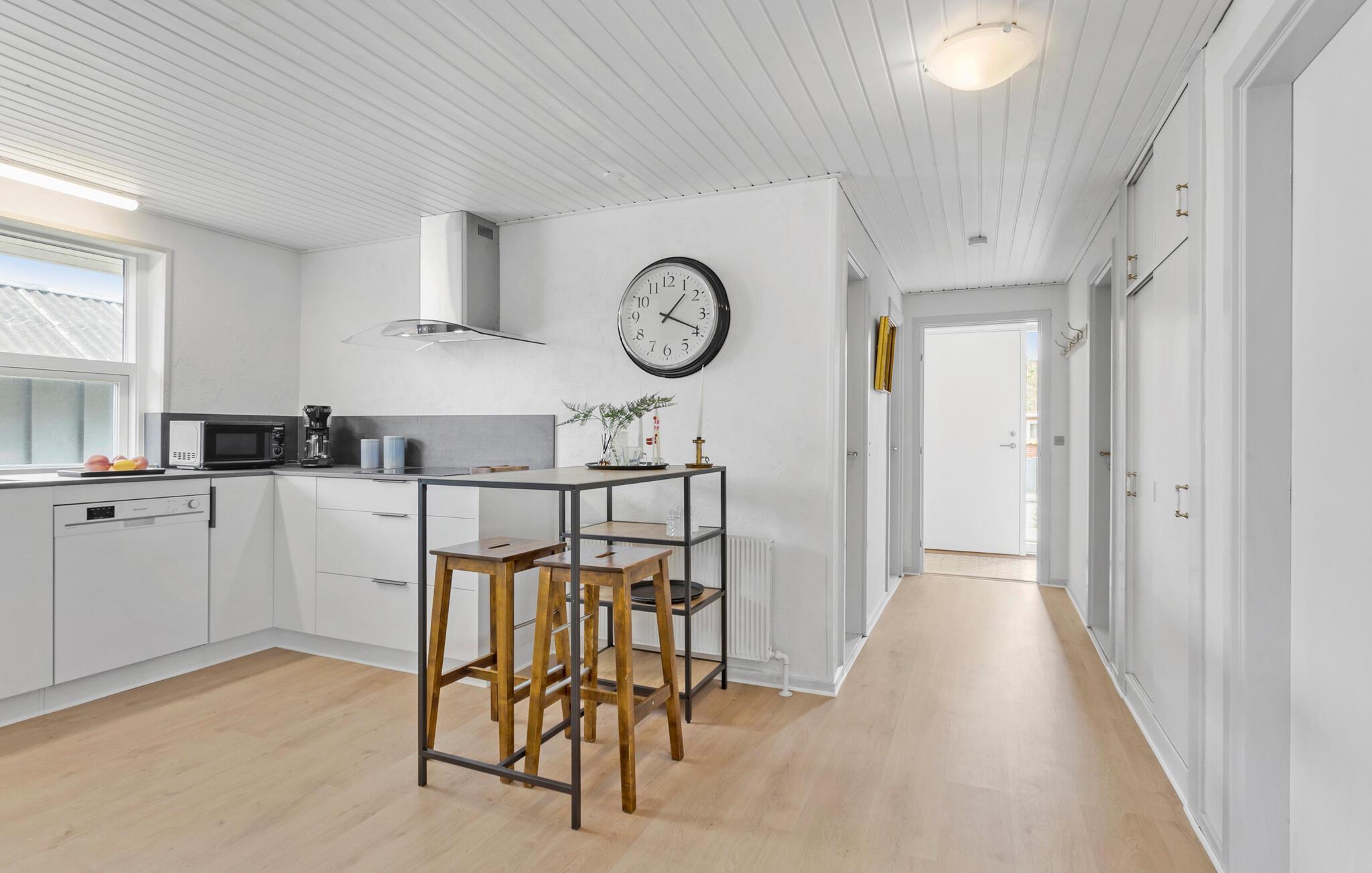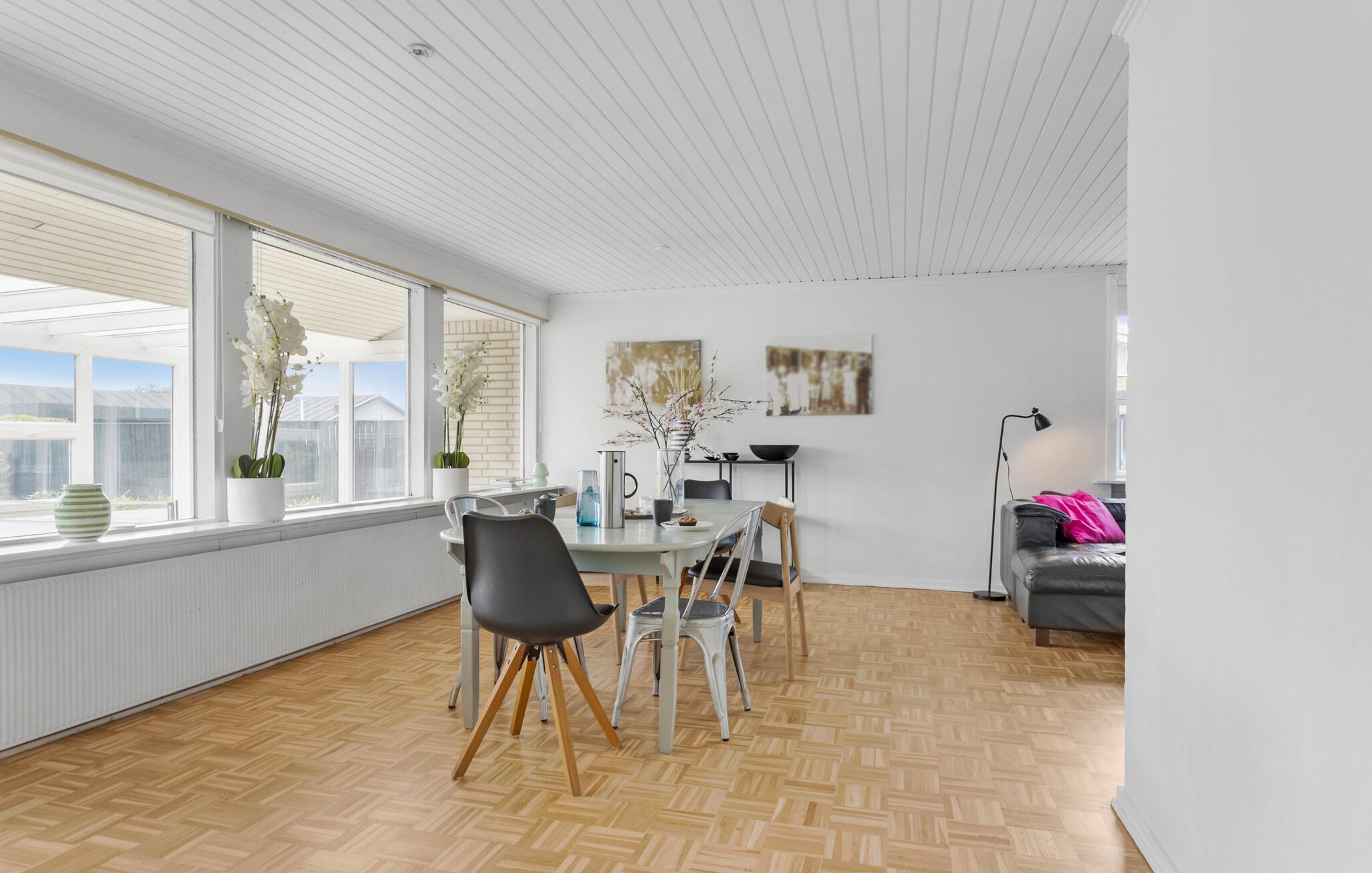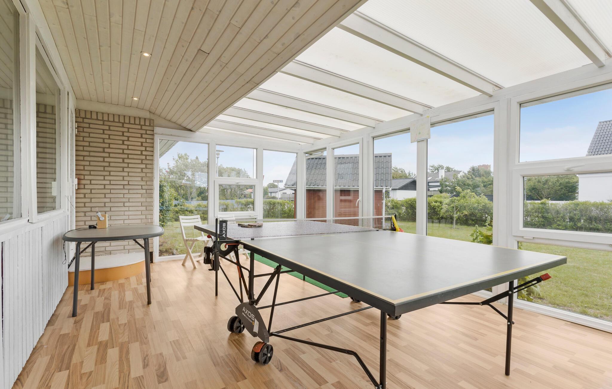 Dette hyggelige feriehus består af nogle rigtig gode fællesområder til samvær og spisning, og så er der alt, hvad I skal bruge, når I skal slappe af. Sammensæt feriens måltider i det åbne køkken eller brug grillen på terrassen til en hyggelig aften med bøffer, pølser og kartoffelsalat. Læn jer tilbage i det komfortable sofahjørne i den lyse stue eller snup et spil bordtennis i udestuen.
