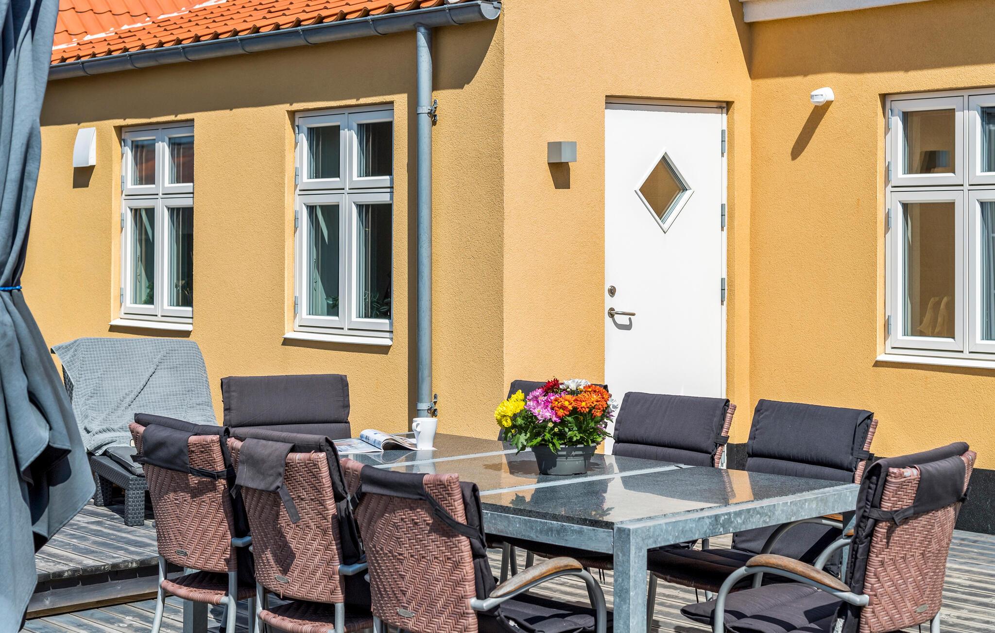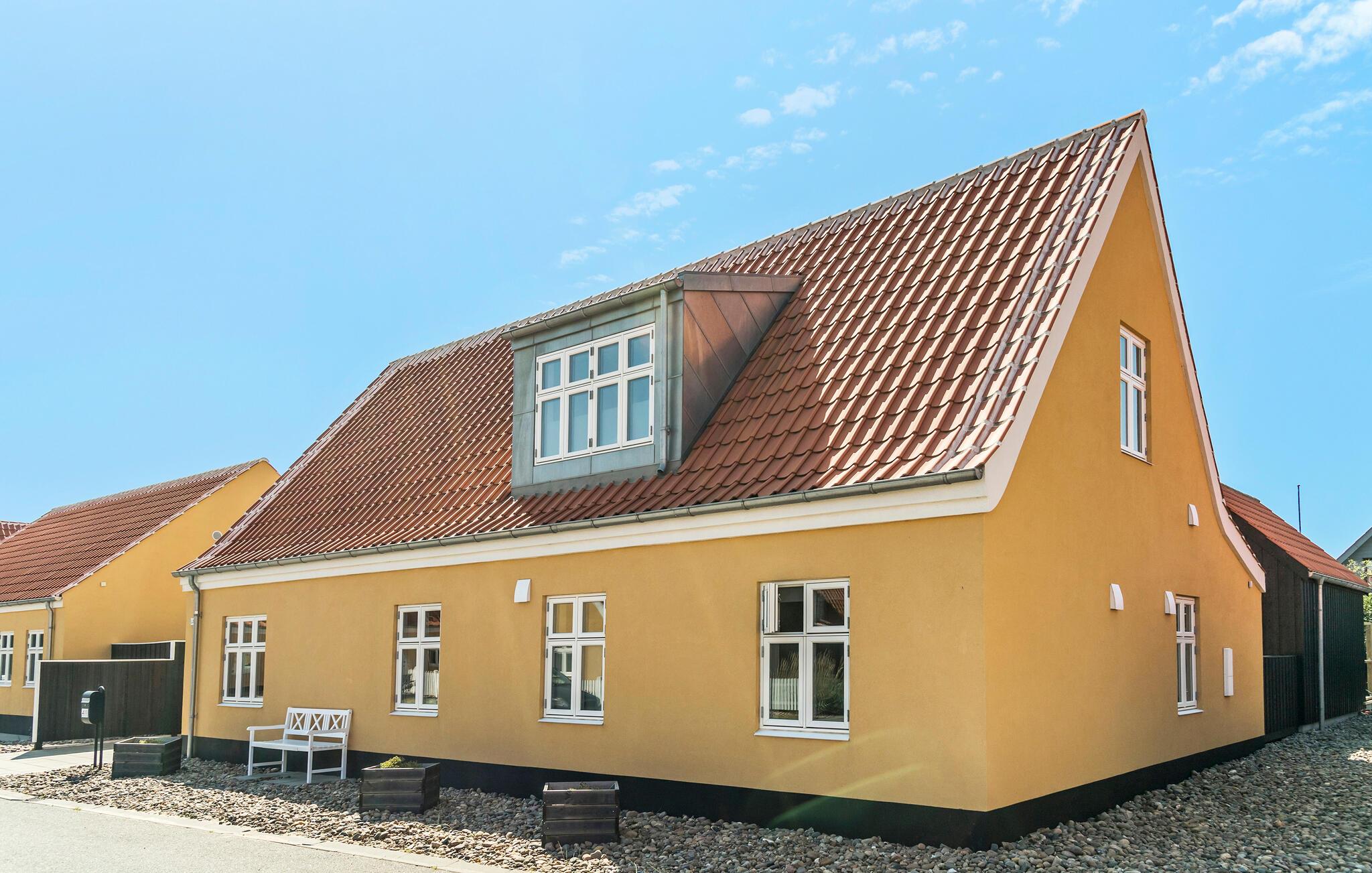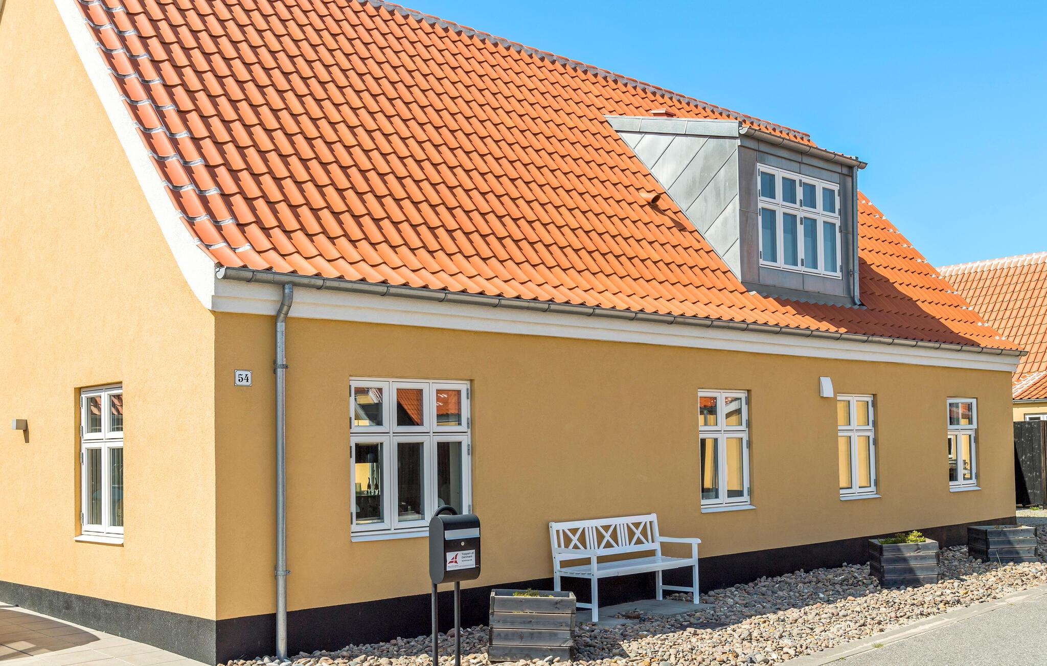 Velkommen til et dejligt område i Lille Skagen, hvor I kan se frem til en ferie med ro og komfort. Træd ind i det klassiske gule skagenhus og nyd de indbydende, lyse lokaler, som fordeler sig over to etager. Her er der alt, hvad I behøver til jeres feriedage. Byhusene ligger tæt på hinanden, men alligevel har I det helt for jer selv i den afskærmede gårdhave. Her får I jeres egen lille "gryde" til solskinsdagene, hvor I kan sætte jer med en kop kaffe og en god bog. Der er direkte adgang til terrasserne fra det hyggelige anneks og den lyse stue. Her kan I nyde freden og roen, husets moderne løsninger og det veludførte design. Bil er ikke nødvendigt, for I har kort gåafstand til det meste.