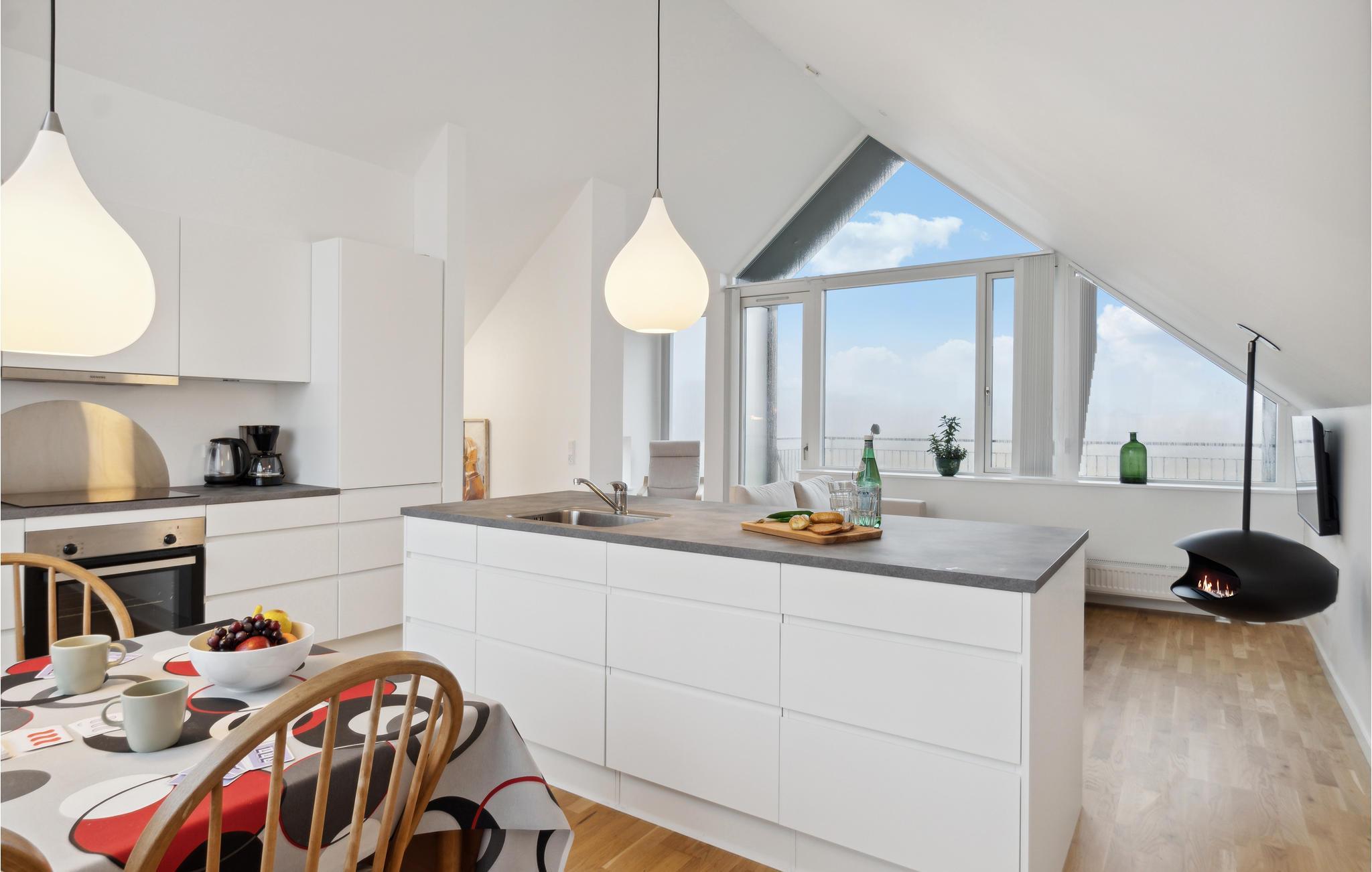Velkommen til dette moderne rækkehus, der ligger i et naturskønt område med en skøn udsigt over Nordstrand. Huset er indrettet på to etager, og her skal I bare føle jer hjemme og slappe af med madlavning i det fuldt udstyrede køkken. Soveværelserne ligger i stueetagen, og på første sal kan I se frem til mange hyggelige stunder med en vidunderlig udsigt. I de køligere måneder skaber den stilrene gasovn de ideelle rammer om nogle hyggelige filmaftener, og i sommermånederne kan I se frem til de lune sommeraftener på de to altaner og terrasser, som vender mod både øst eller vest.