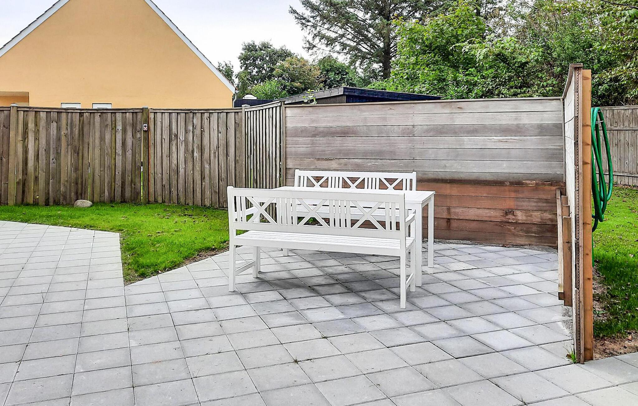 Haven er flot og indbydende, og på terrassen kan I nyde de lange lyse sommeraftener. Der er en ekstra terrasse, hvor I kan nyde solen over en kop kaffe, mens jeres børn kan lege på legeredskaberne i havens fællesareal.