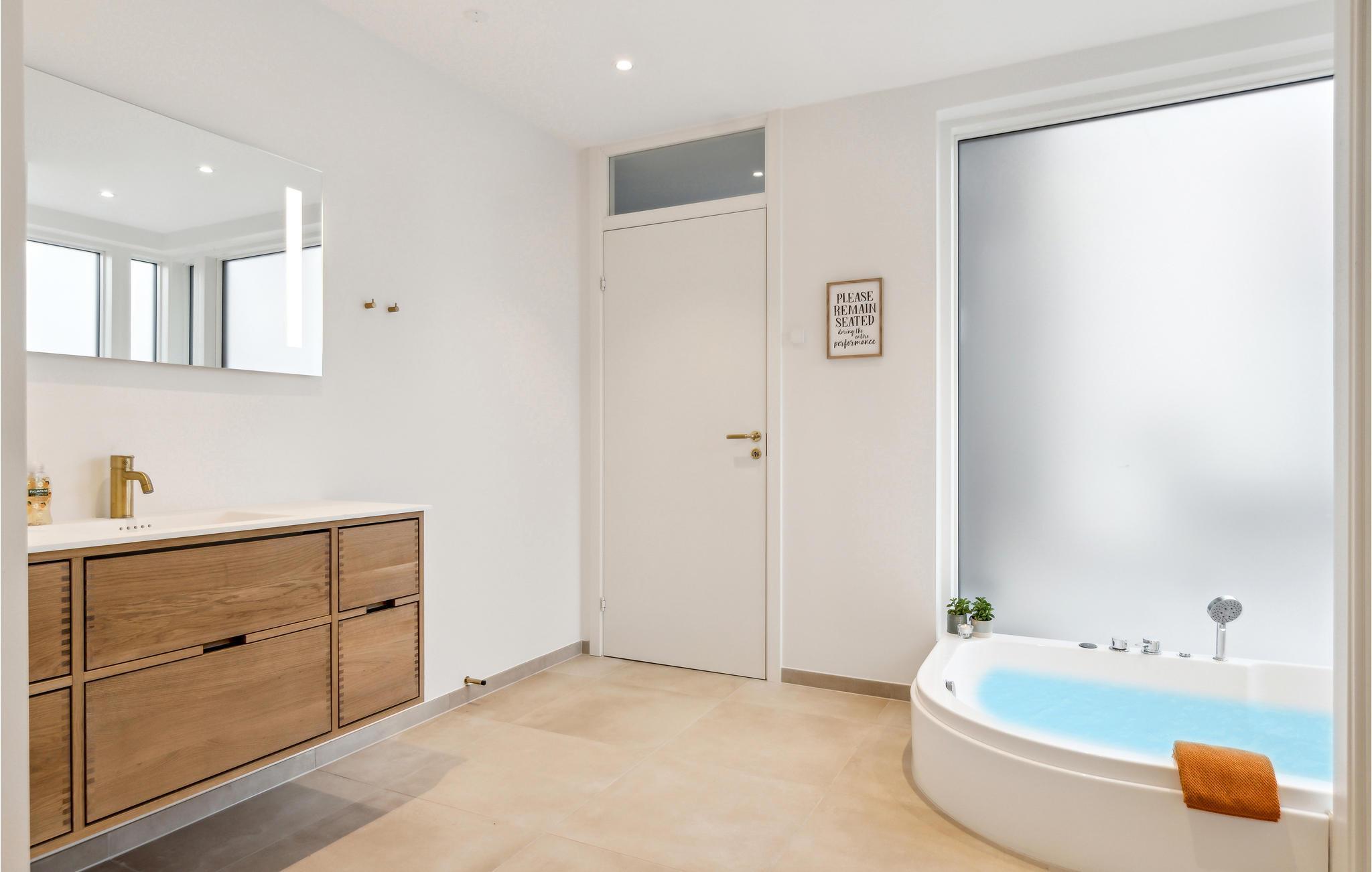 Dette flotte feriehus i rolige omgivelser vil uden tvivl overraske jer, når I ankommer, og I kan glæde jer til de dage, I skal tilbringe her. Moderne og stilfuldt interiør går hånd i hånd med topfaciliteter og funktionalitet. Her bliver afslapning og rekreation bestemt ikke forsømt. Det store og lyse hus har to stuer, hvorfra I kan se havet fra første sal. I stueetagen kan I lave mad sammen i det fuldt udstyrede køkken eller slappe af ved pejsen i stuen. Huset byder også på wellness. Sauna og boblebad, både i huset og på terrassen, inviterer jer til at slappe af og glemme jeres hverdagsbekymringer. Efter en tur i boblebadet kan I solbade på den store træterrasse og lægge planer for de kommende dage over en kop kaffe.