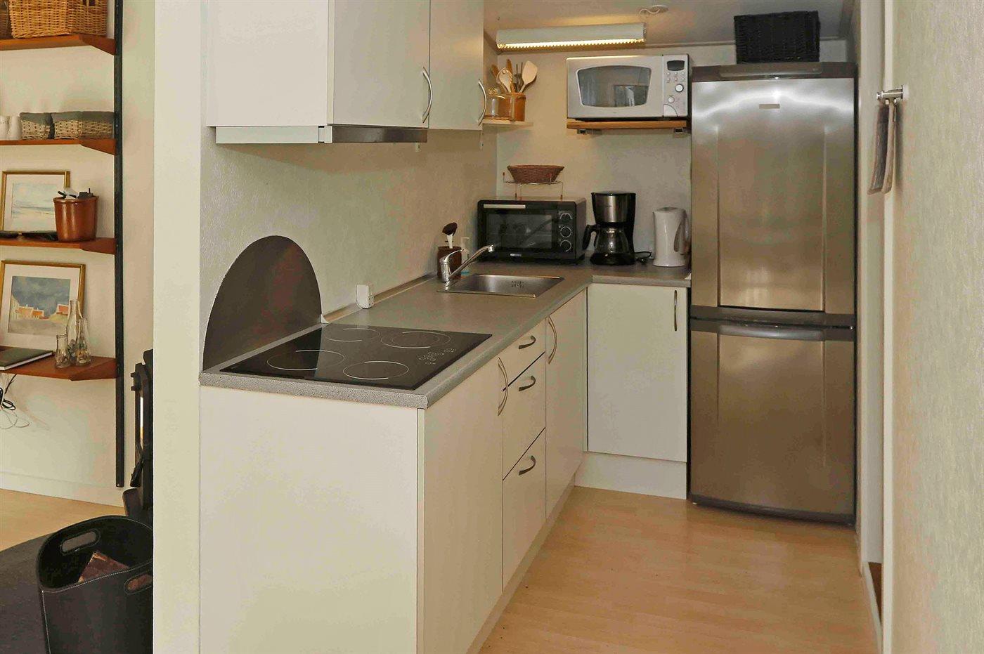 Køkkenet er udstyret med 1 køleskab. Der er 4 keramiske kogeplader, varmluftovn.