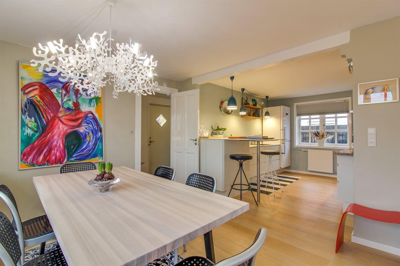 Køkkenet er udstyret med 1 køleskab. Der er 4 induktionskogeplader, varmluftovn, mikrobølgeovn samt opvaskemaskine.