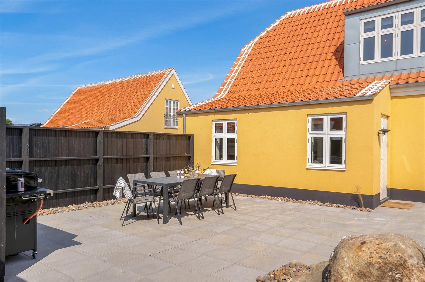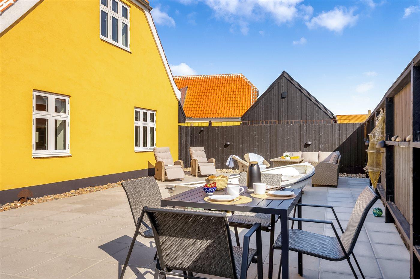 Du finder dette klassisk gule Skagenshus i kvarteret Lille Skagen - tæt på den hyggelige havn samt bymidten, og ikke langt fra Solnedgangspladsen og de dejlige badestrande.