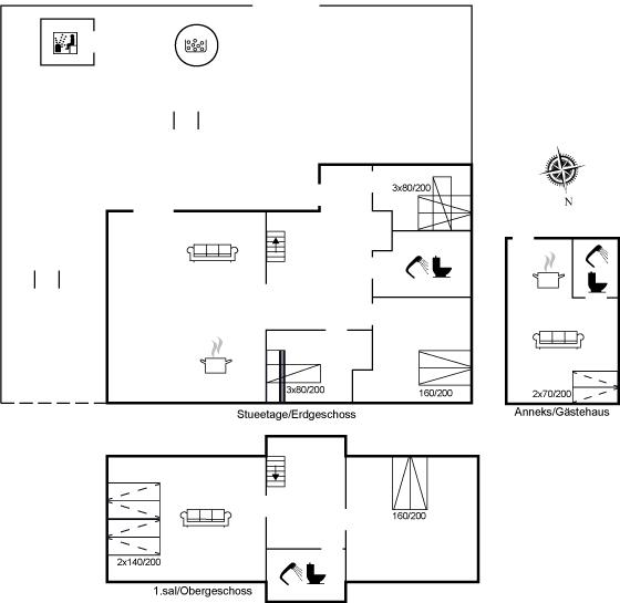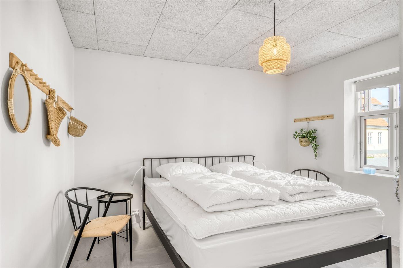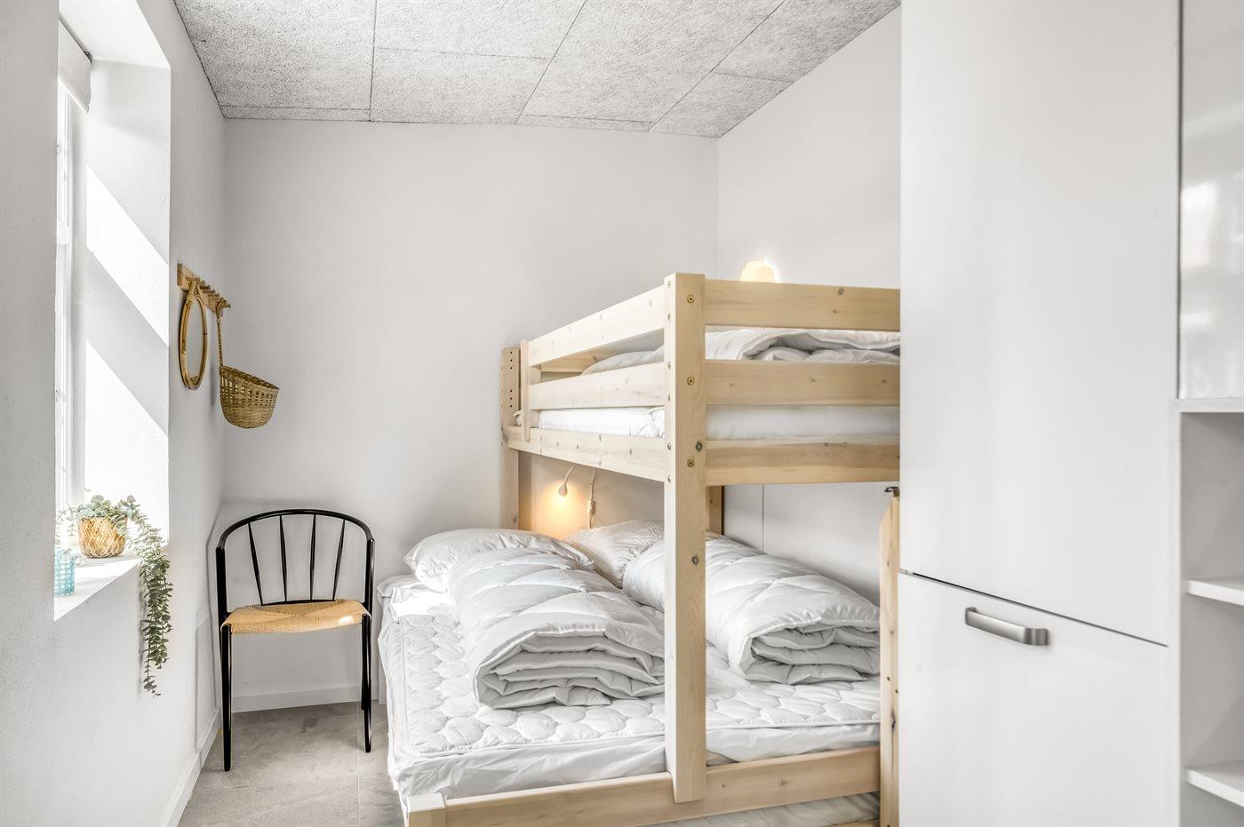 Der er i alt 5 soveværelser + 1 hems. Sovepladserne fordeler sig som følger: I huset 4 sovepladser i luksusdobbeltsenge, 6 sovepladser i køjesenge og 4 sovepladser i sovesofa (dobbelt). I annekset 2 sovepladser på luksusmadrasser på hems med en stabil trappe og 2 sovepladser på sovesofa.
