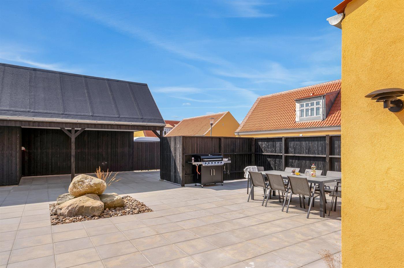 Udendørs er der både åbent terrasseareal og område med sofaarrangement, samt område med afslapning/wellness i udendørs sauna, varmtvandsbruser og standvandsspa til 8 personer. I redskabsrummet er der gode hynder til havemøblerne. Der er en flot gasgrill til rådighed. Der er god bred carport og plads til tre biler i alt. Der er er installeret stik til gratis opladning af elbil med 11 kW ladeeffekt.