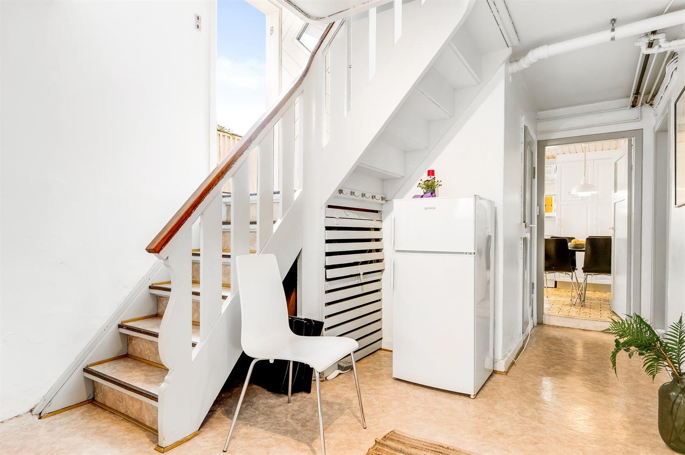 Bemærk: Selvom der er tale om ét samlet lejemål bestående af to lejligheder, er de ikke indbyrdes forbundet, og det er derfor nødvendigt at gå udenfor for at komme fra den ene til den anden.