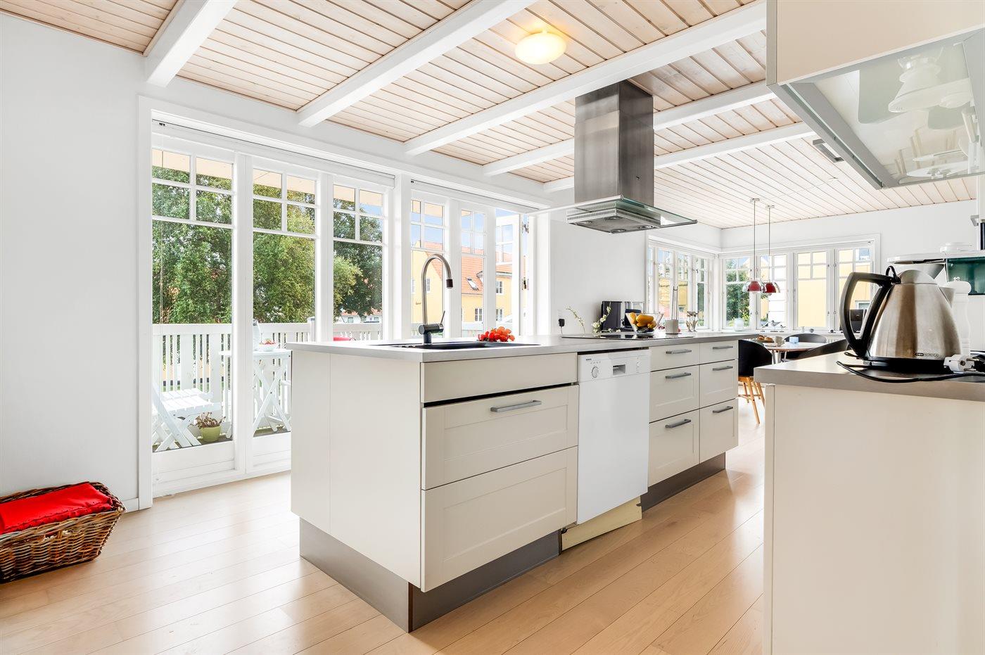 Køkkenet er udstyret med 1 køleskab. Der er 4 induktionskogeplader, varmluftovn, mikrobølgeovn samt opvaskemaskine.