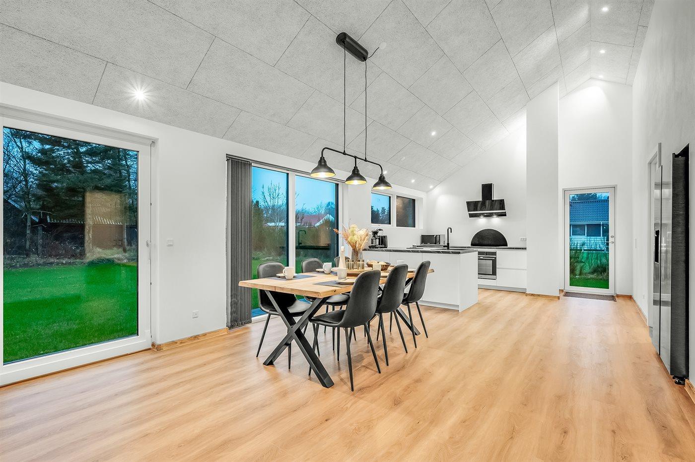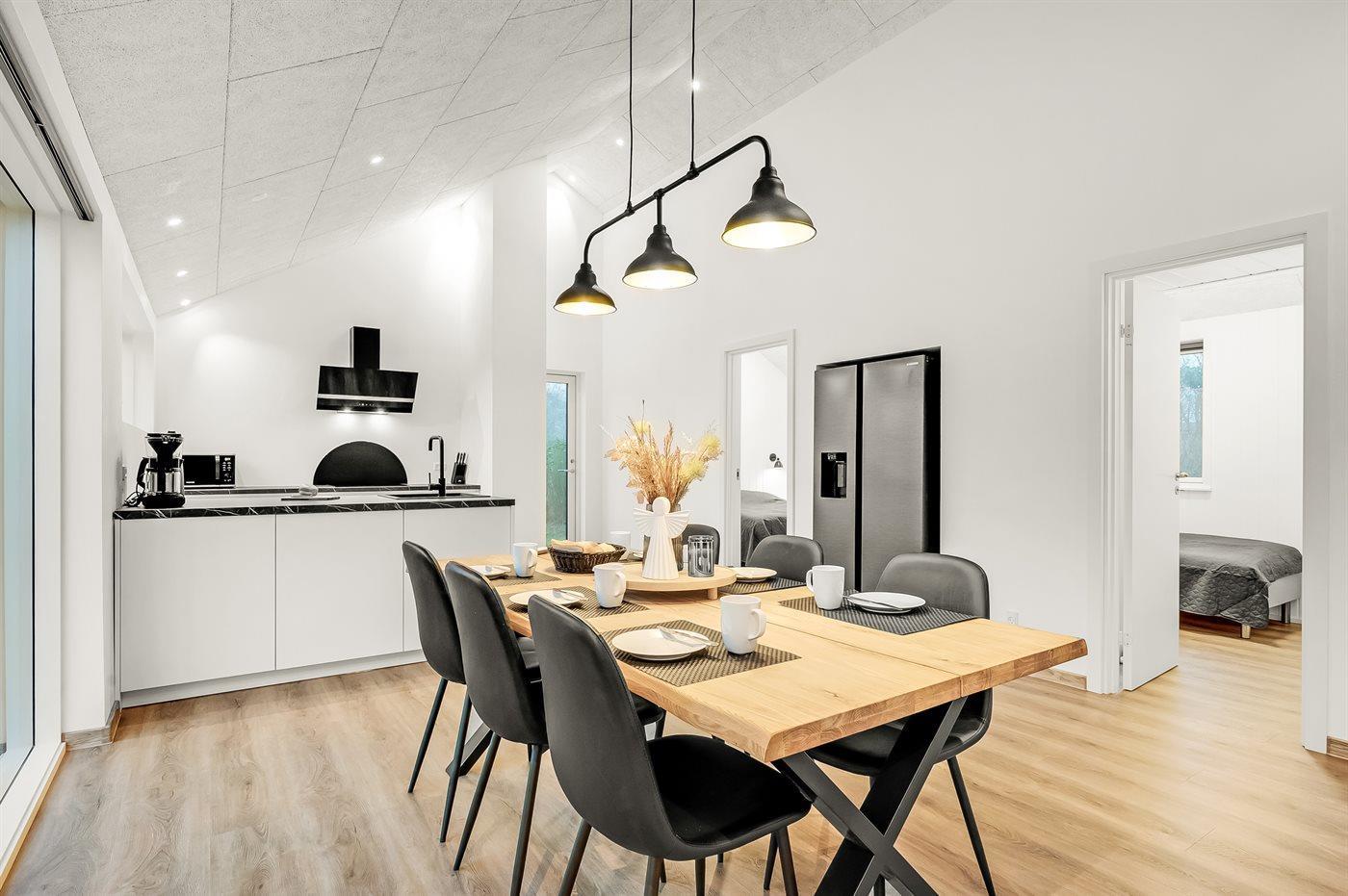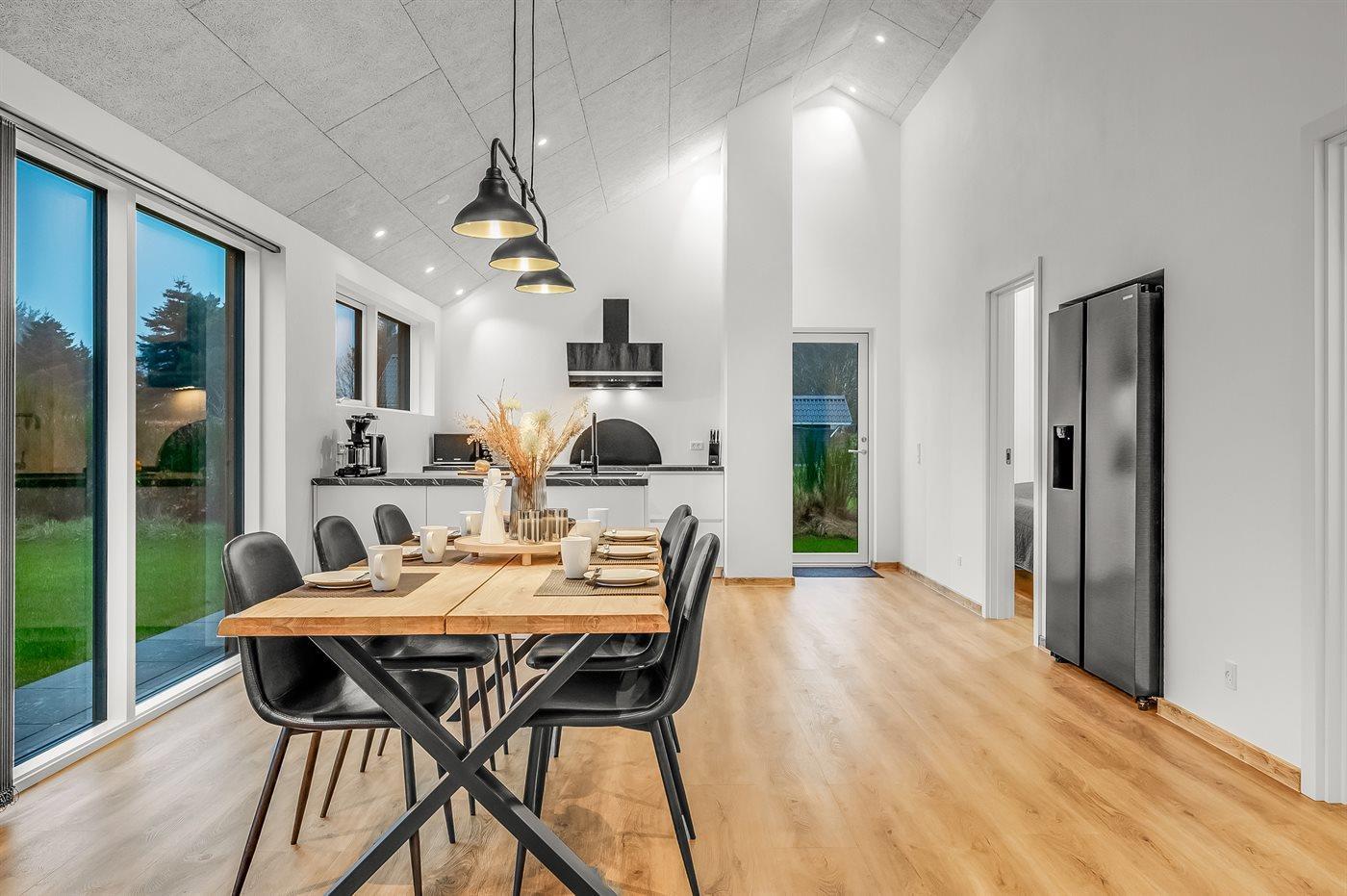 Huset har et åbent opholdsrum, der kombinerer et rummeligt, veludstyret køkken med spise- og opholdsområde, hvor I kan nyde kvalitetstid sammen. Fra opholdsrummet er der direkte adgang til en stor, overdækket terrasse med komfortable havemøbler – perfekt til at slappe af og nyde udendørslivet.