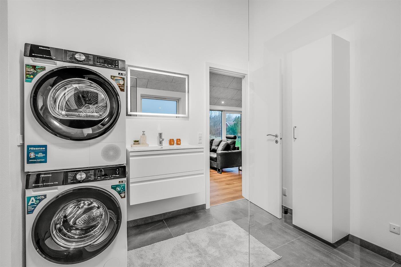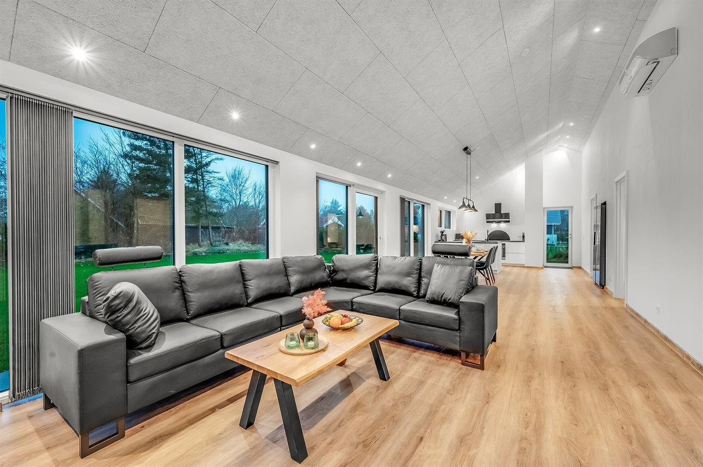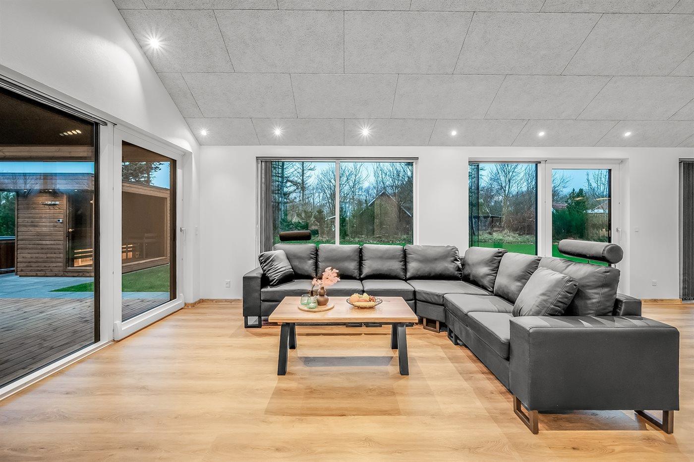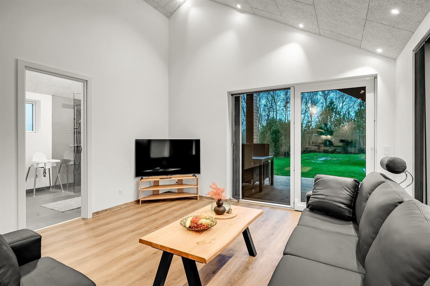 Huset har et åbent opholdsrum, der kombinerer et rummeligt, veludstyret køkken med spise- og opholdsområde, hvor I kan nyde kvalitetstid sammen. Fra opholdsrummet er der direkte adgang til en stor, overdækket terrasse med komfortable havemøbler – perfekt til at slappe af og nyde udendørslivet.