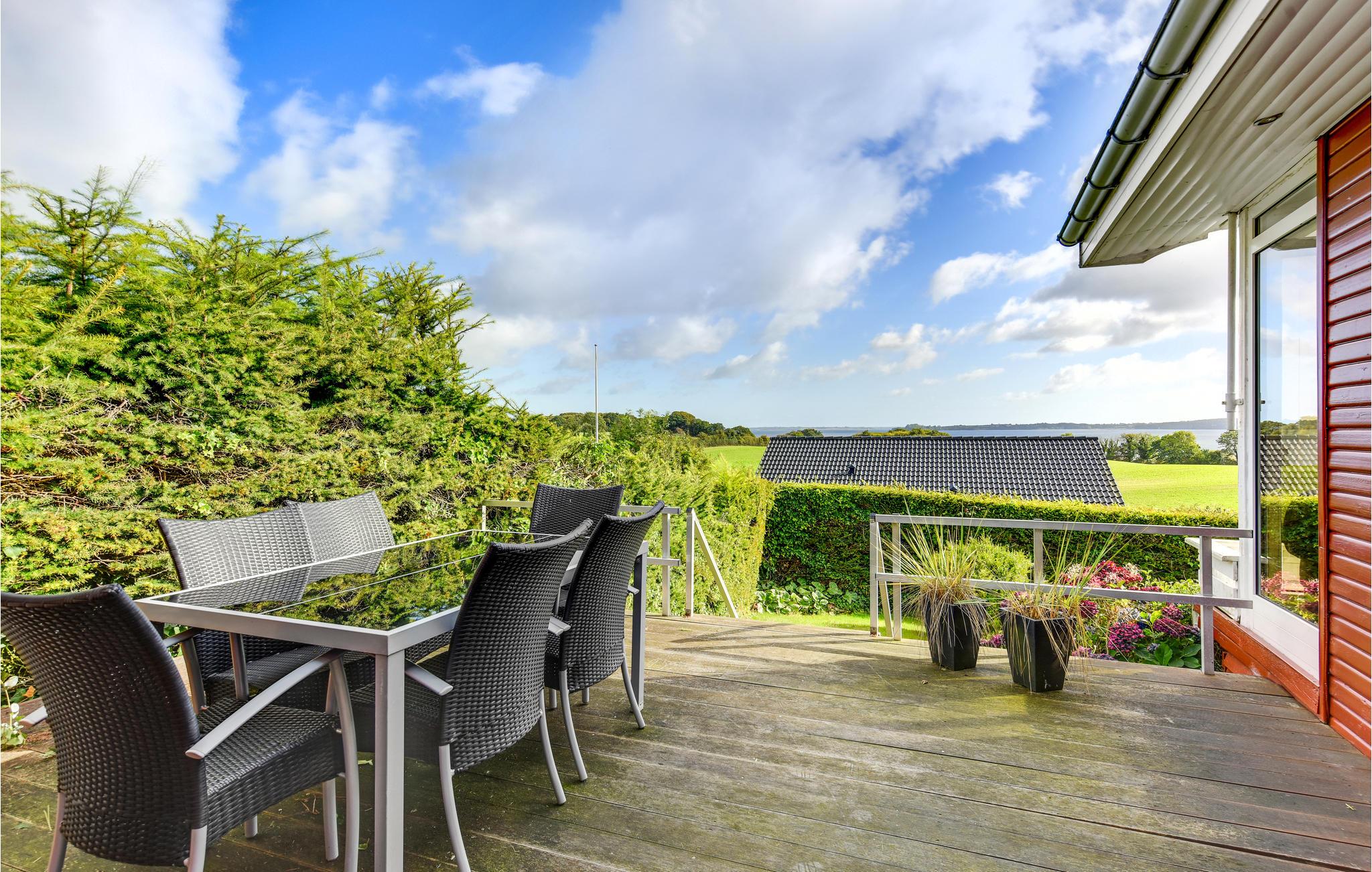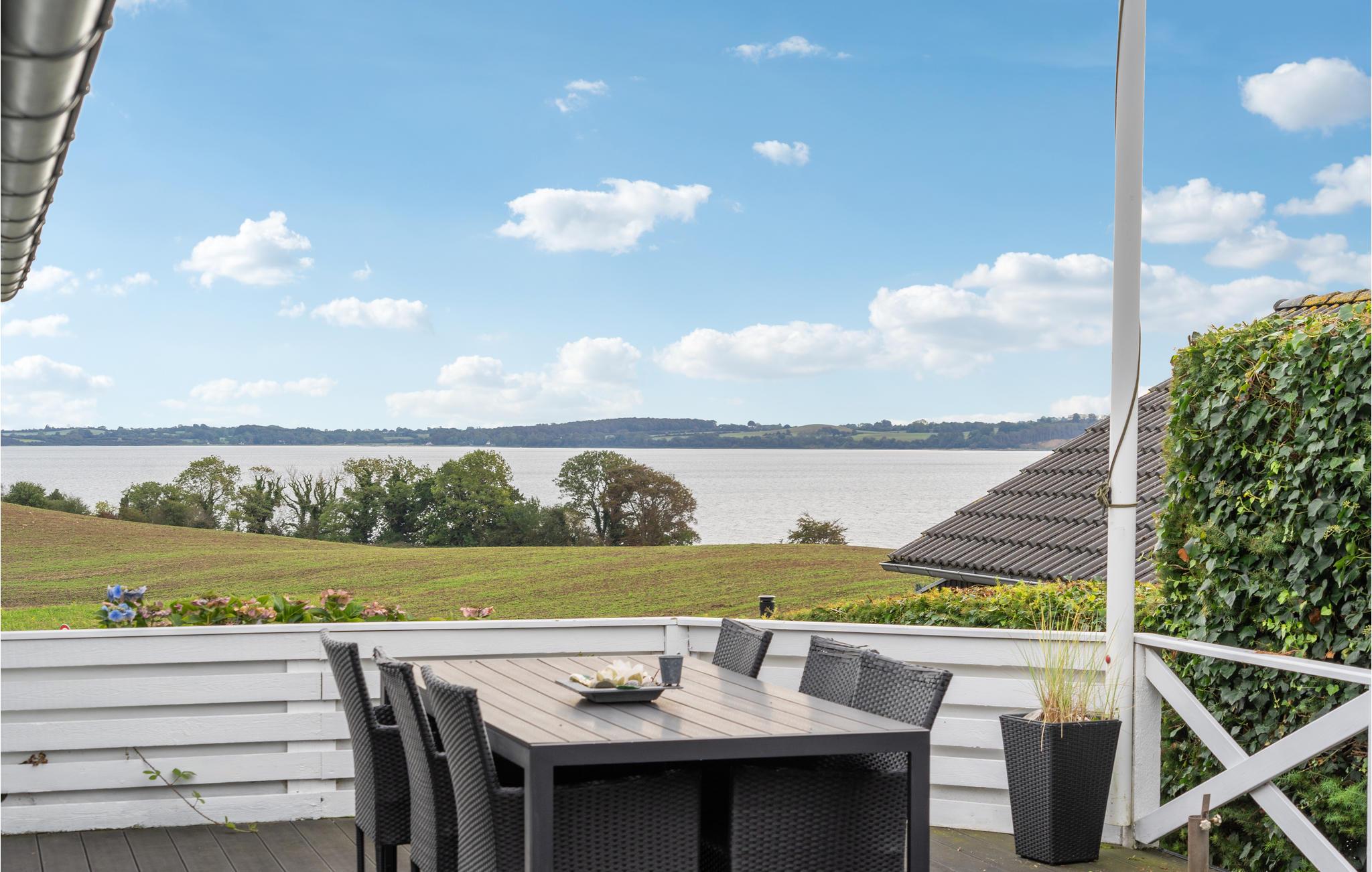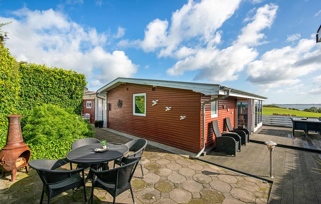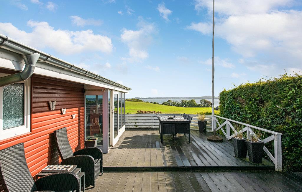 Charmerende sommerhus ved Skarrev Strand med panoramaudsigt over vandet og flere terrasseområder.