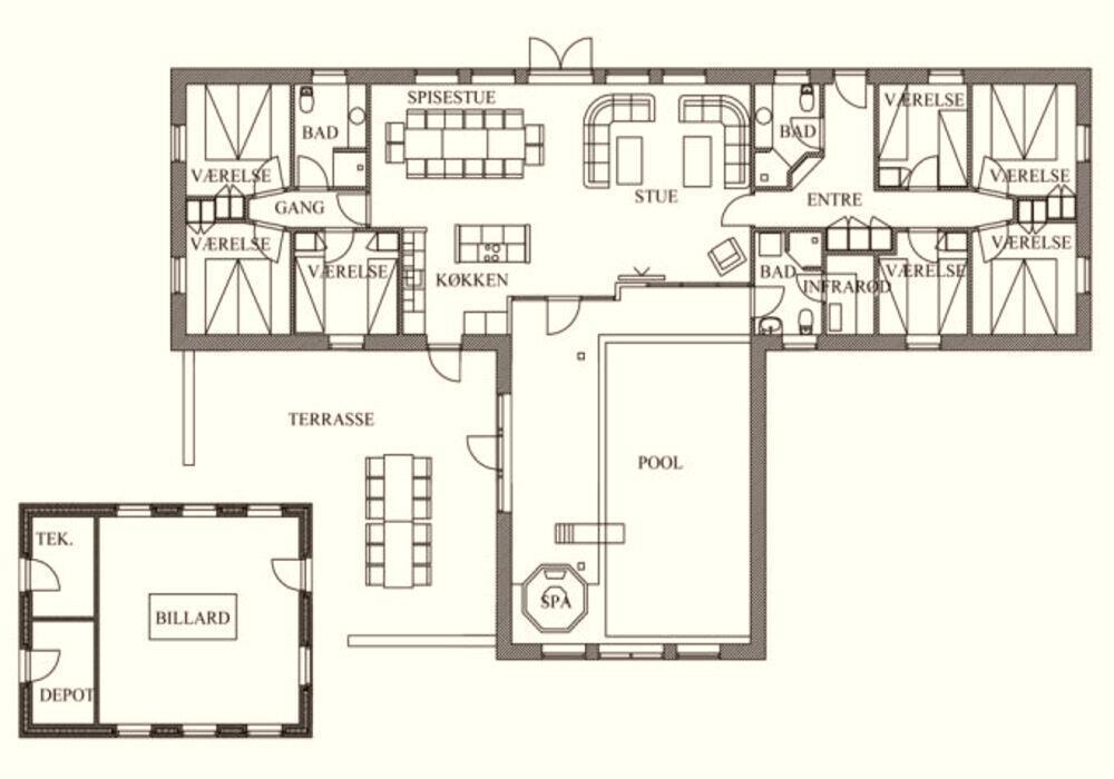7 Soveværelser: (1DS)+(1DS)+(1DS)+(1DS)+(2K)+(2K)+(2S)