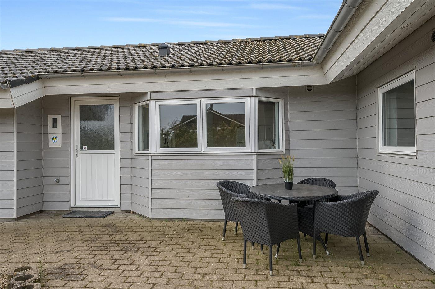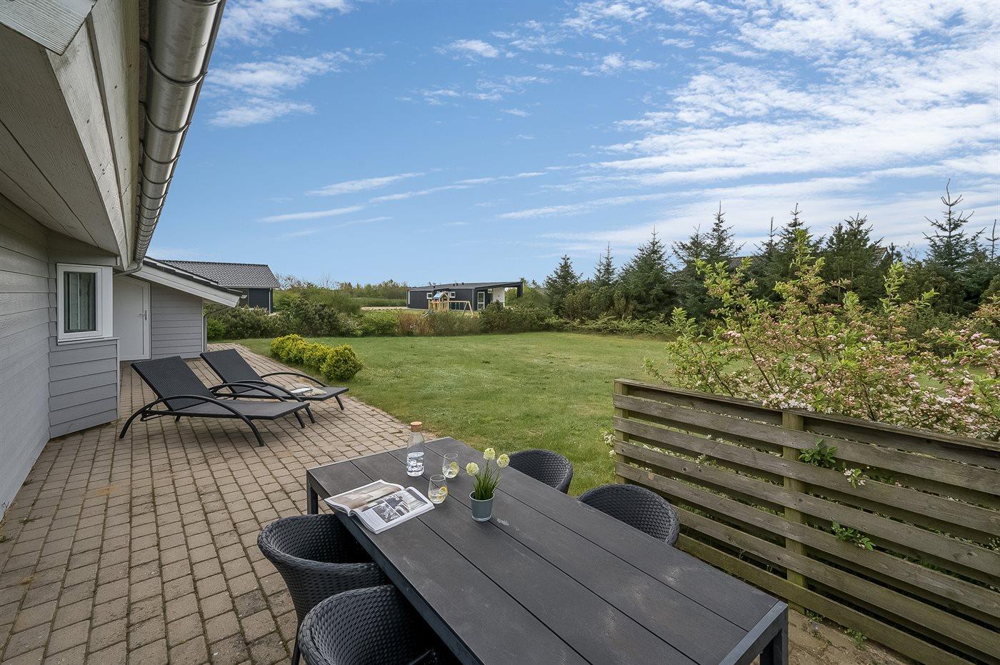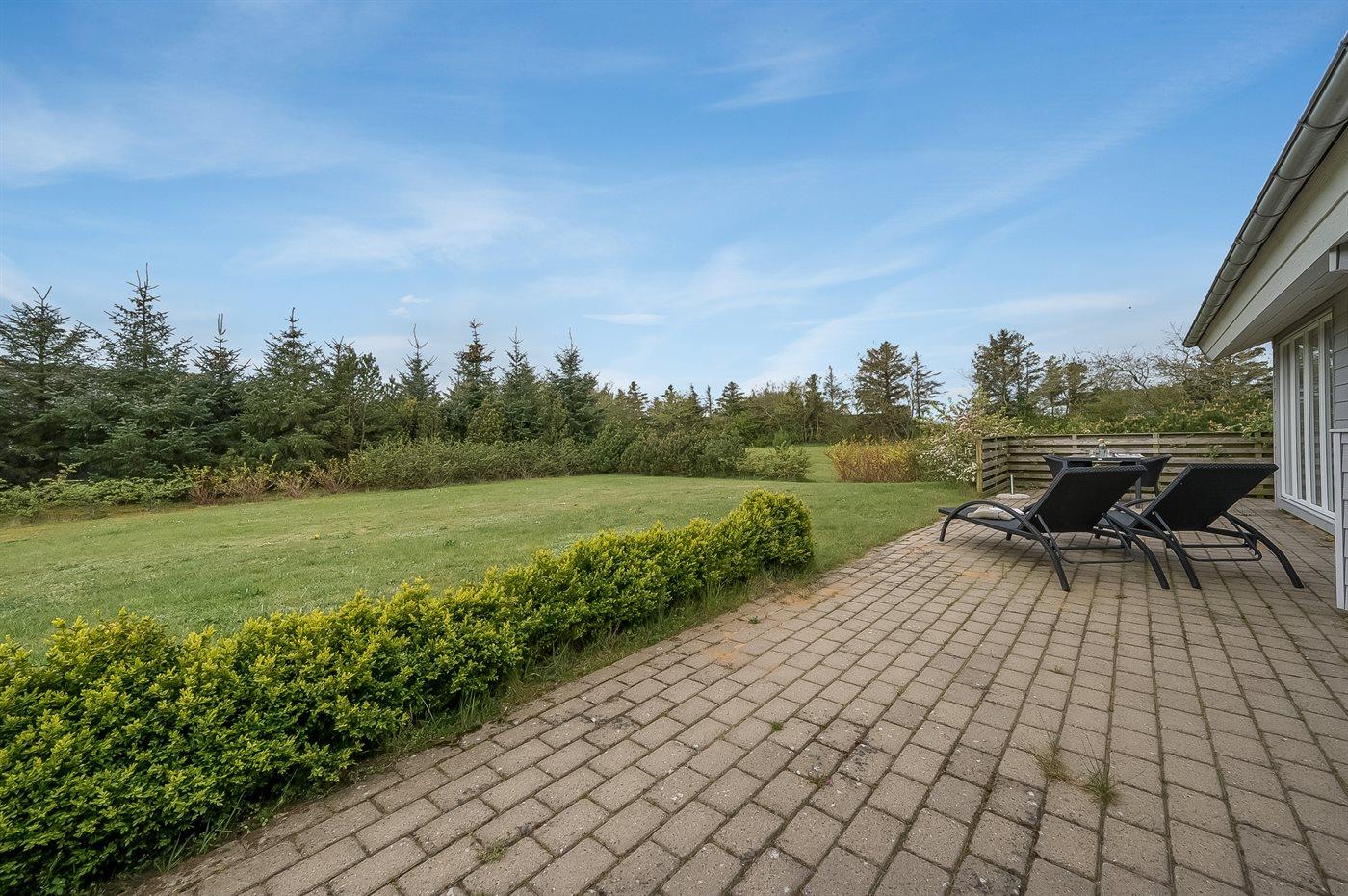 Ferieboligen er beliggende på en 1200 m² stor naturgrund. Der er 750 m til fjorden. Nærmeste forretning er beliggende i en afstand af 700 m. Til ferieboligen hører 100 m² terrasseareal. Desuden er der 10 m² overdækket terrasse. Der ligger en legeplads i en afstand af 200 m. Parkering ved ferieboligen.