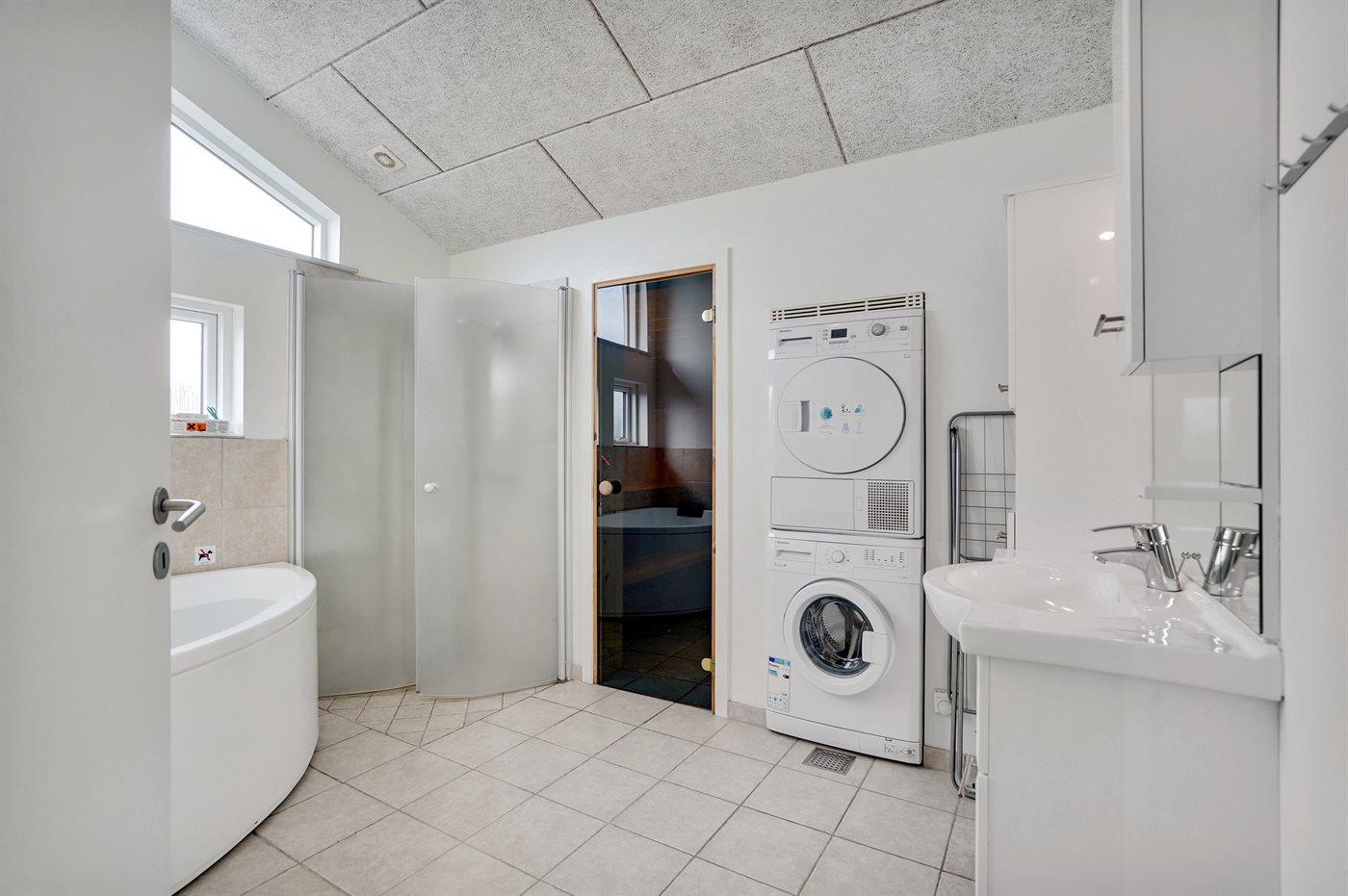 Der er 2 badeværelser med bruseniche og 2 toiletter. Der er gulvvarme på 2 badeværelser. I saunaen er der mulighed for afslapning.