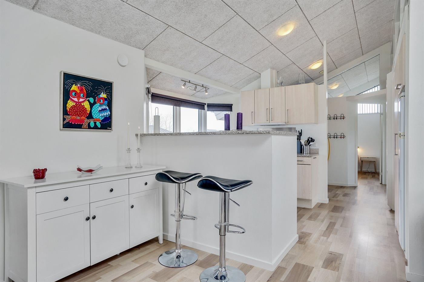 Køkkenet er udstyret med 1 køleskab. Der er 4 keramiske kogeplader, varmluftovn, mikrobølgeovn samt opvaskemaskine.