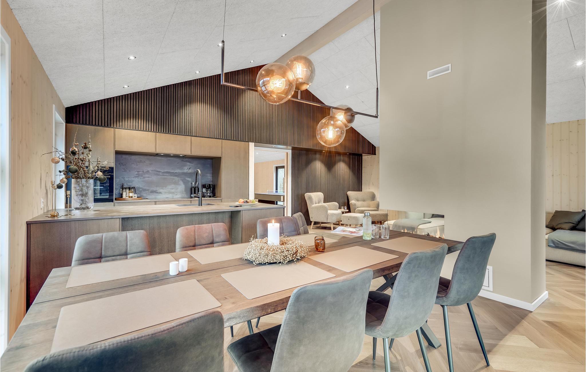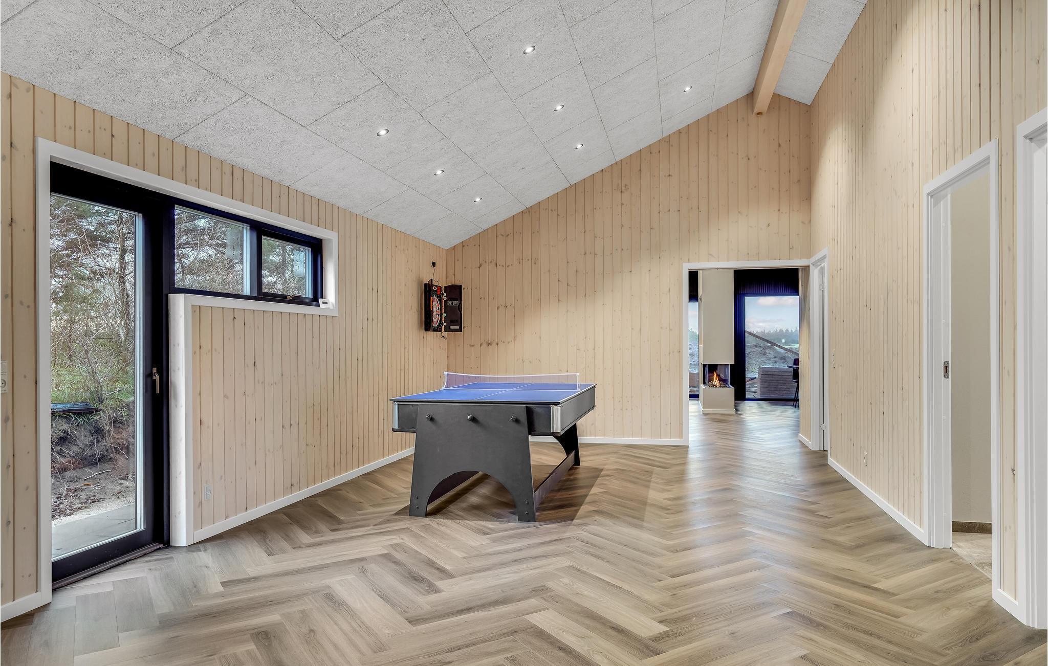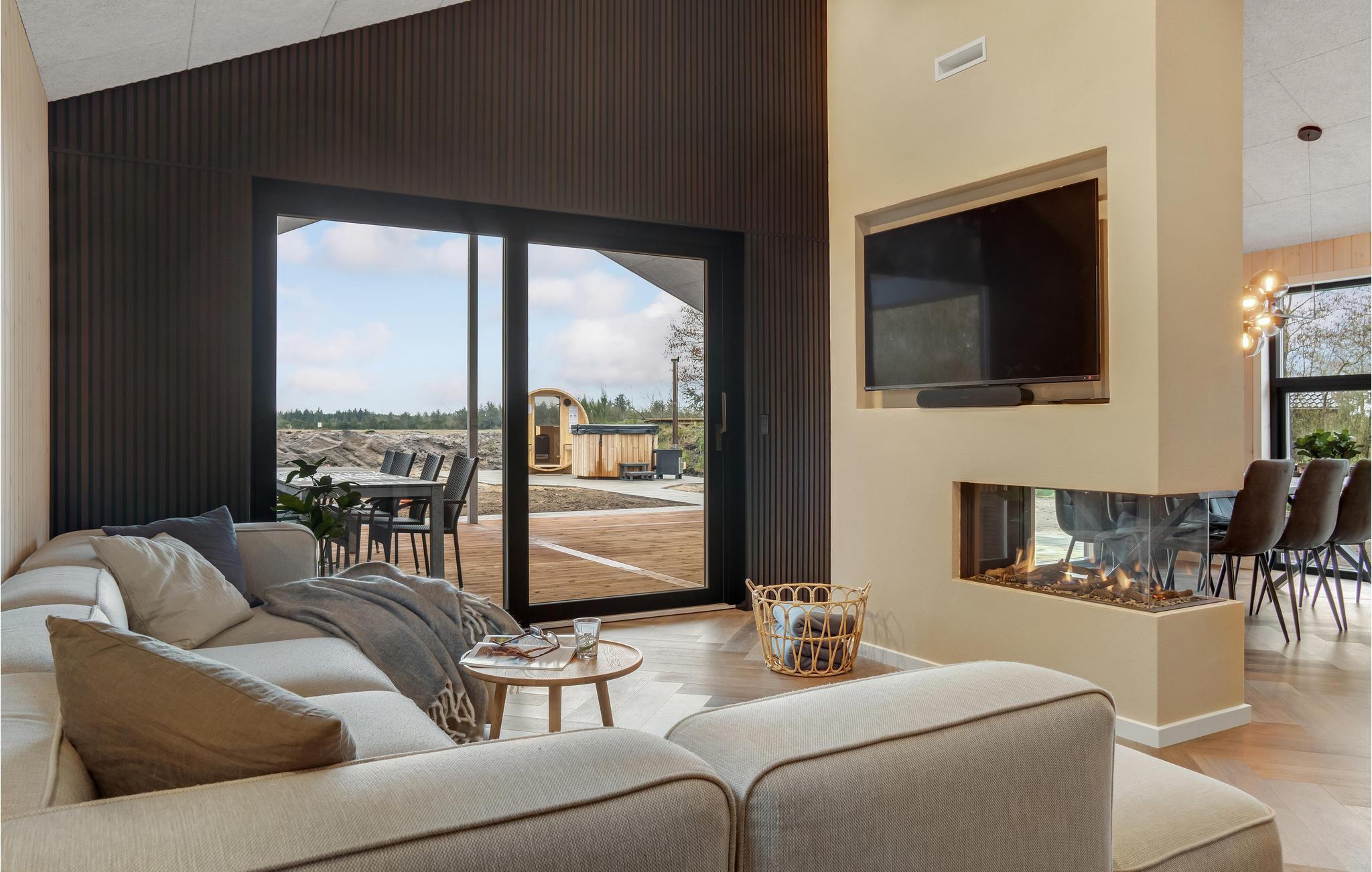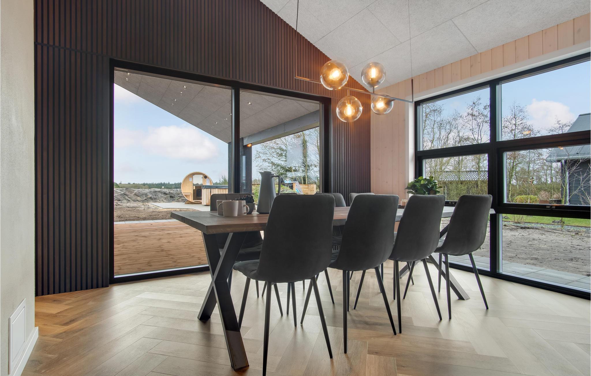 Huset ligger kun en kort lille gåtur fra Ringkøbing Fjord, og der er kælet for hver en detalje i indretningen. Glem alt om den travle hverdag og nyd de helt særlige rammer både ude og inde. Læn jer tilbage med et glas vin i sofaen og nyd udsigten til landskabet gennem det store panoramavindue, som virker meget beroligende. Når I er klar til at spise, er det til samme vidunderlige udsigt, så her kan I give jer god tid til at sidde og snakke længe efter. Vil I skrue ekstra op for forkælelsen oven på en lang dag i naturen, kan I sætte jer til rette i saunaen eller spabadet, hvis I ikke hellere vil blive i stuen og nyde varmen fra brændeovnen.