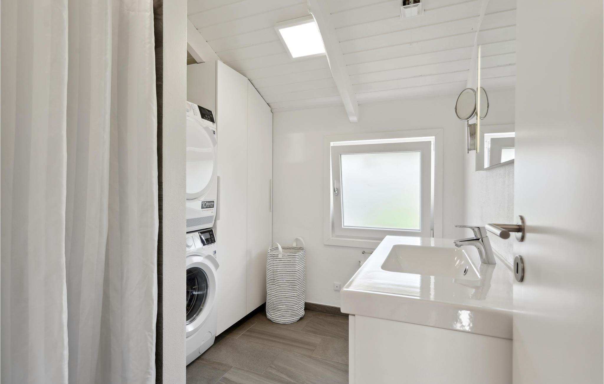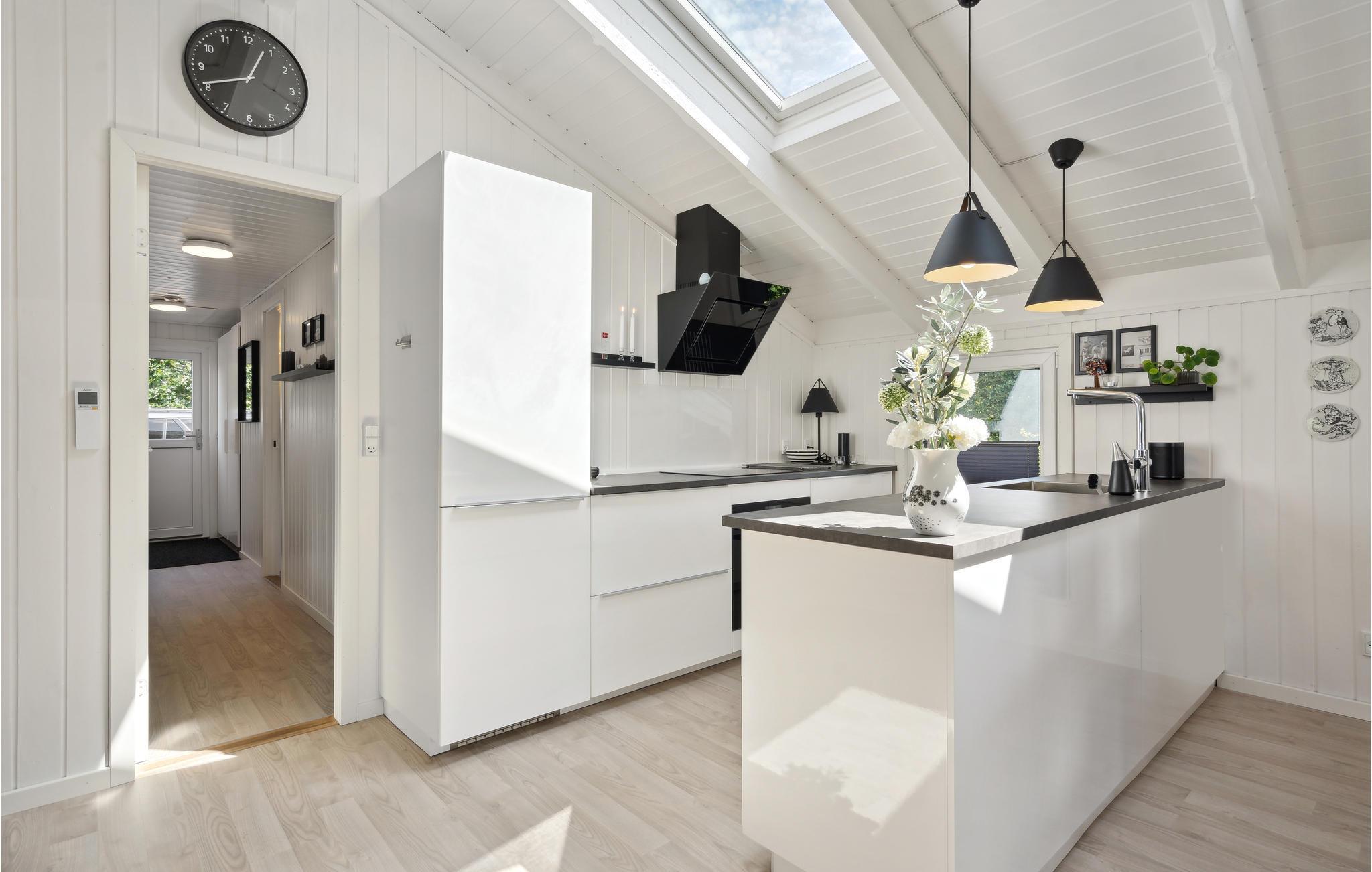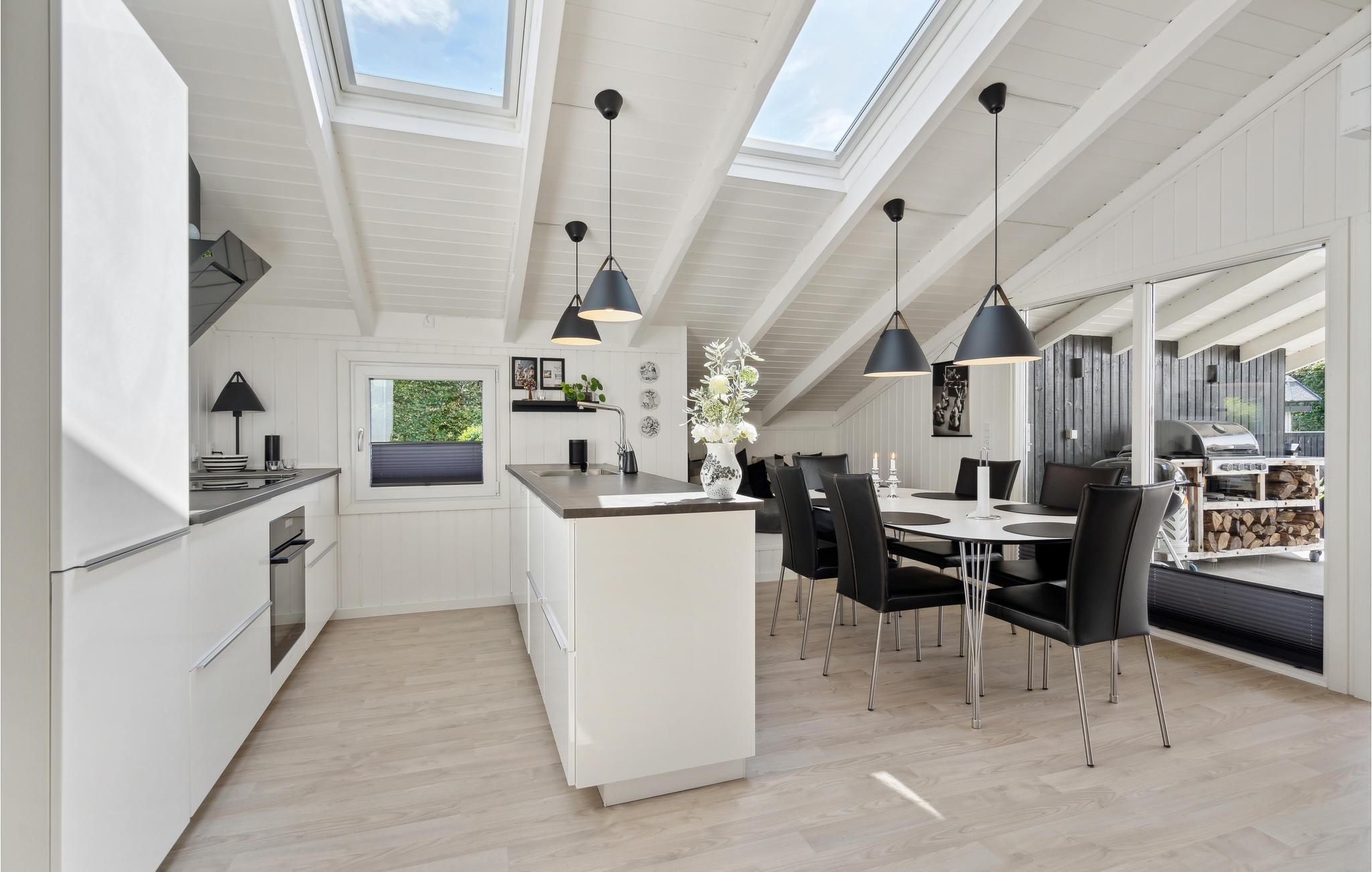 Ideelt beliggende nær Ringkøbing Fjord og vidunderlig natur indbyder dejlige feriehus i Skaven Strand til oplevelser for hele familien. De lyse værelser er moderne og komfortabelt indrettet og danner den ideelle ramme om en velgørende ferie spækket med strandhygge, naturoplevelser og spændende udflugter. Valget af hvid og en markant sort giver huset kant og en særlig charme. De høje lofter, de store vinduer og ovenlysvinduerne skaber en lys atmosfære, hvor alle vil føle sig godt tilpas. Sæt jer godt til rette i den store hjørnesofa om aftenen, hvor I kan hygge med lidt god vin, mens flammerne knitrer i brændeovnen. Nyd solen i fulde drag på terrassen og servér lækre retter fra grillen. Senere kan mor og far forkæle sig selv med en tur i vildmarksbadet.