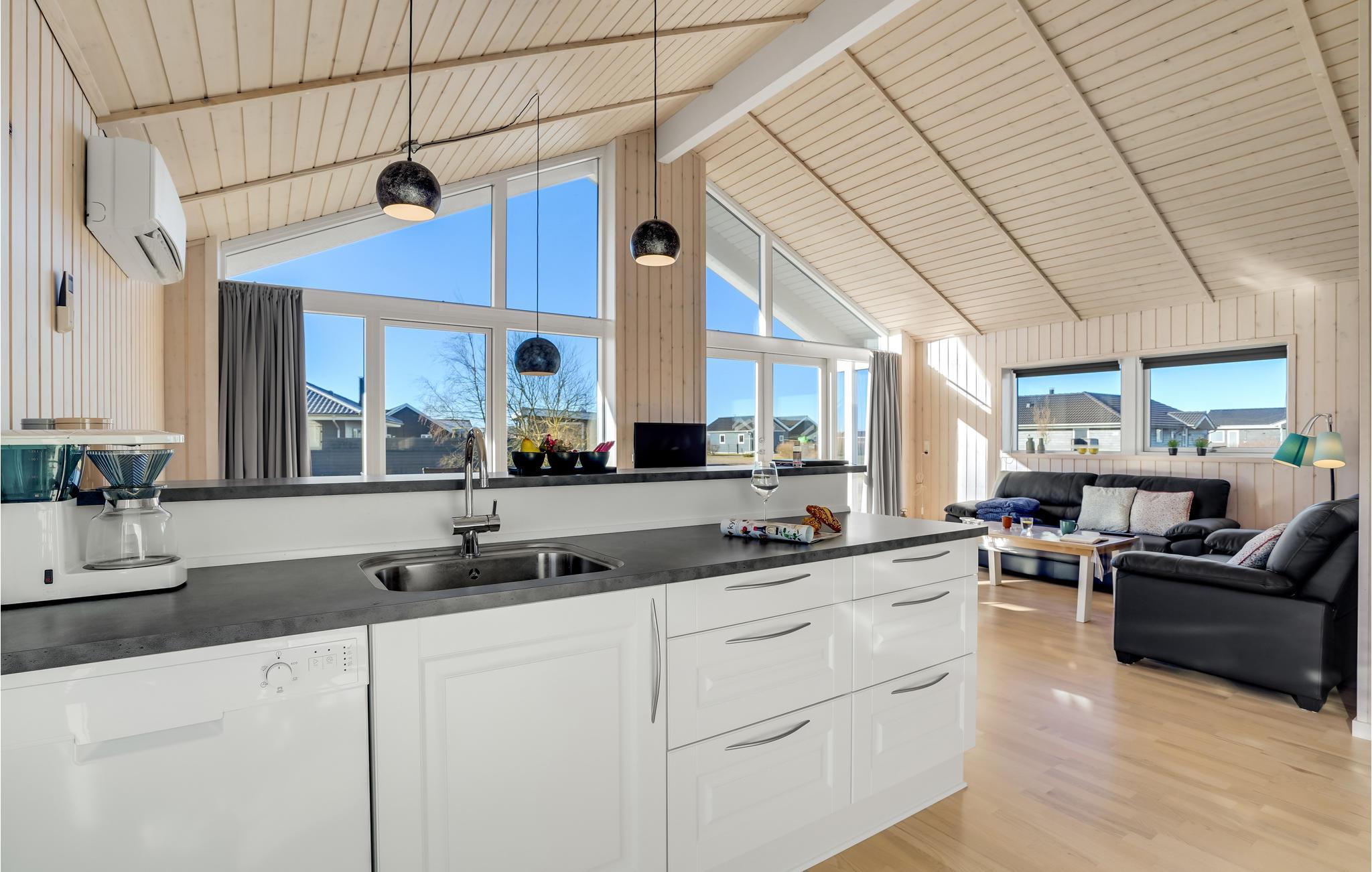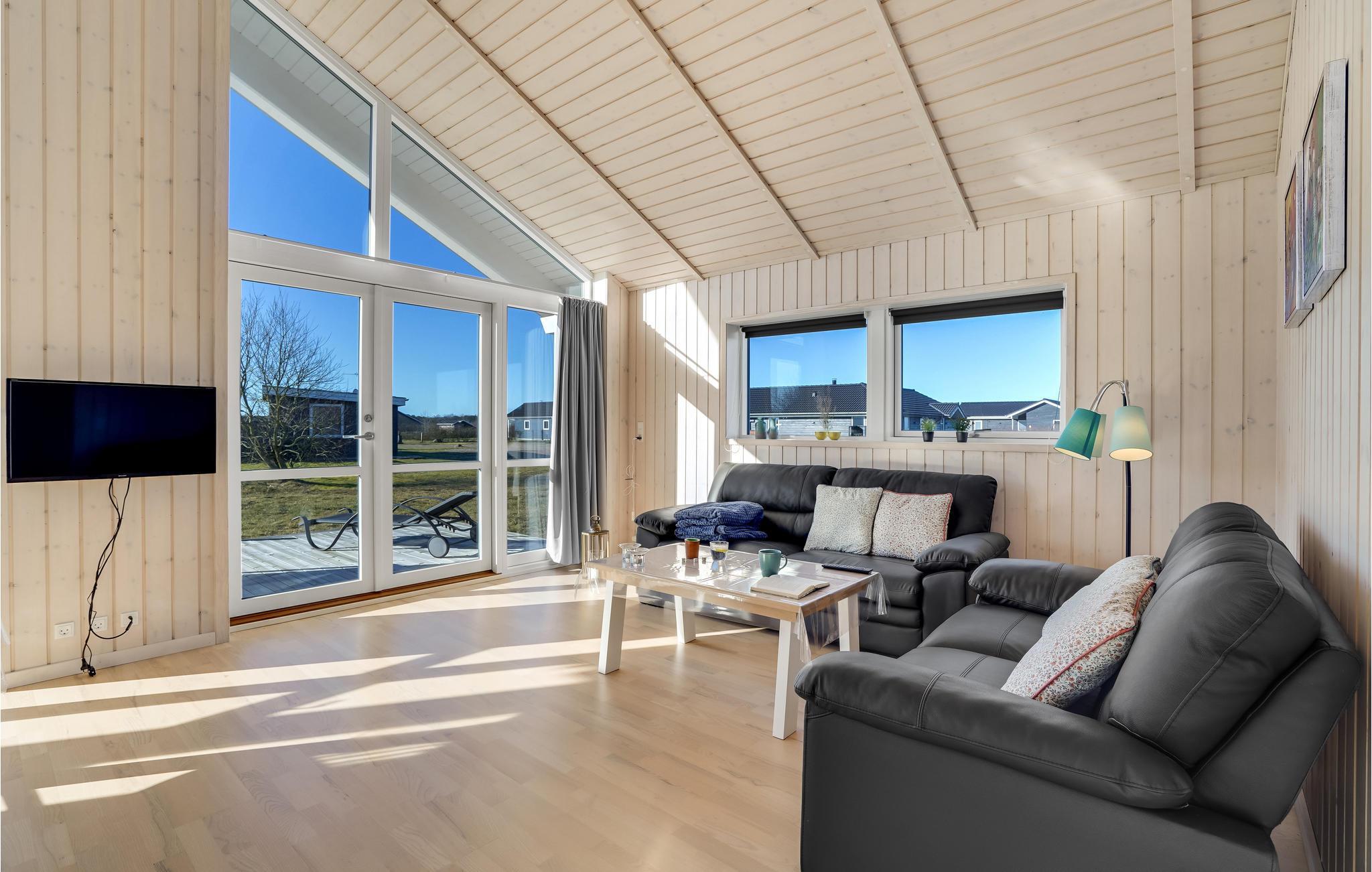 I husets lyse rum kan I slappe af med hele familien på alle tider af året. Den hyggelige indretning med et smukt lysindfald gennem den store glasfront sørger for en hyggelig atmosfære. Lav mad sammen med en vidunderlig udsigt til haven, nyd måltiderne ved spisebordet, hvor I også nyder en smuk udsigt. Senere kan I føle jer godt tilpas i siddeområdet og lade jeres blik vandre over det omkringliggende grønne område. Feriehusets udendørsområde indbyder til mange glade timer i det fri. Nyd solen på terrassen, slap af i en liggestol og afslut en dejlig dag med et måltid fra grillen.