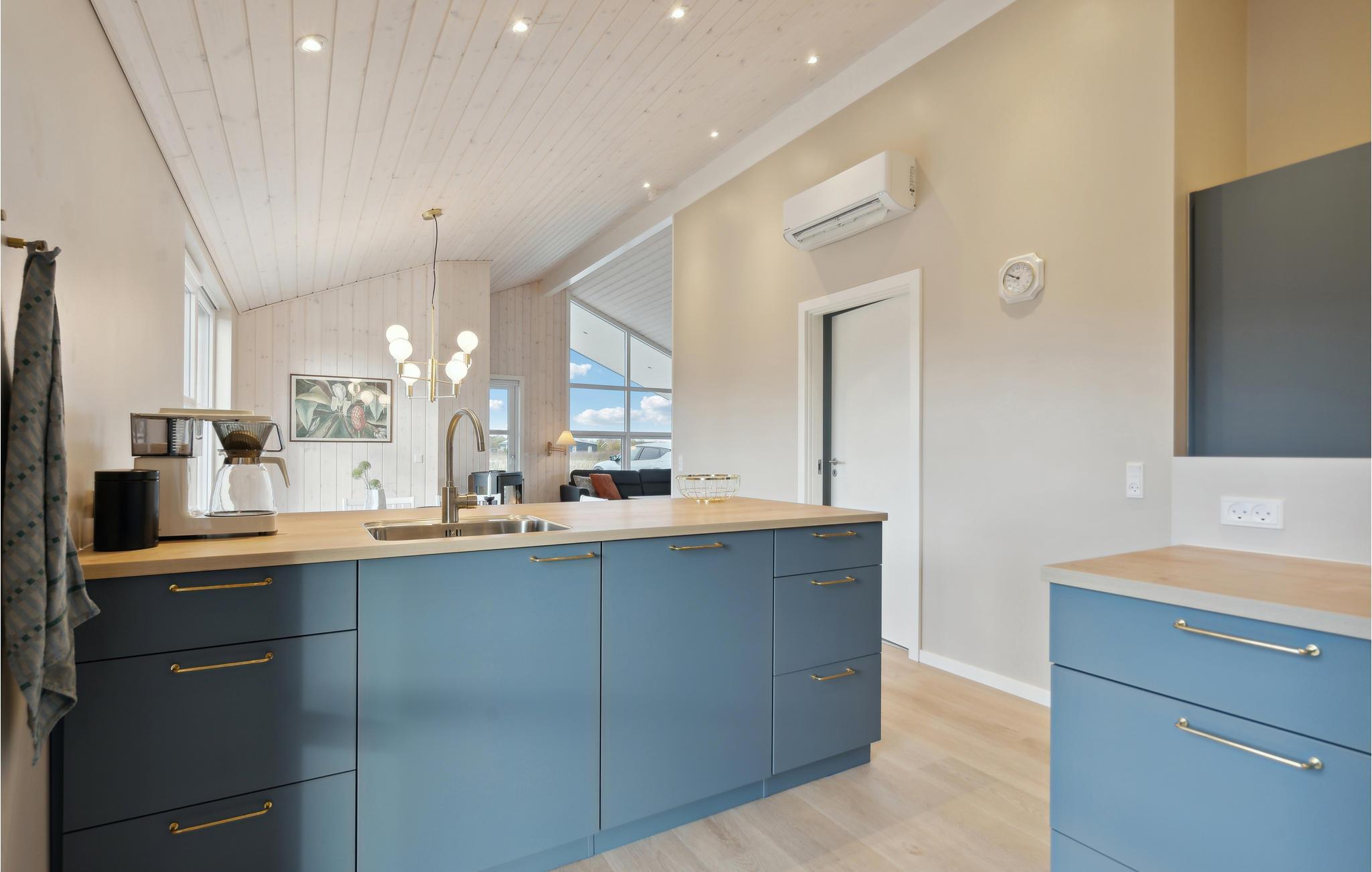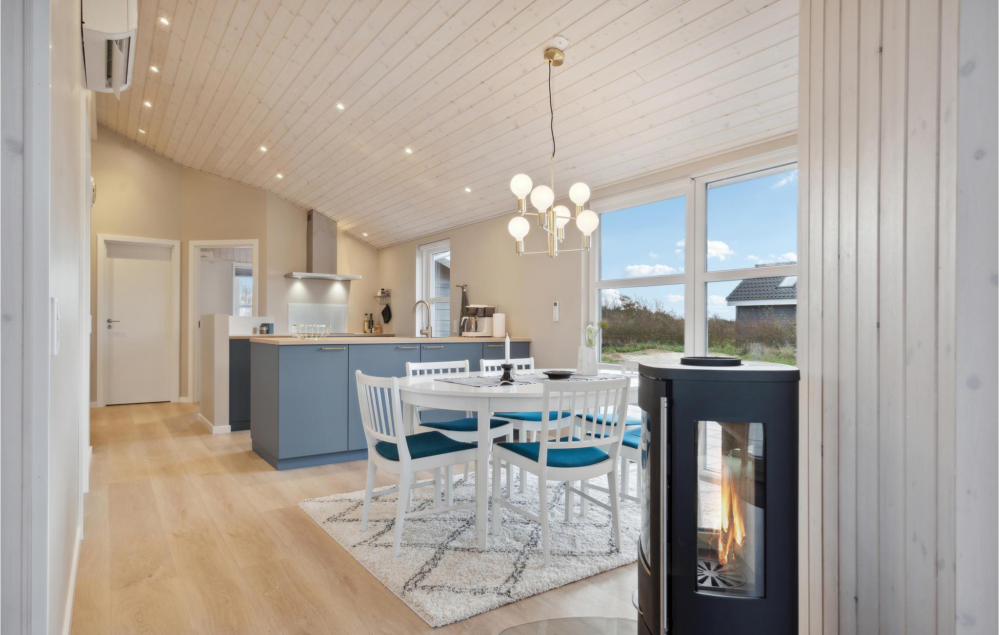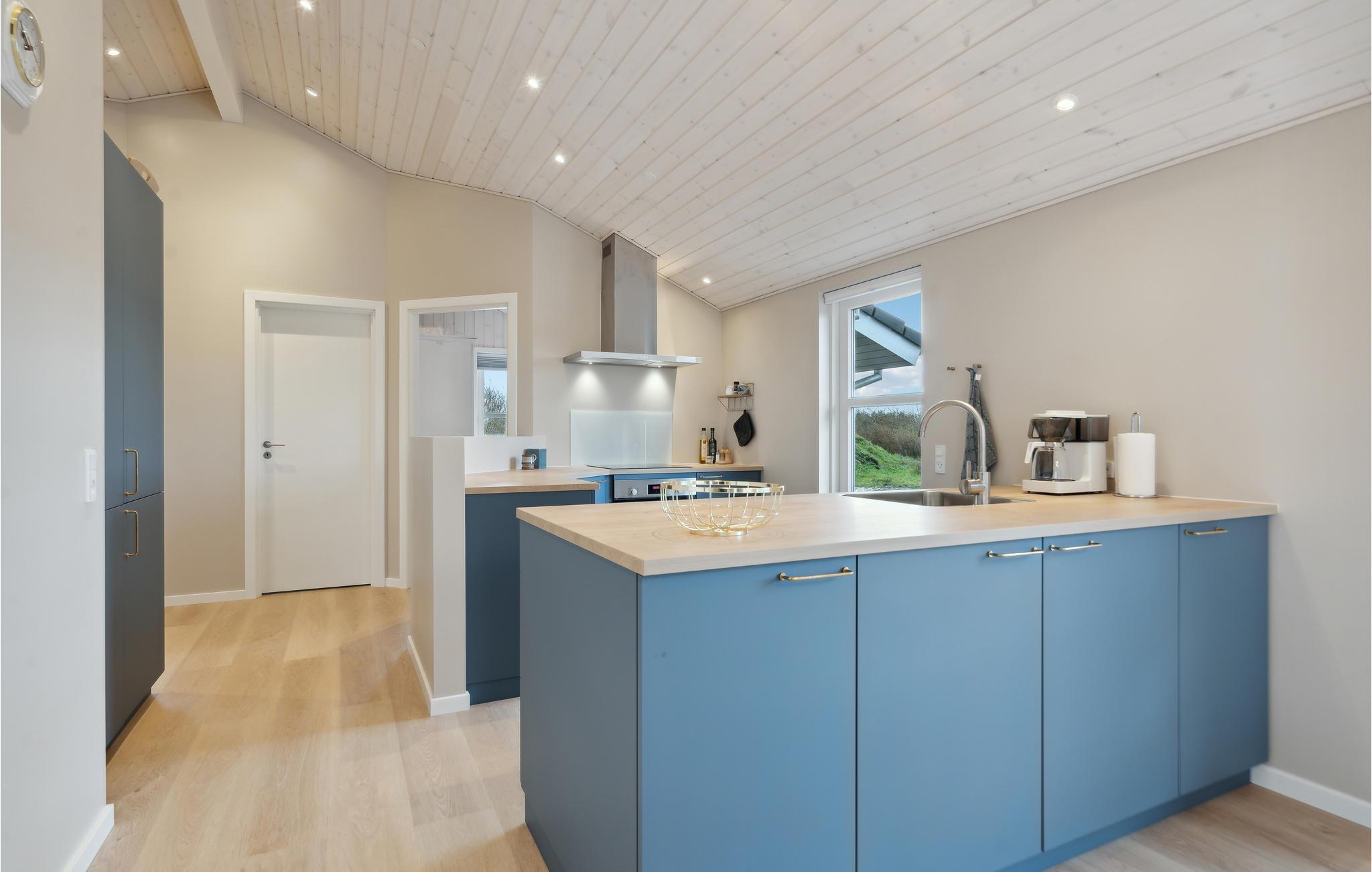 Den lyse opholdsstue med store vinduer og masser af naturligt lys lægger op til at slappe af og tilbringe tid sammen. Gør det behageligt i den hyggelige sofa, spil spil sammen eller nyd en filmaften. På kølige dage sørger brændeovnen for hyggelig varme. Det moderne køkken med køkkenø tilbyder masser af plads til madlavning og er åbent til spiseområdet. En sauna og et spabad er til rådighed til jeres afslapning.