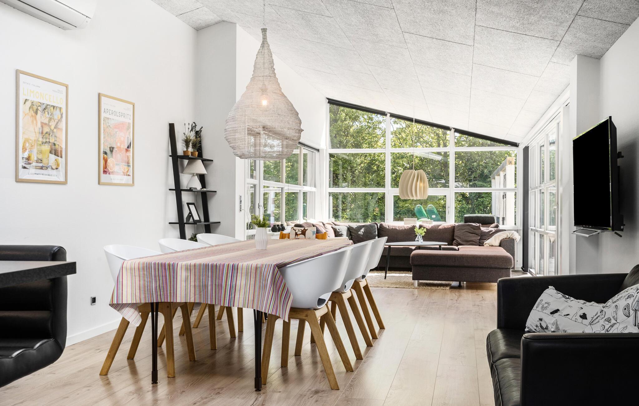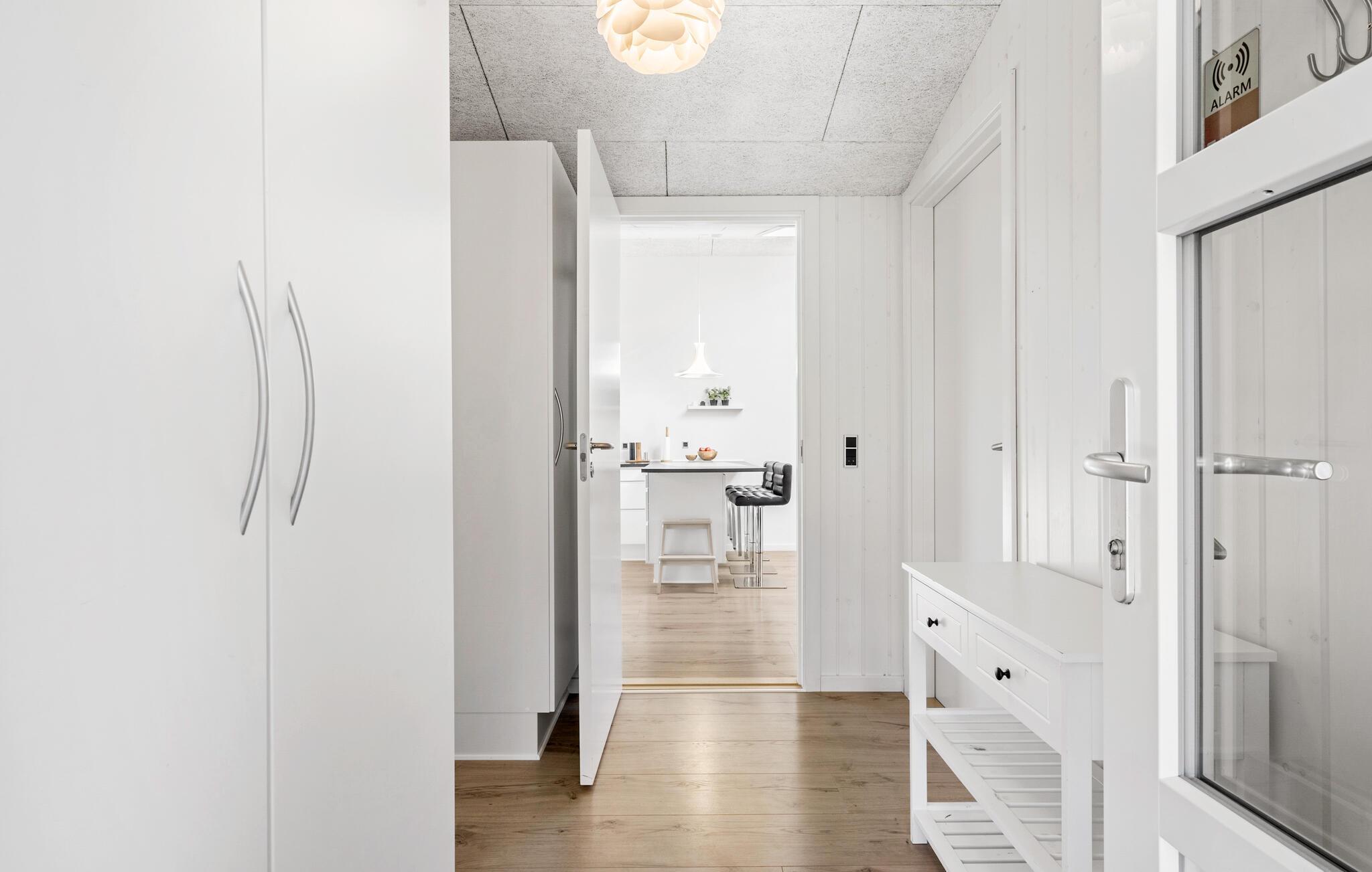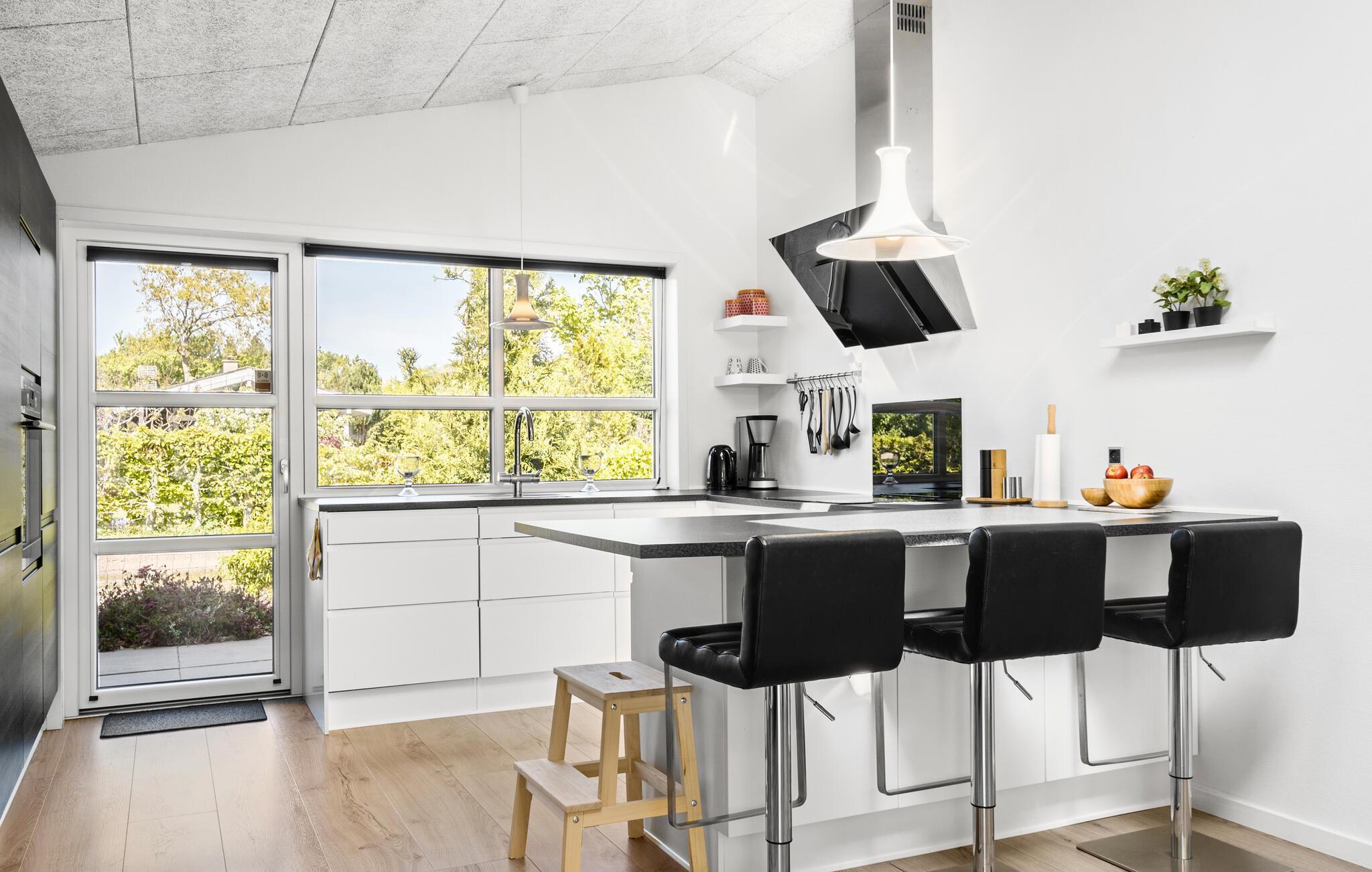 En rolig beliggenhed, stilfuldt interiør og rummelige rammer - her får I de bedste betingelser for nogle afslappende dage med familie eller venner. Tilbered lækre retter sammen i det åbne køkken. Den tilstødende spiseplads i den lyse opholdsstue lægger op til en masse hyggestunder. Nyd udsigten til den dejlige have gennem de store vinduespartier og læn jer tilbage i det komfortable sofahjørne. Efter en lang dag på farten kan I slappe af i spabadet på badeværelset og lade batterierne op til flere oplevelser.