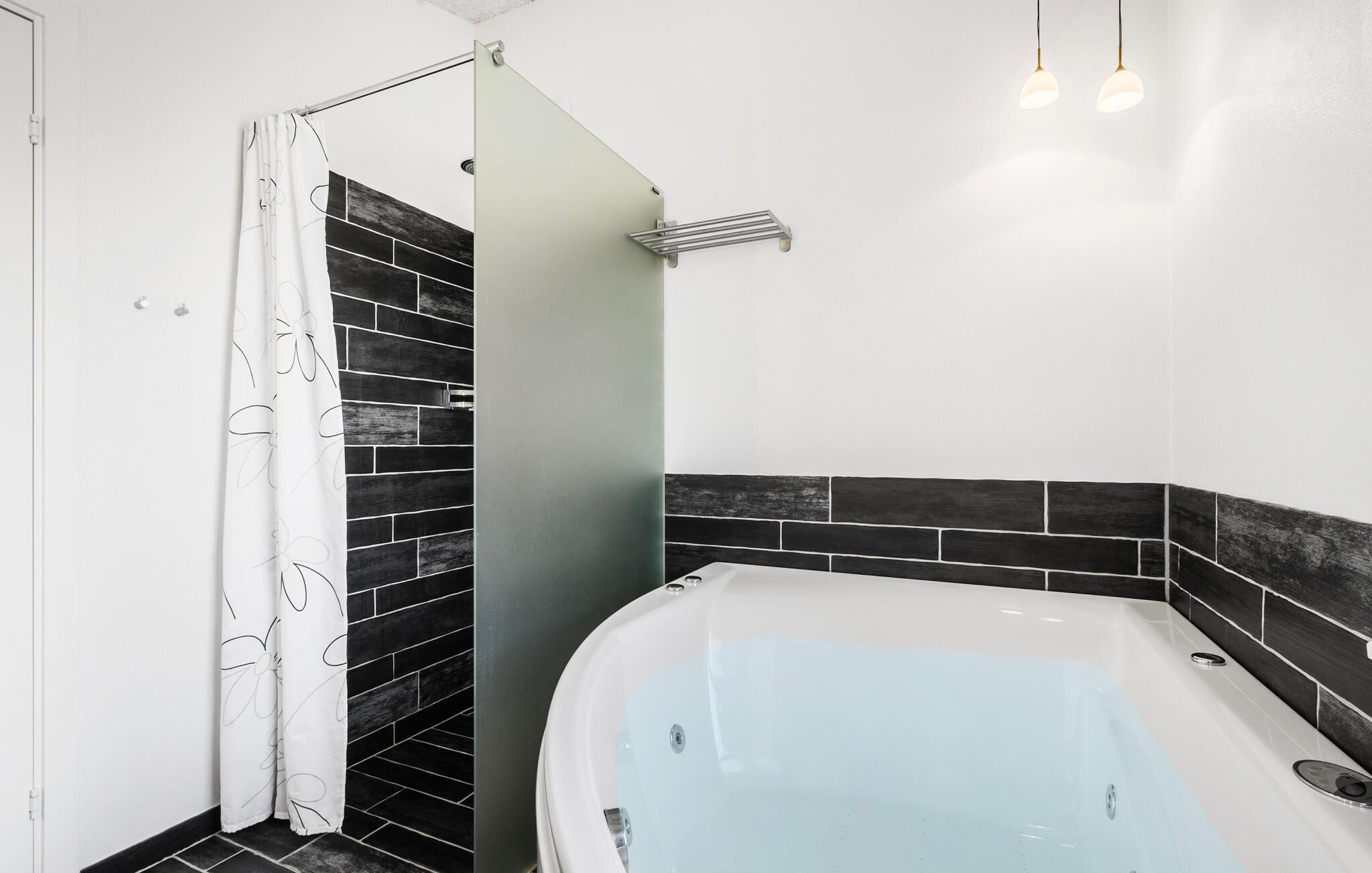 Moderne feriehus nær Skaven Strand med stor terrasse og spabad for afslapning.