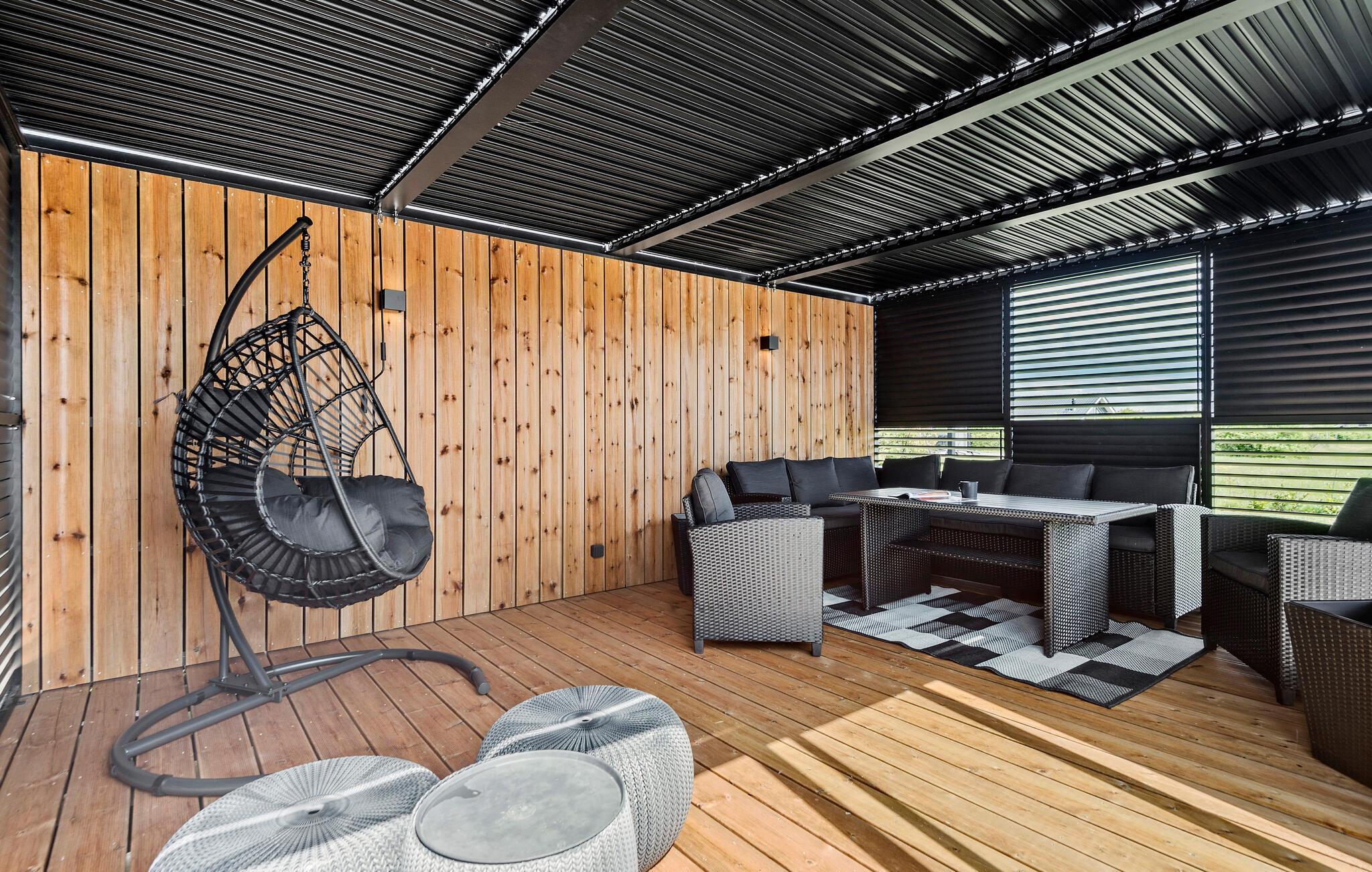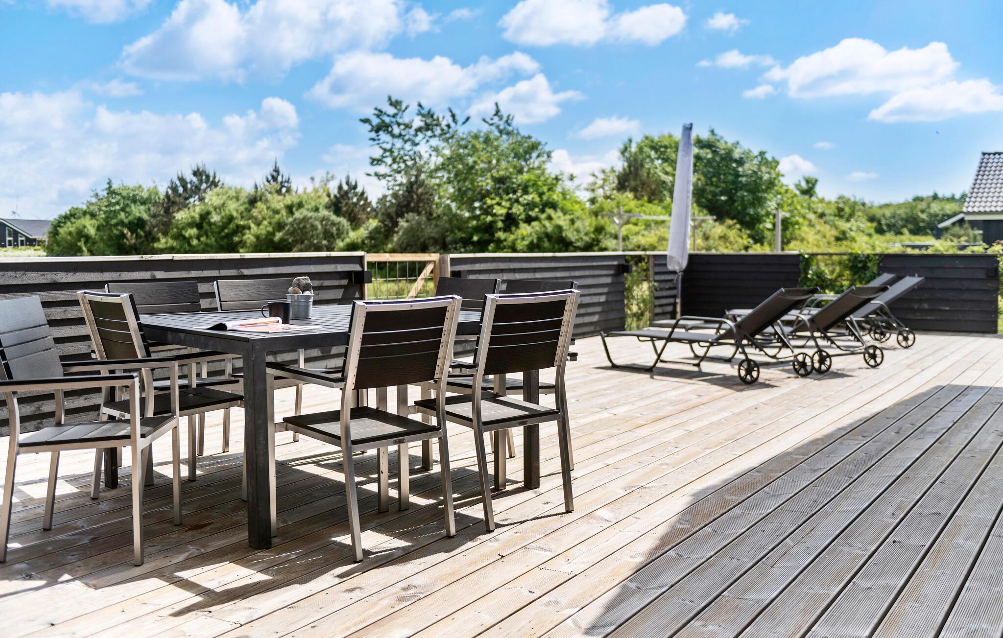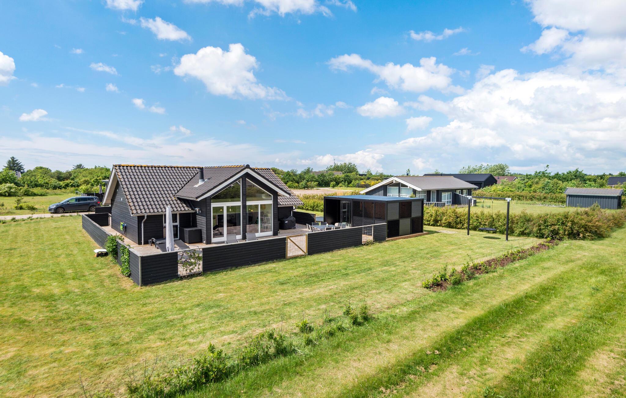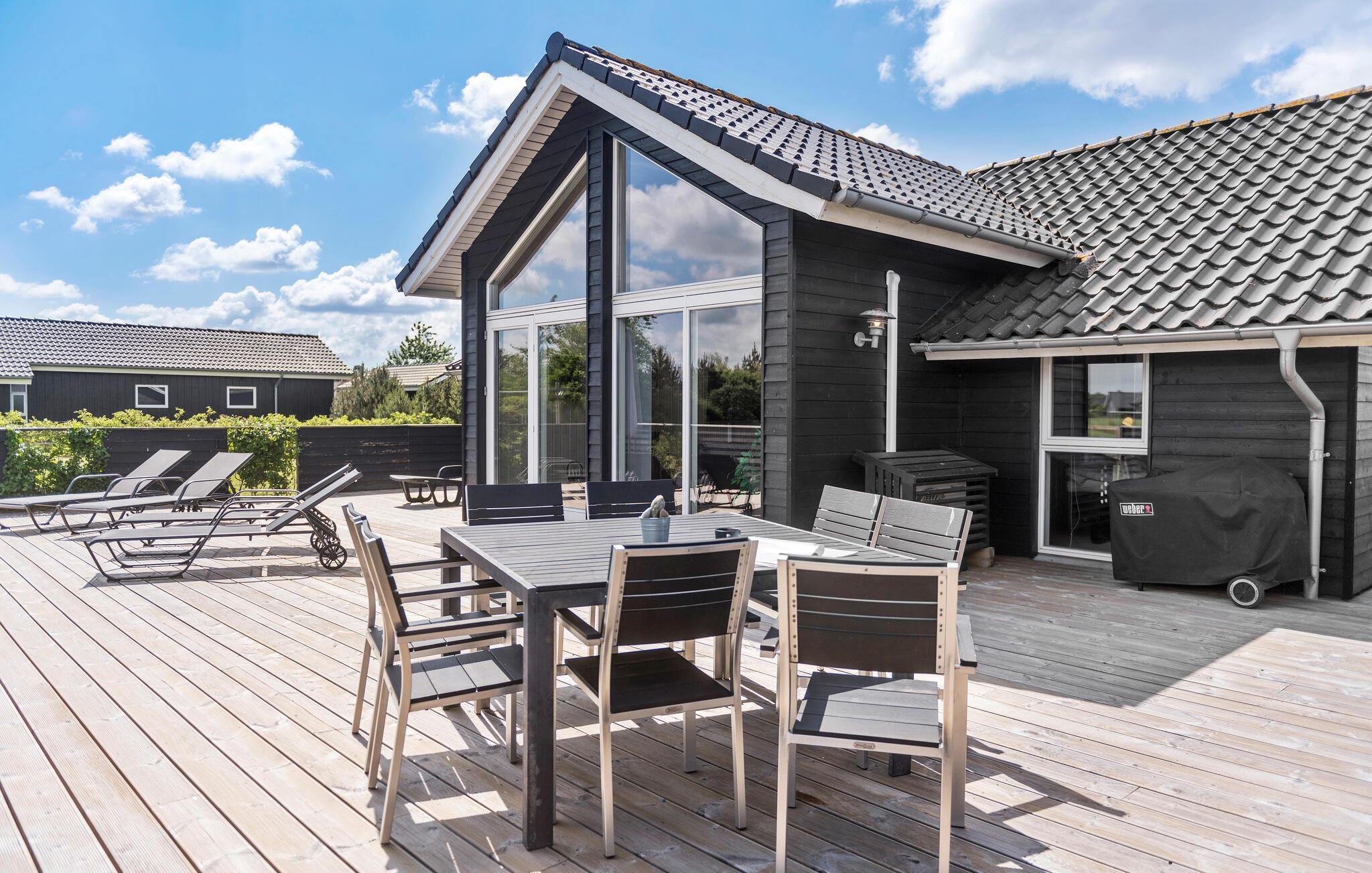 Et særligt kendetegn er den store træterrasse med et hyggeligt, overdækket område, hvor I kan nyde roen, en god kop kaffe og læse en bog uanset vejret. Hvis solen skinner, kan I nyde den i en liggestol med udsigt over den store sø, mens børnene løber rundt og leger i haven og gør saltomortaler på trampolinen. Tilbered en lækker aftensmad på grillen og nyd et godt glas vin under aftensolen, mens I lægger planer for de kommende dage.