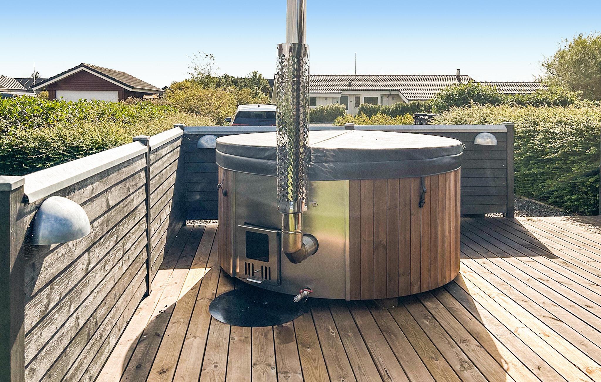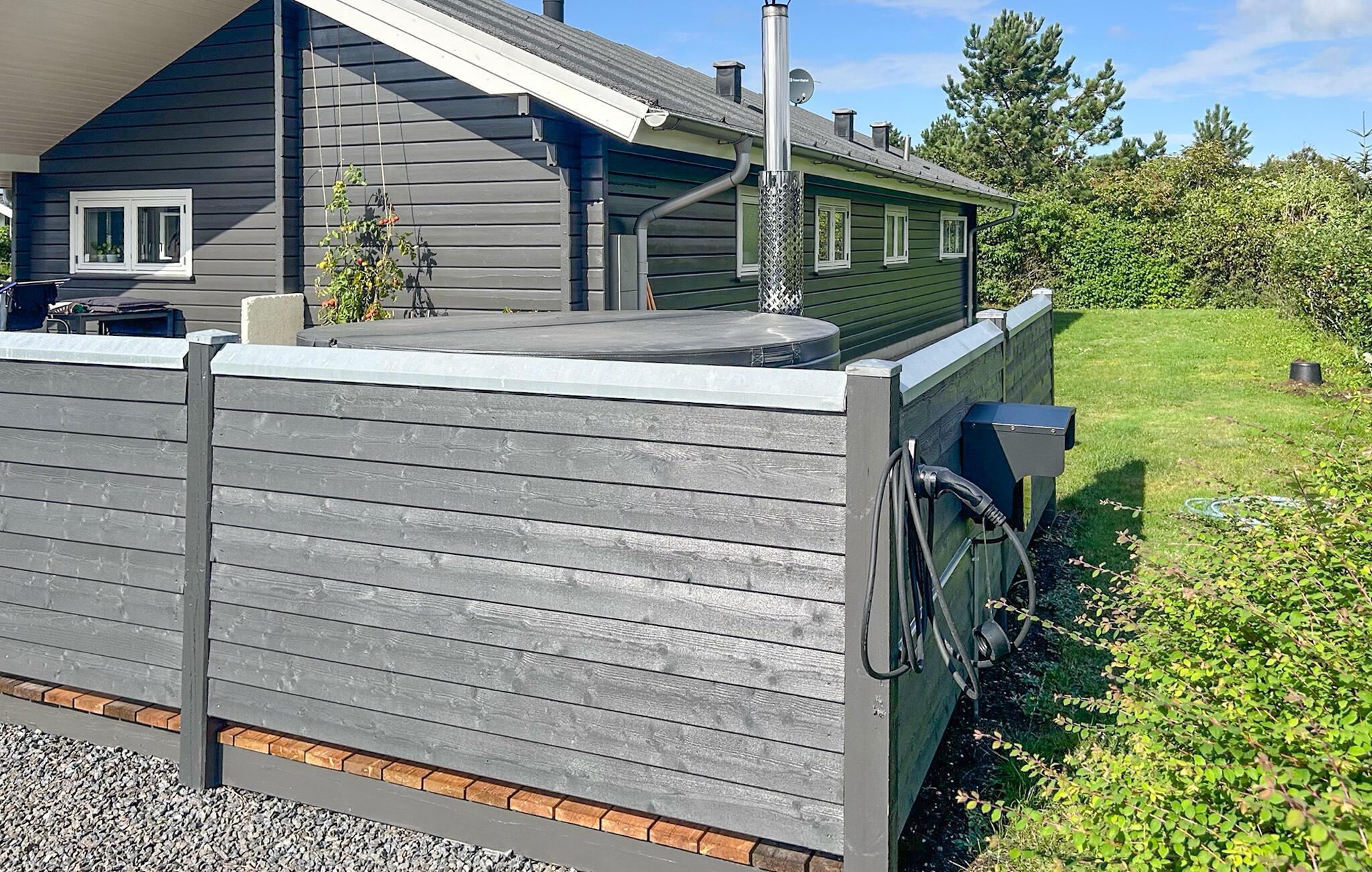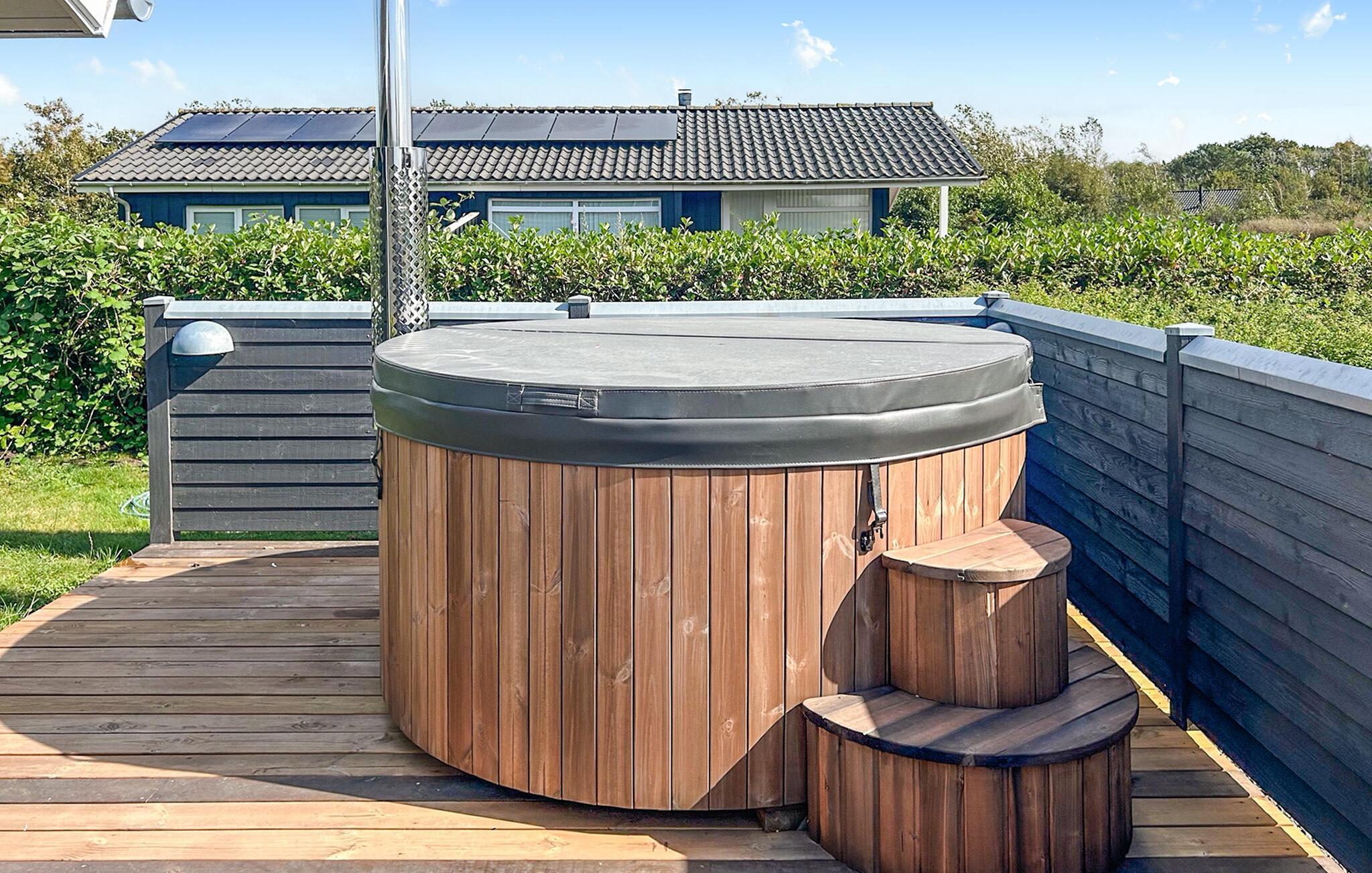 Hyggeligt feriehus nær fjorden med sauna, spabad og stor terrasse til afslapning.