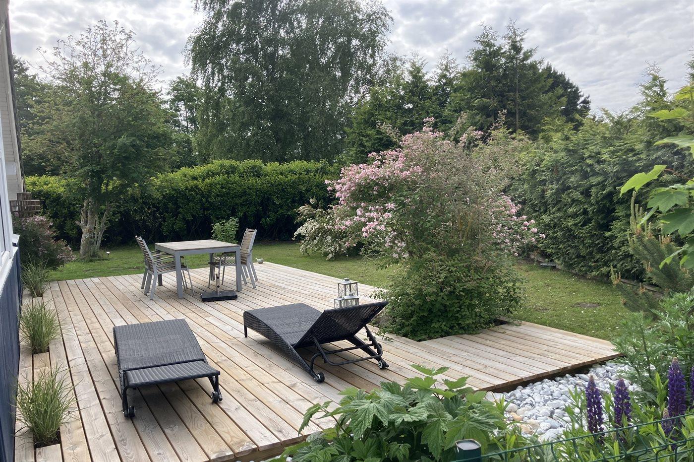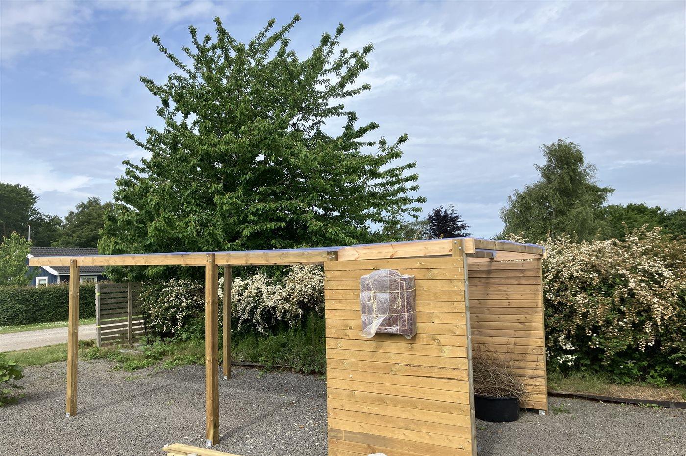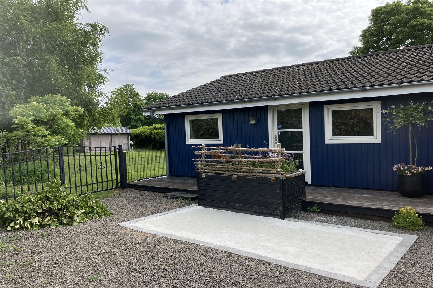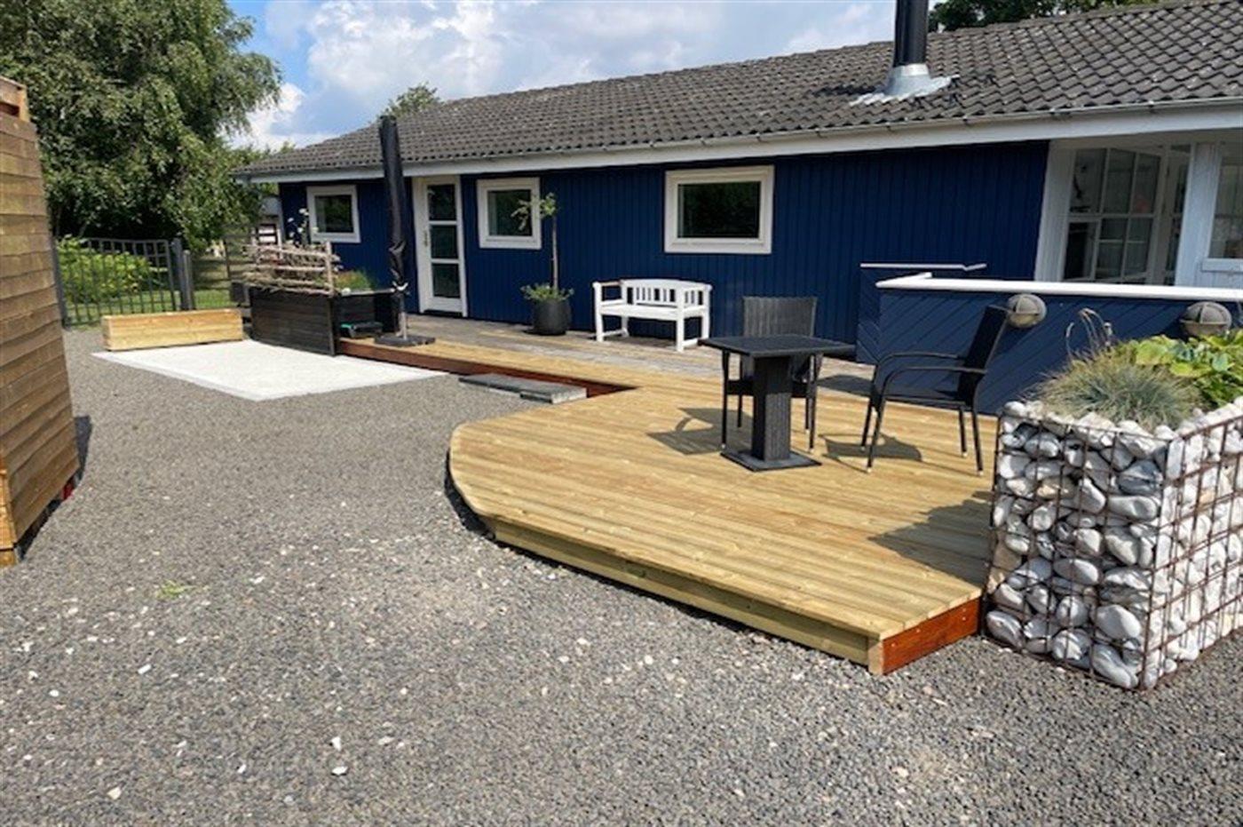 Ferieboligen er beliggende på en 1200 m² stor havegrund. Grunden er indhegnet. Der er 250 m til havet. Der er 250 m til fjorden. Nærmeste forretning er beliggende i en afstand af 4000 m. Desuden er der 22 m² overdækket terrasse. Til ferieboligen hører åbent terrasseareal. Grill til rådighed. Parkering ved ferieboligen.