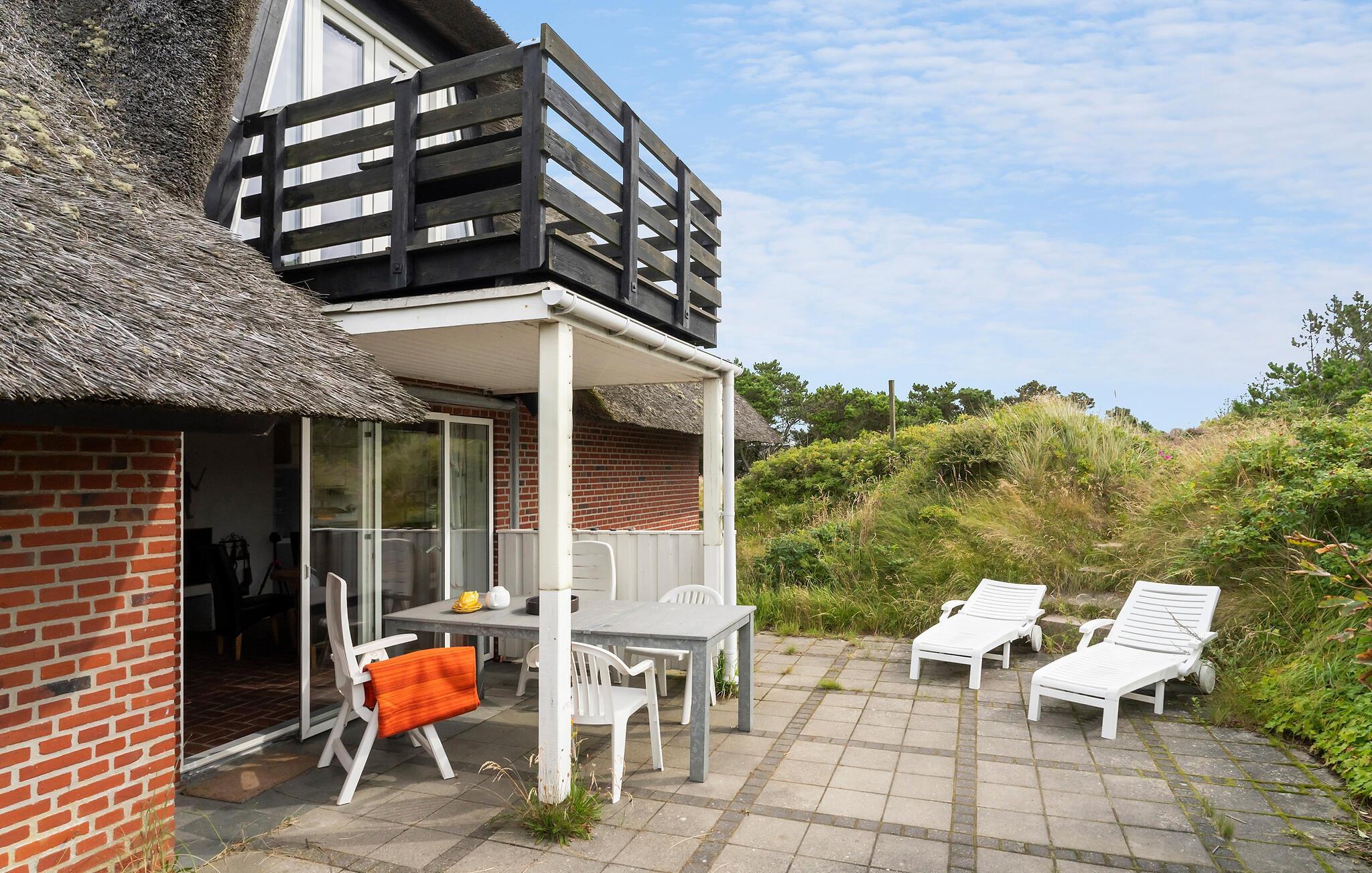 Charmerende stråtækt feriehus med panoramaudsigt over klitter og fjord i Skodbjerge.