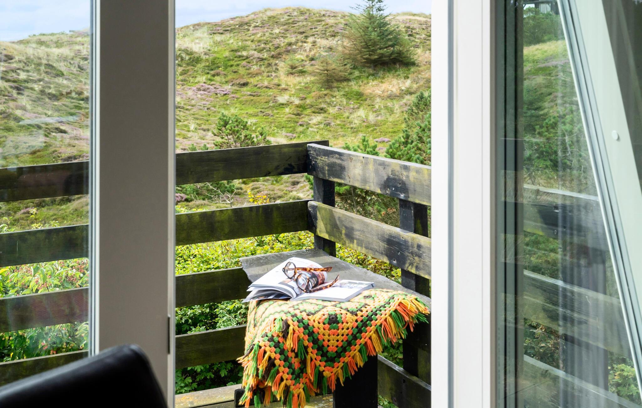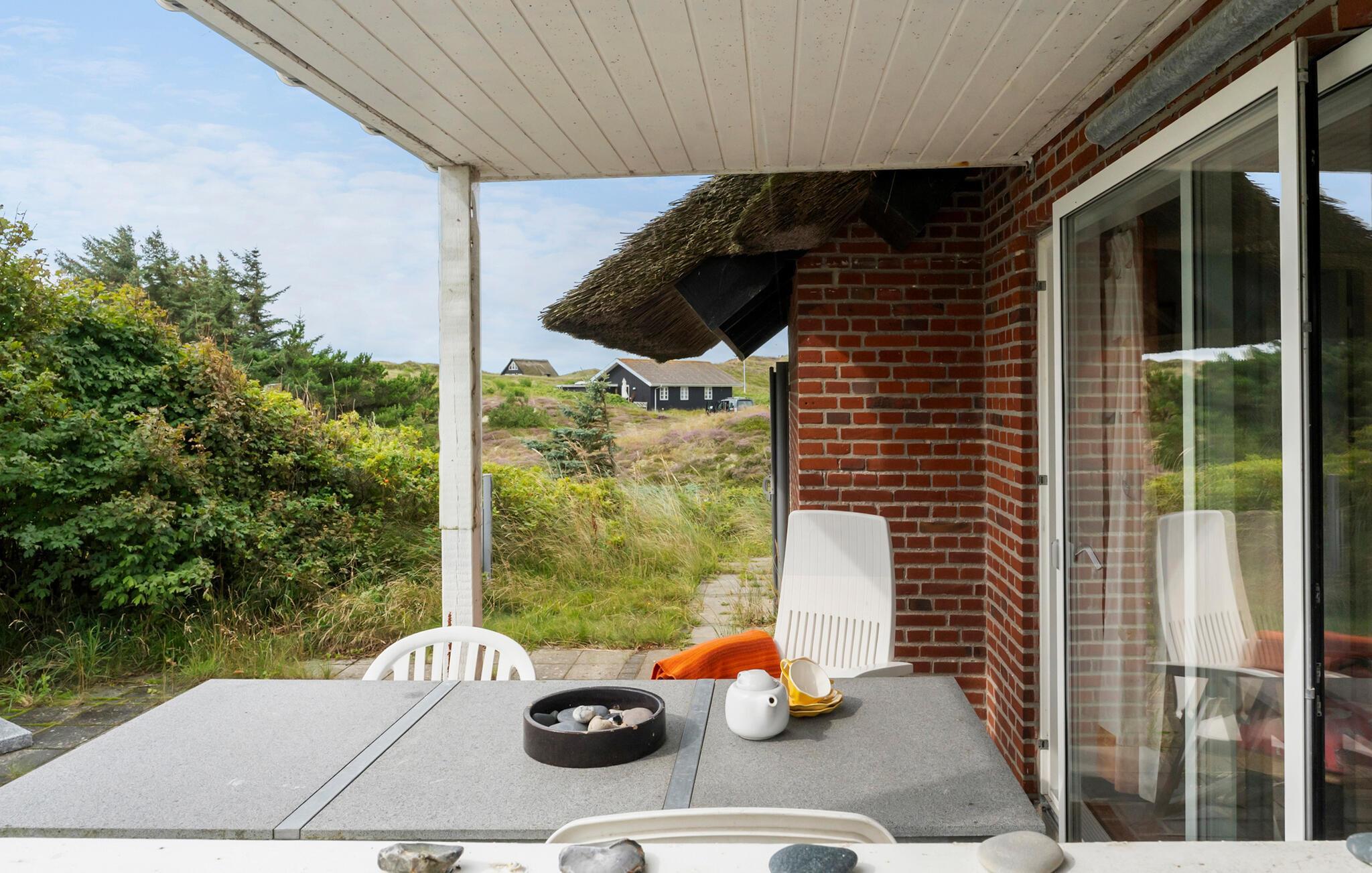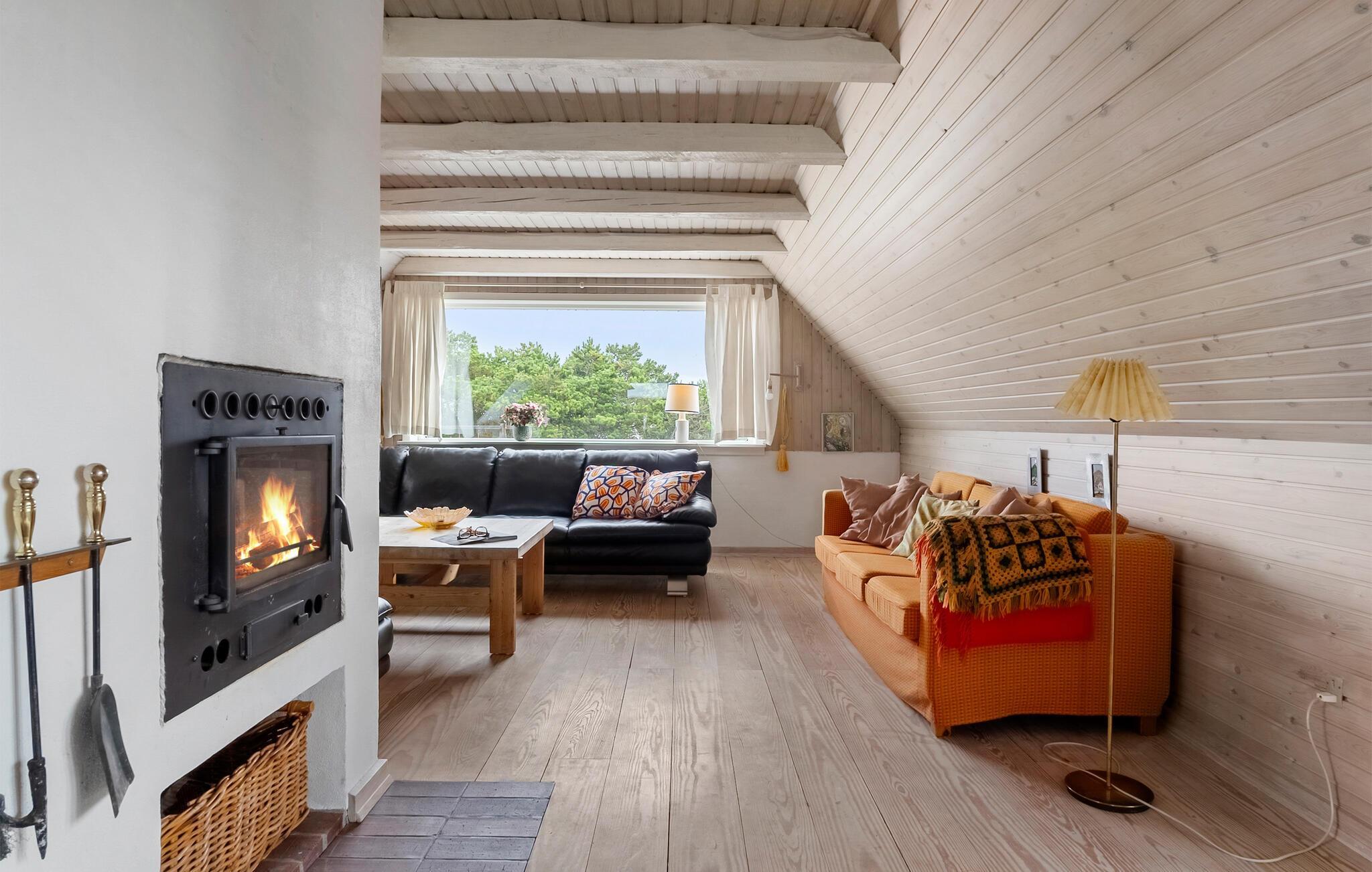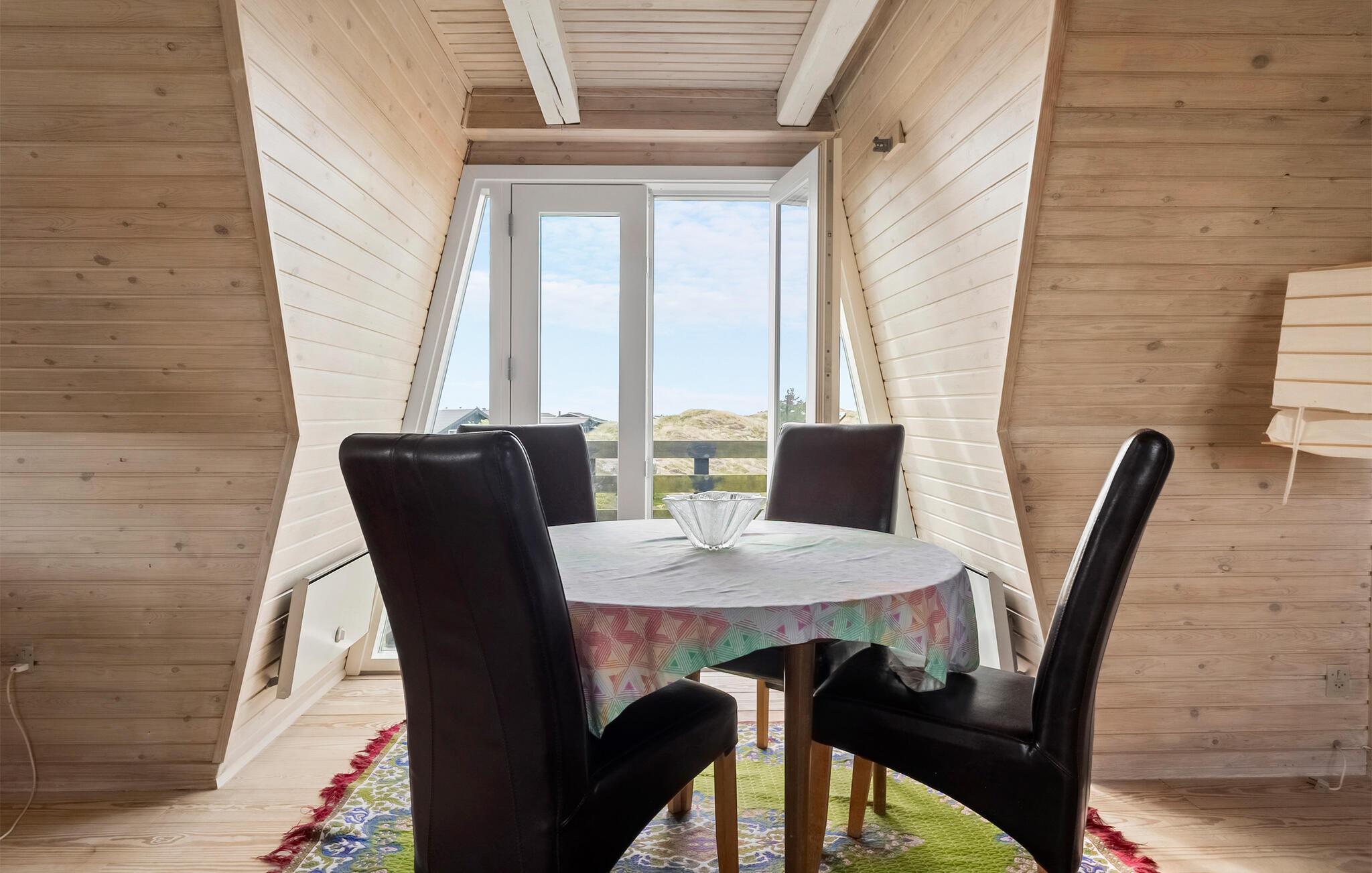 Tilbring en afslappende ferie i jeres indbydende feriehus, der på harmonisk vis kombinerer natur, ro og atmosfære. Huset byder på en betagende udsigt over det omkringliggende landskab og den nærliggende Ringkøbing Fjord. Hyg jer sammen ovenpå, hvor to komfortable sofaer med udsigt over de grønne områder venter på jer. Slap af foran fjernsynet, læs en god bog, eller nyd blot udsigten gennem panoramavinduet. Den lyse, åbne opholdsstue i stueetagen med pejs og spiseplads inviterer jer til at tilbringe tid sammen. Køkkenet er praktisk udstyret og byder på udsigt over klitterne.