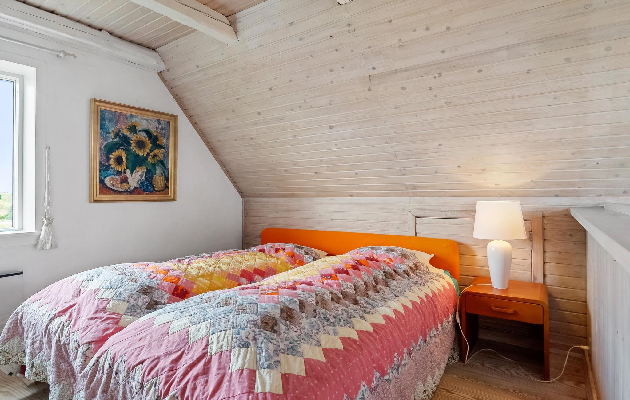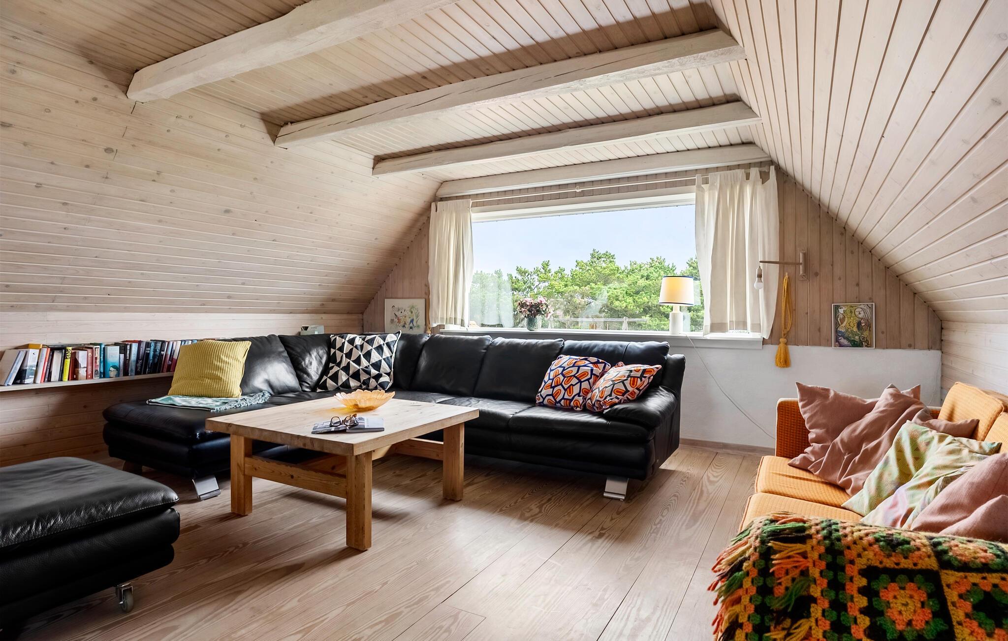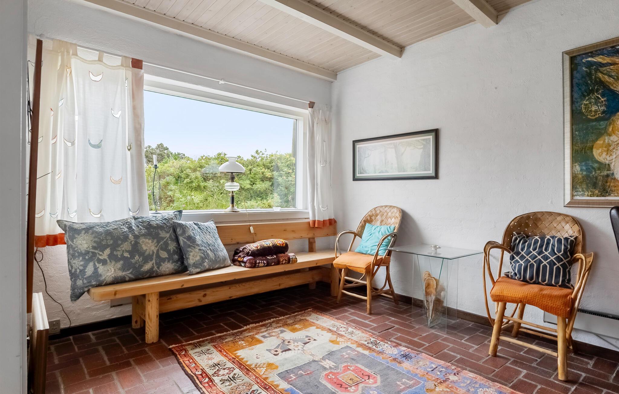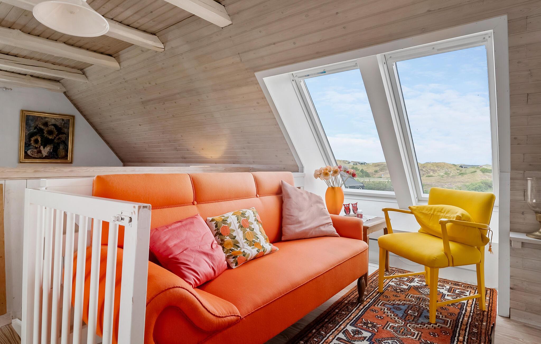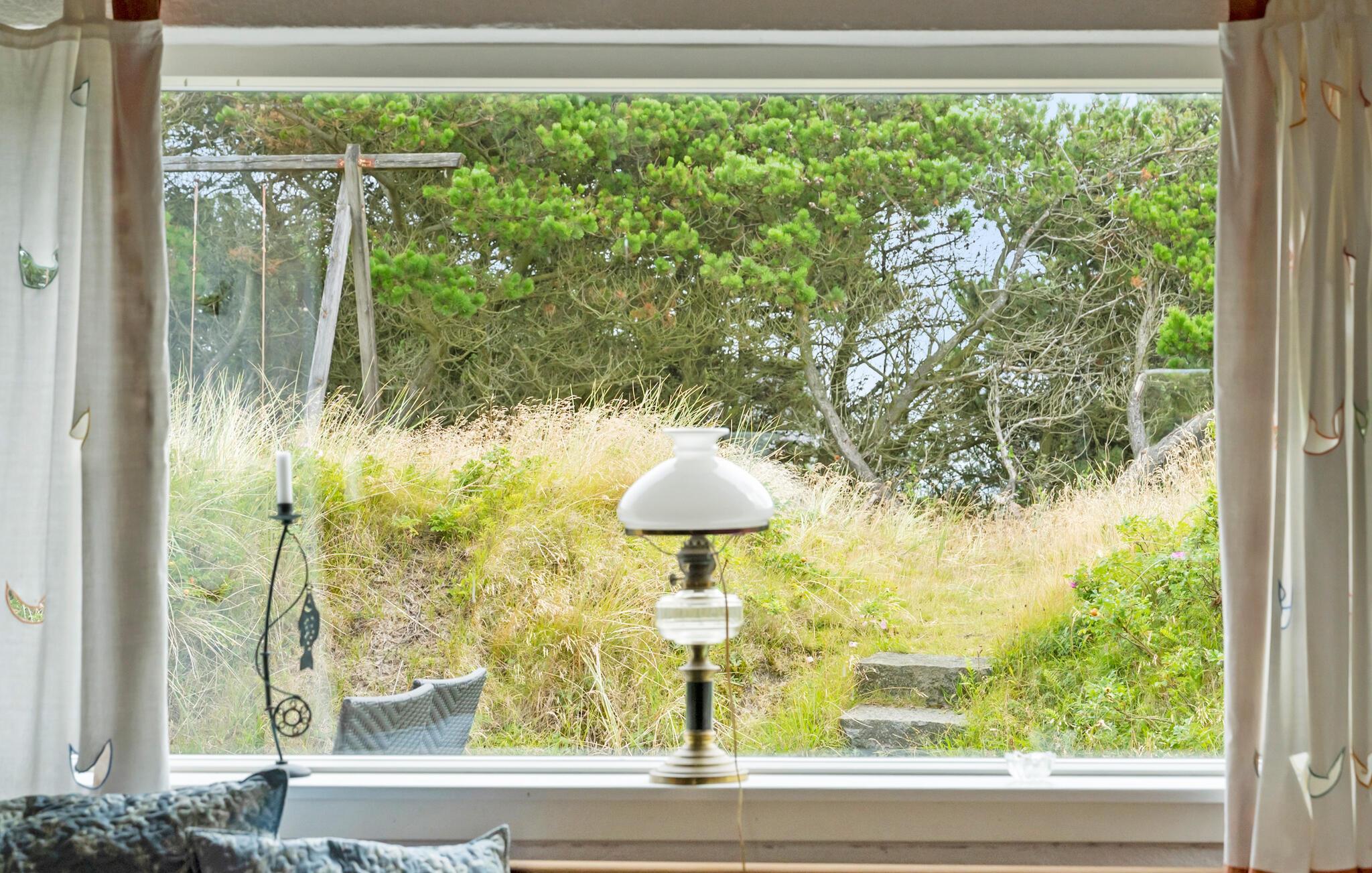 Tilbring en afslappende ferie i jeres indbydende feriehus, der på harmonisk vis kombinerer natur, ro og atmosfære. Huset byder på en betagende udsigt over det omkringliggende landskab og den nærliggende Ringkøbing Fjord. Hyg jer sammen ovenpå, hvor to komfortable sofaer med udsigt over de grønne områder venter på jer. Slap af foran fjernsynet, læs en god bog, eller nyd blot udsigten gennem panoramavinduet. Den lyse, åbne opholdsstue i stueetagen med pejs og spiseplads inviterer jer til at tilbringe tid sammen. Køkkenet er praktisk udstyret og byder på udsigt over klitterne.
