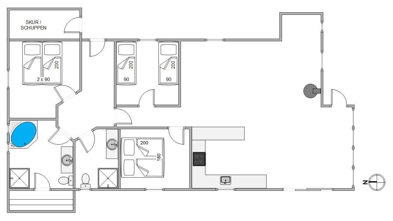 De 3 rummelige soverum, hvoraf det ene har en dobbeltseng, og de 2 andre hver indeholder 2 enkeltsenge, har komfortable sengepladser til op til 6 personer. I finder 2 badeværelser med gulvvarme, og i forbindelse med det store badeværelse er også spabad og sauna, så I kan nyde lidt ekstra wellness efter en begivenhedsrig dag. Den energibesparende luft-til-luft varmepumpe giver et behageligt indeklima året rundt. Der er også ladestik til el-bilen til rådighed, hvilket er praktisk for feriegæster med elbil.