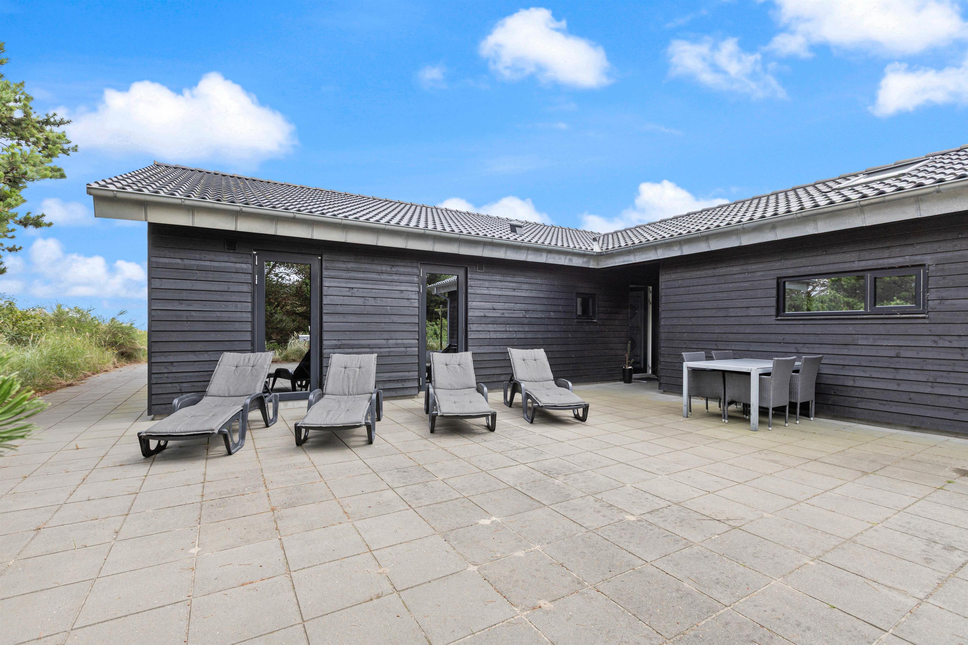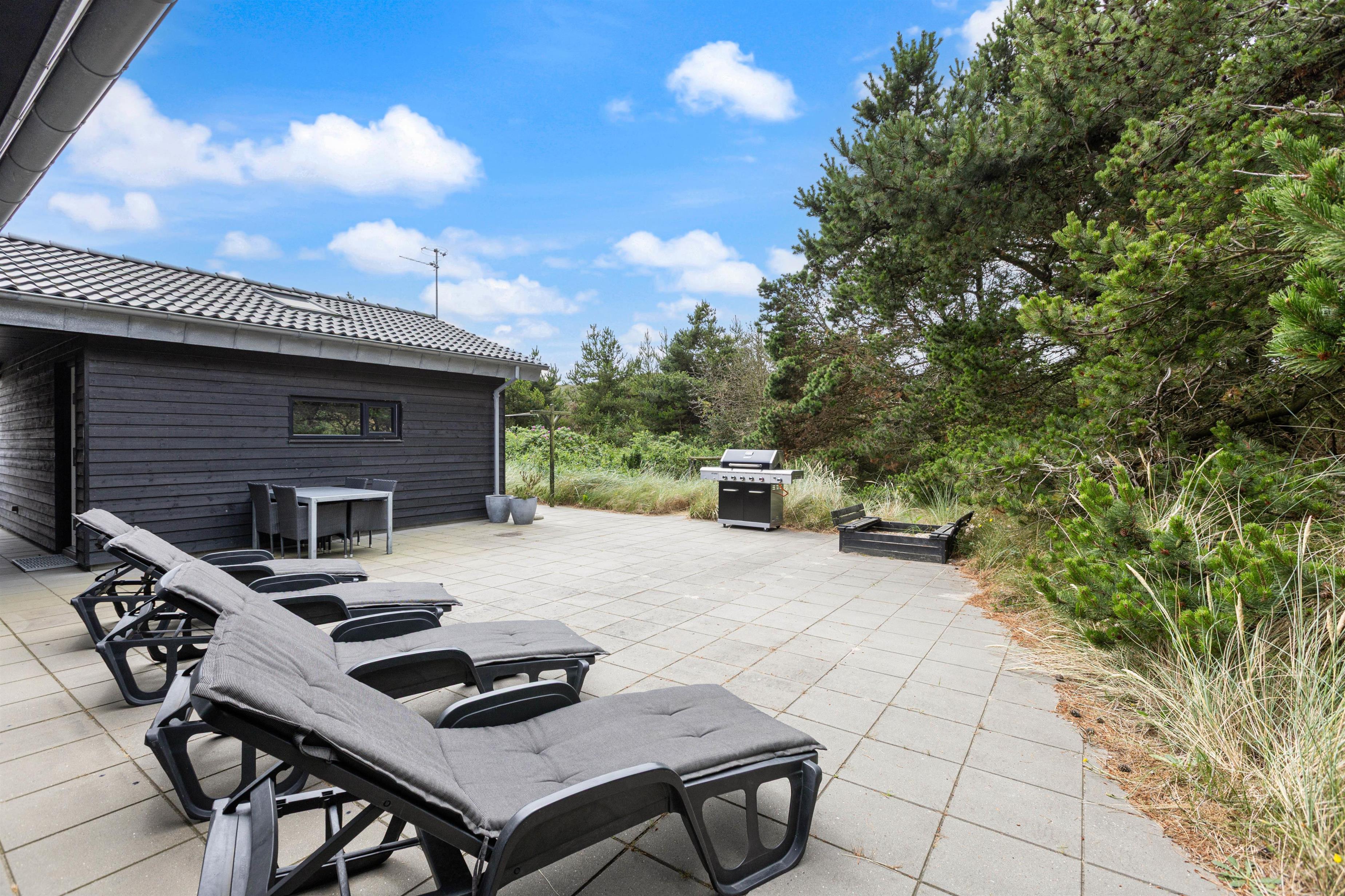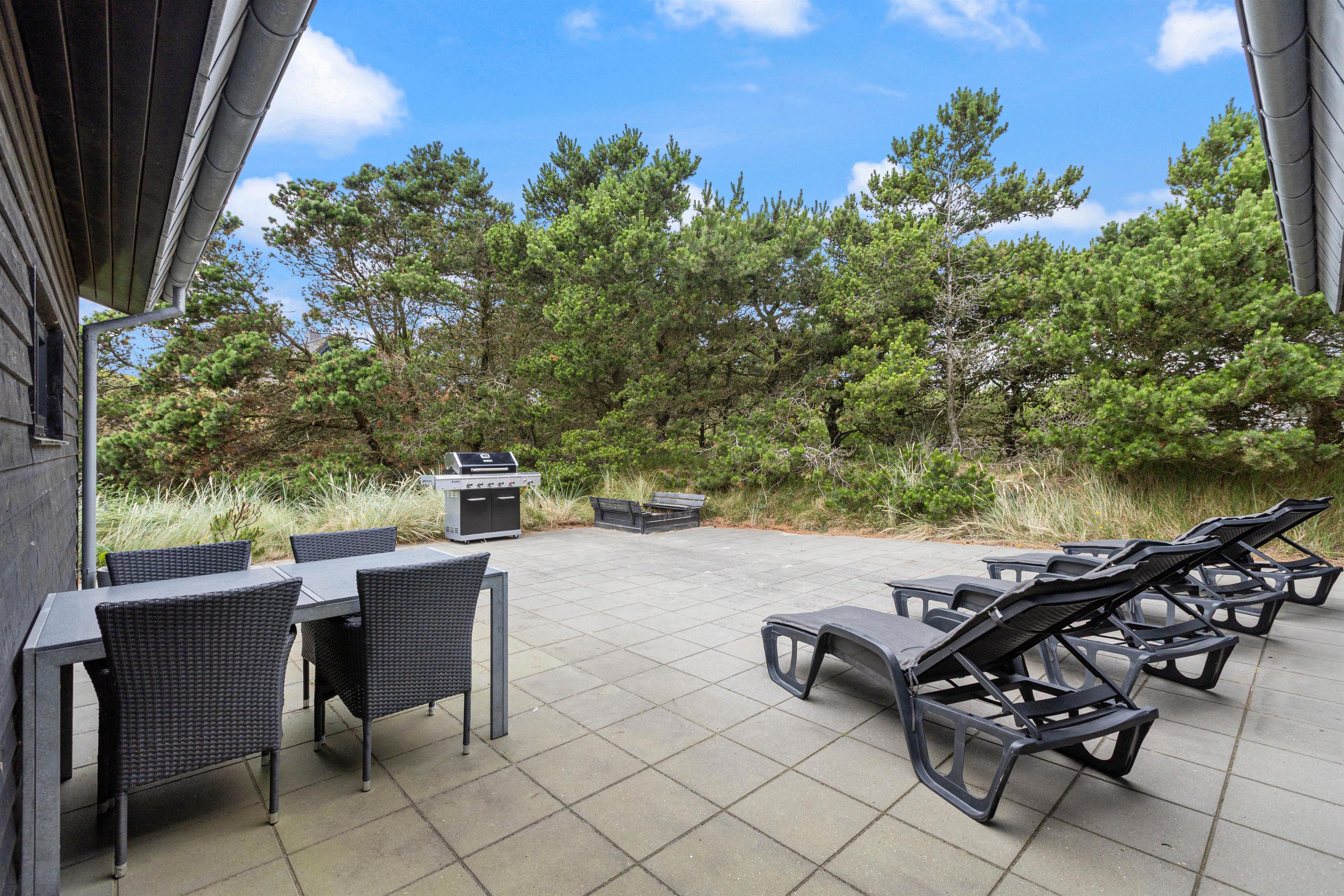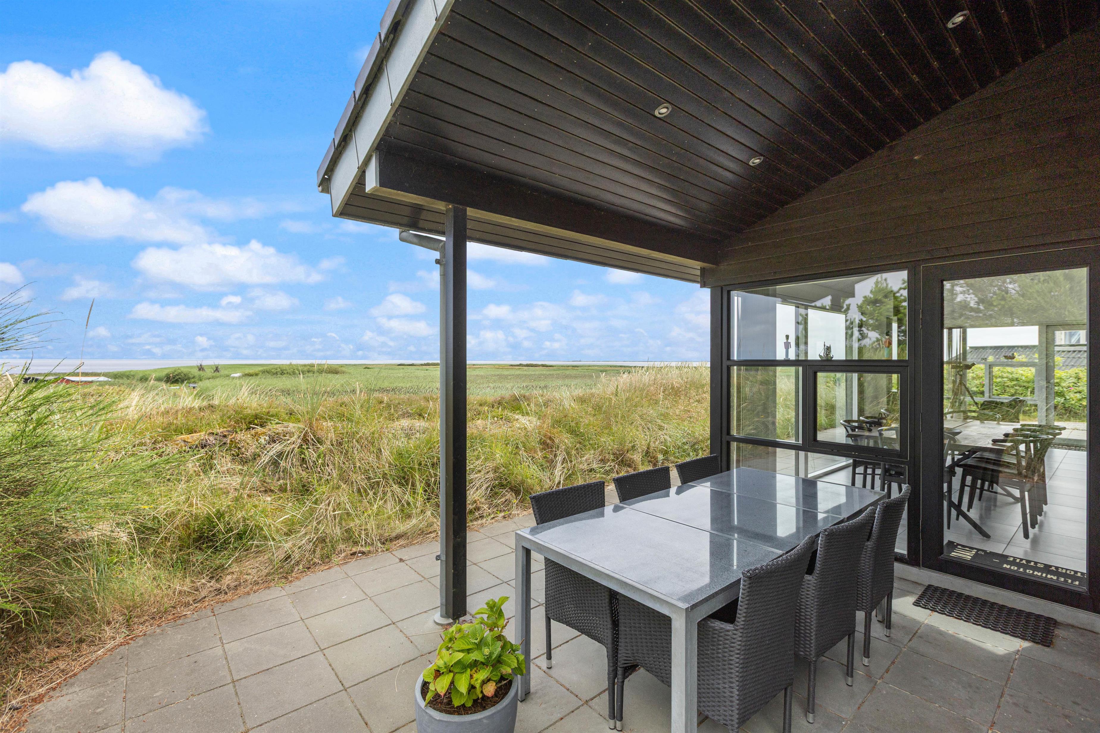 Feriehusets beliggenhed er helt unik, og I får en enestående panoramaudsigt til Ringkøbing Fjord fra stuen såvel som fra den store terrasse, der løber hele vejen rundt om huset. Her får I både en overdækket og åben del, som er godt afskærmet af grantræerne og gør de gode terrassedage helt ugenerede.
