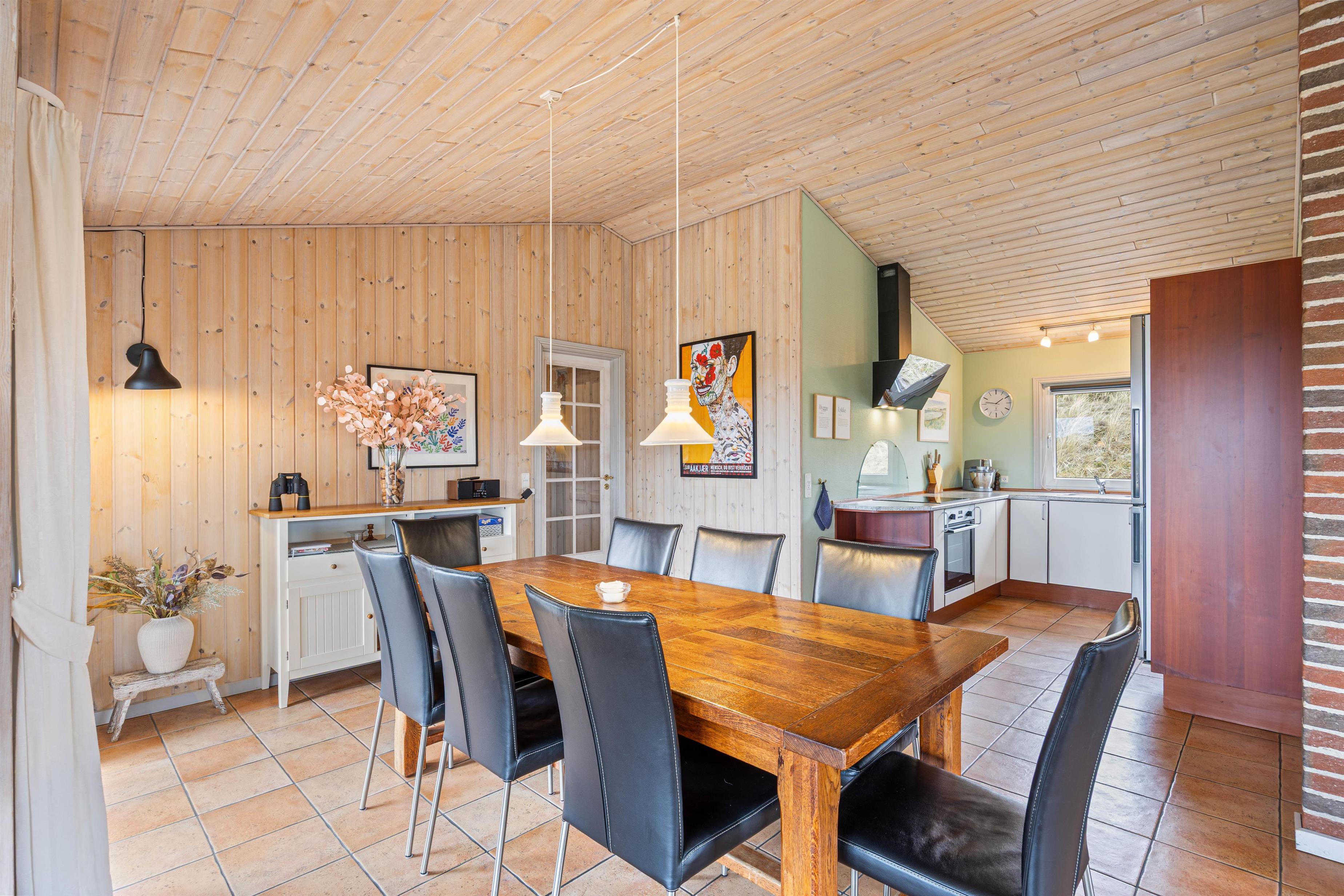 Saml jer omkring spisebordet til en lækker brunch og planlæg feriens program. Her i sommerhusets hjerterum kan I tilbringe utallige hyggelige timer sammen. Her er også loft til kip og de store vinduespartier mod syd trækker naturen med helt i og lukker en masse dagslys ind. Sæt jer godt til rette i hjørnesofaen med kortspil, til filmhygge eller læs krimien i de behagelige lænestole – samtidig med der bliver lavet aftensmad i det åbne køkken. For at holde rummet varmt, kan I benytte jer af den energibesparende varmepumpe eller tænde op i den hyggelige brændeovn.