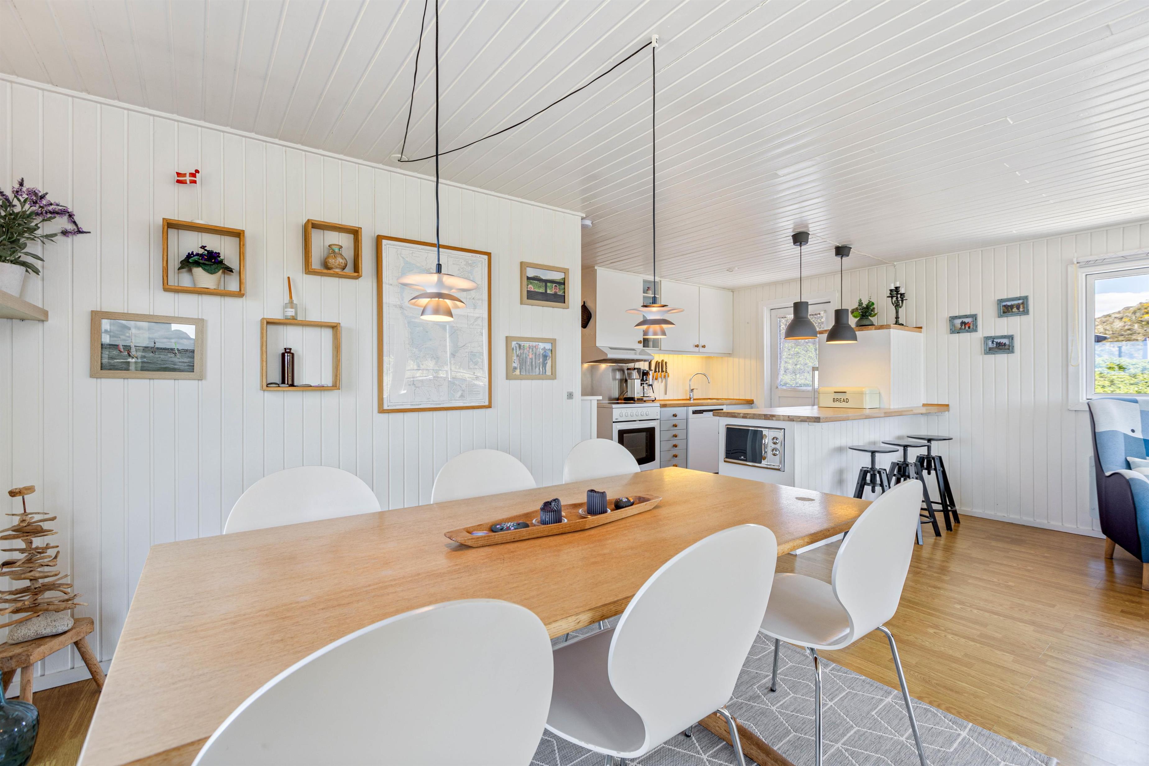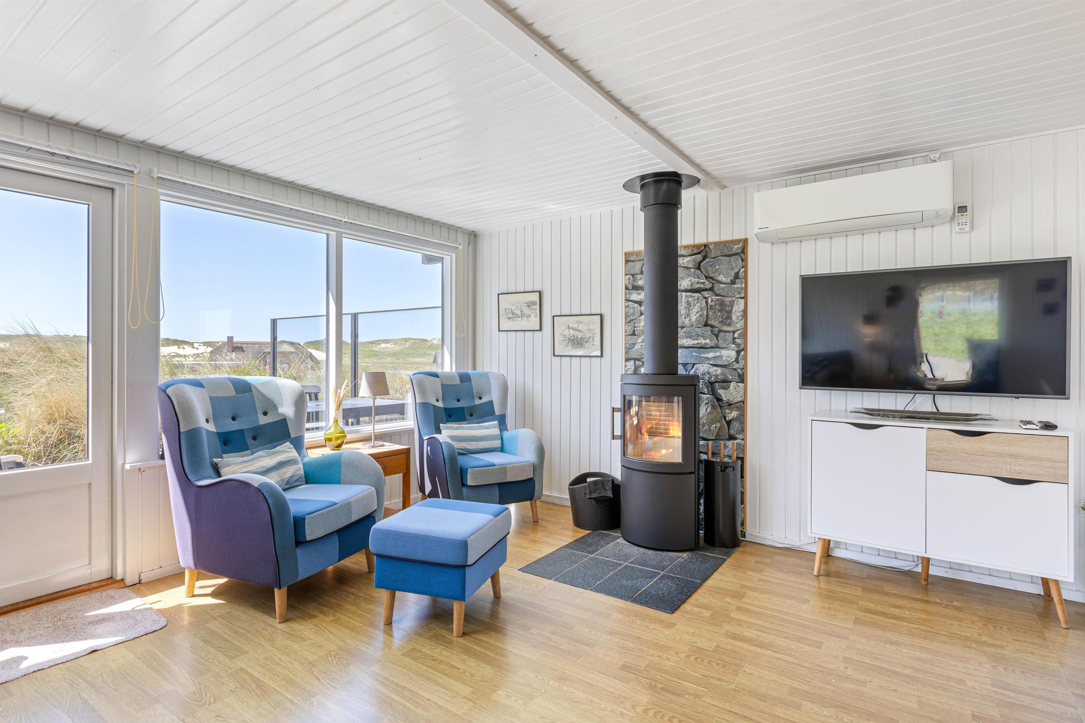 Når du træder indenfor i feriehuset, vil du straks mærke hyggen og varmen fra brændeovnen i opholdsområdet. Brændeovnen er sammen med luft-til-luft varmepumpen med til at sikre en komfortabel temperatur og indbydende atmosfære året rundt. Det store vinduesparti mod sydvest skaber et godt lysindfald til rummet og giver samtidig en fin udsigt til det omkringliggende område.