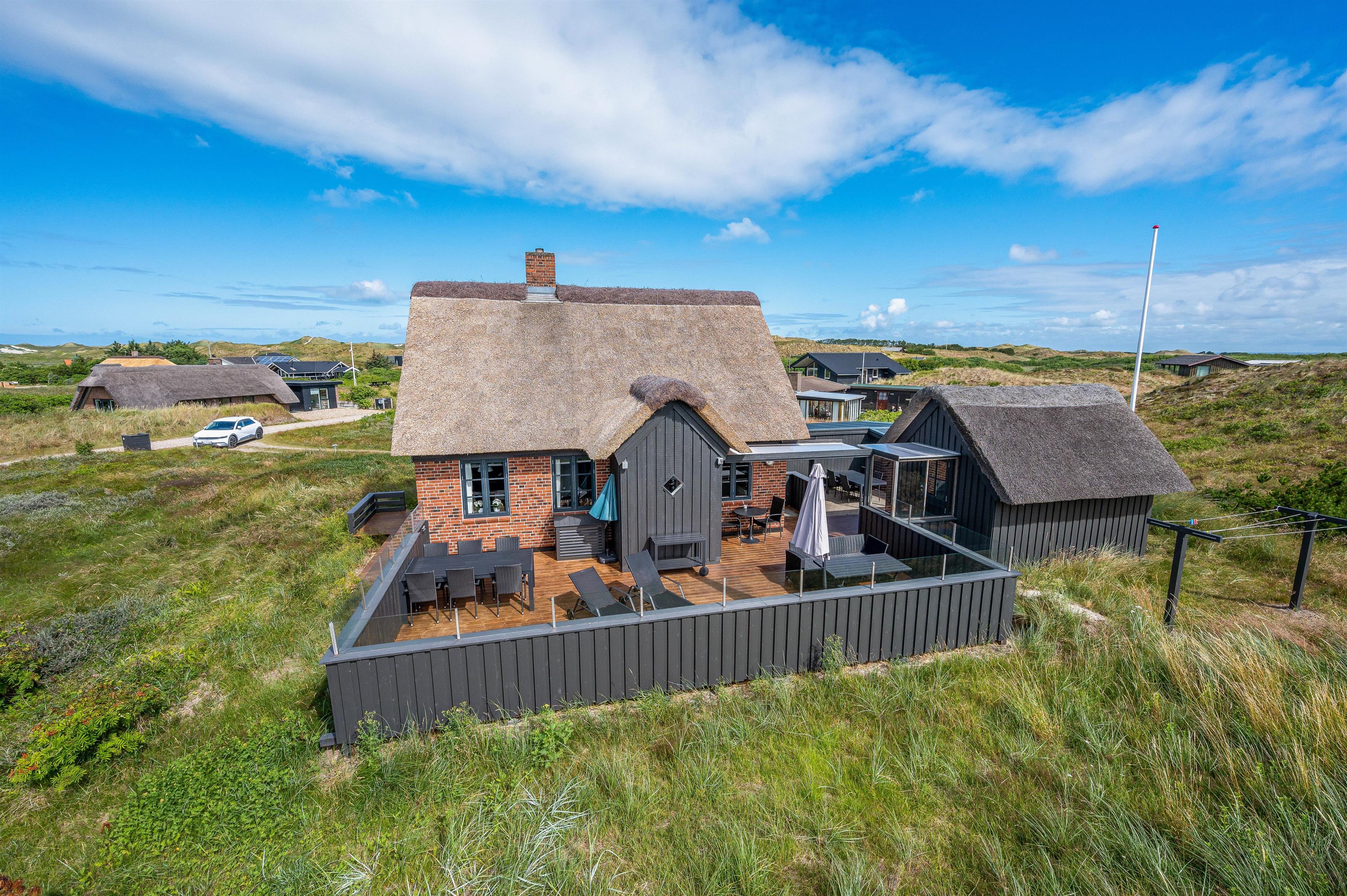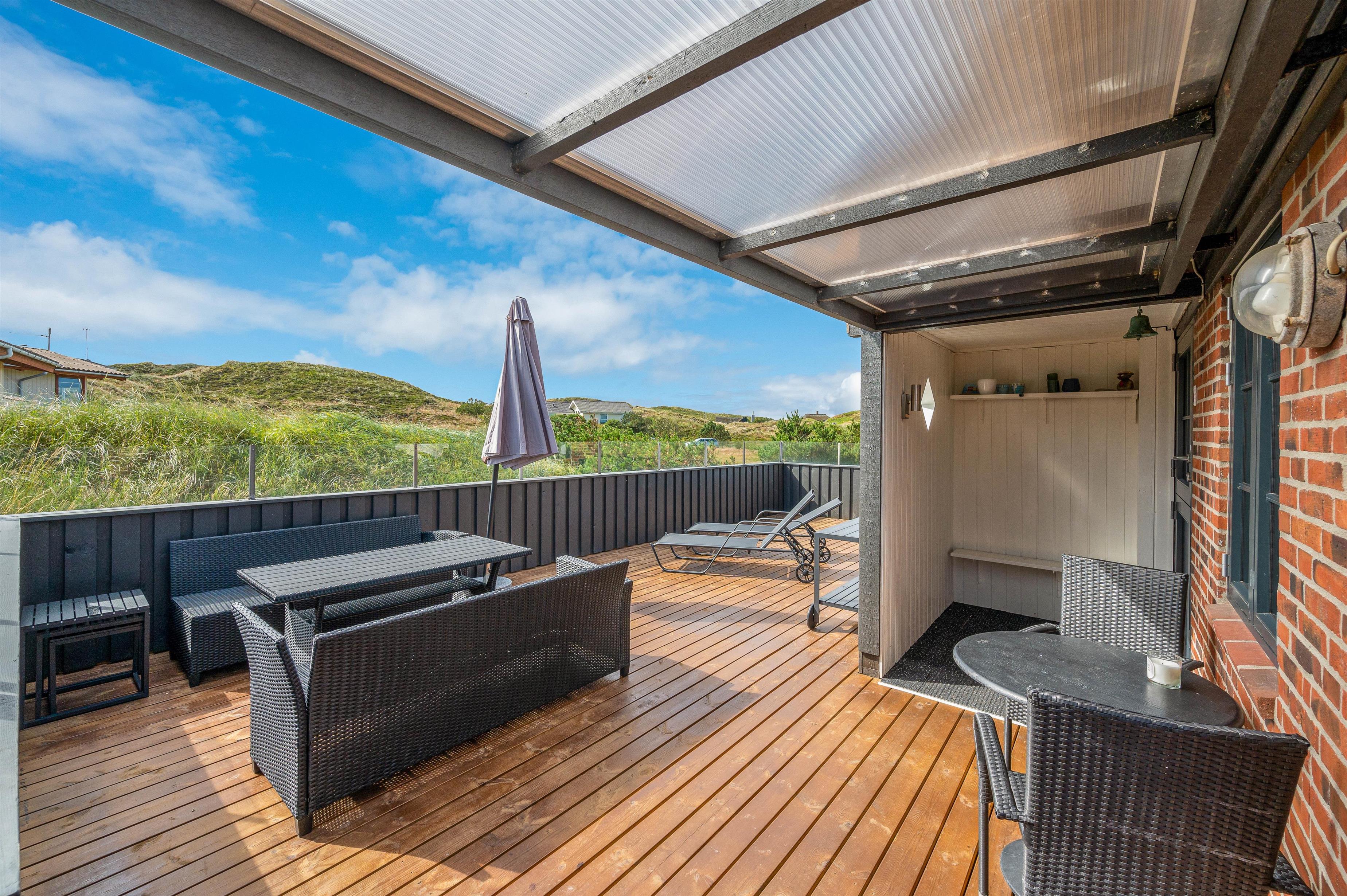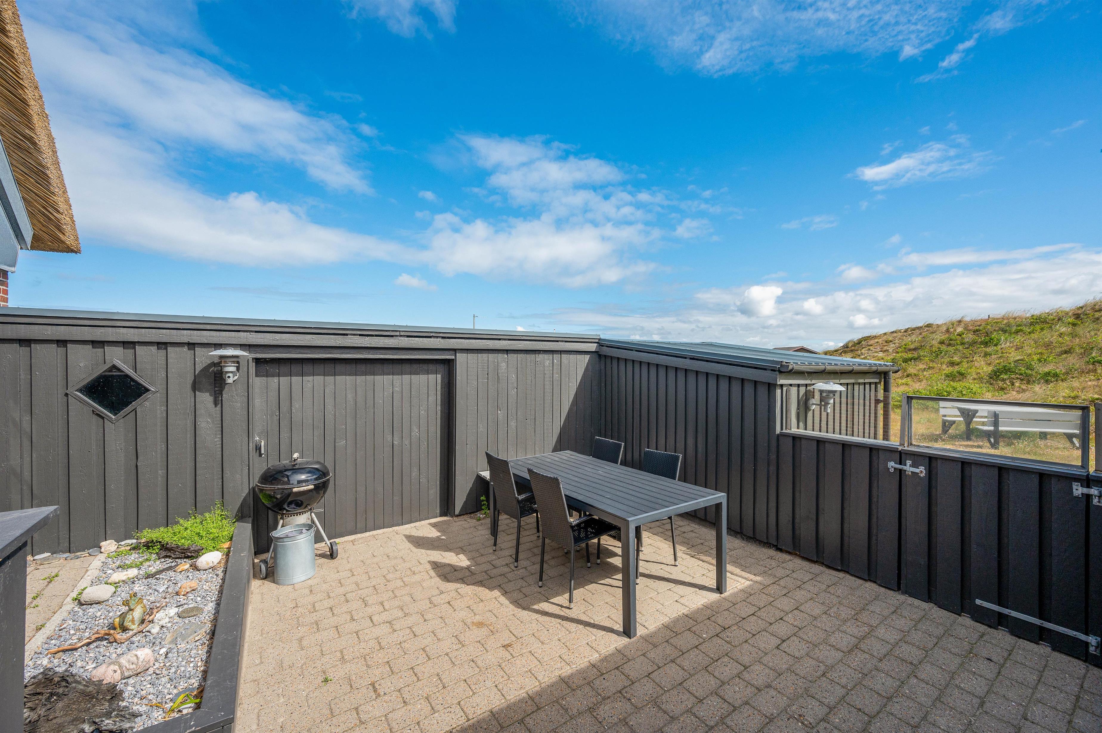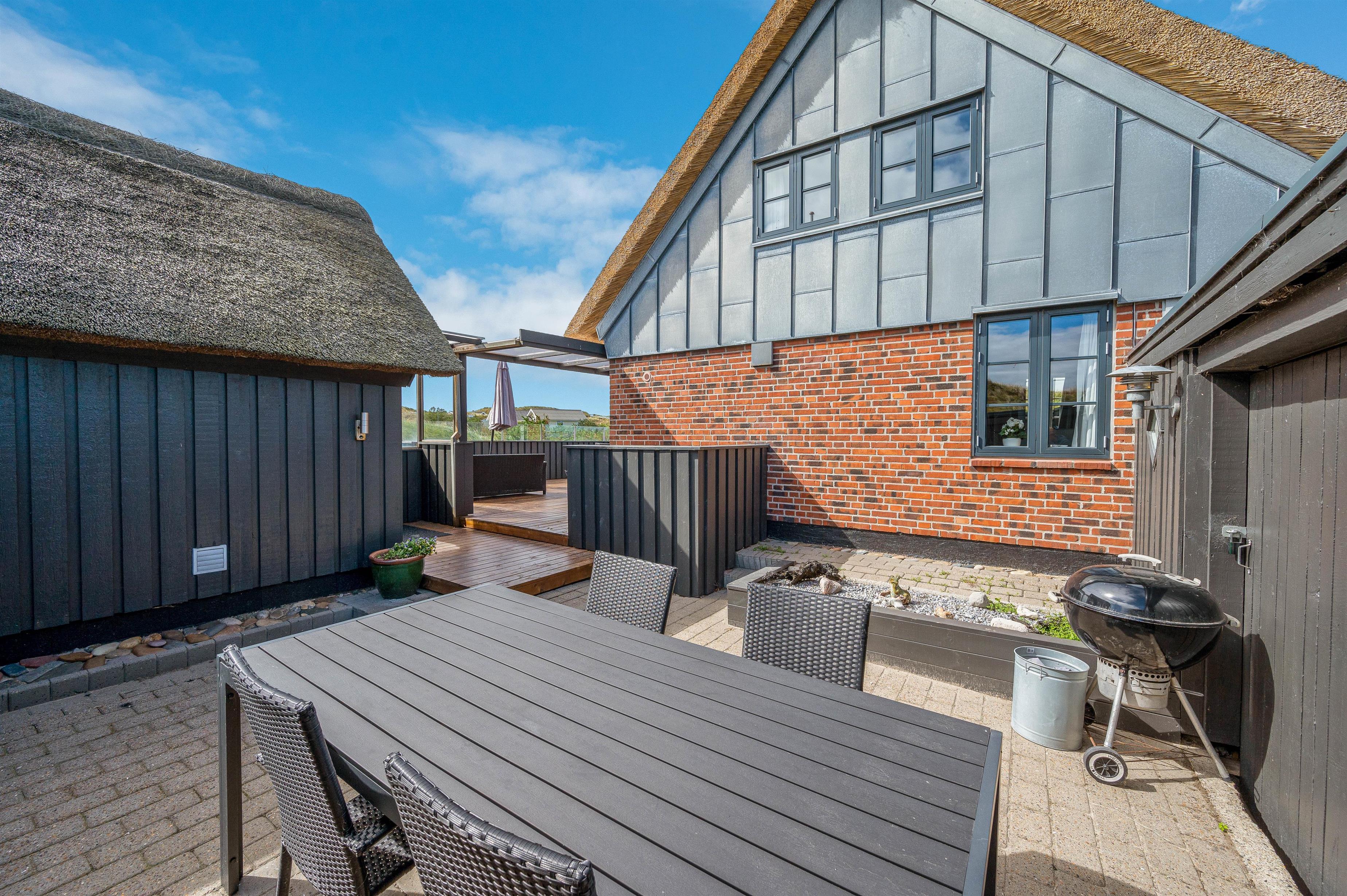 Her på Skodbovej 25 er der mange hyggekroge rundt om feriehuset. Mod øst imellem bygningerne finder I en dejlig lukket terrasse, perfekt til morgenkaffen, hvor I kan se solen stå op over Ringkøbing Fjord. Mod sydvest er der yderlig en helt lukket terrasse, hvor I kan nyde eftermiddagssolen fra liggestolene, mens børn og hunde leger. Slut dagen af med en veltilberedt grillmiddag i aftensolens skær.